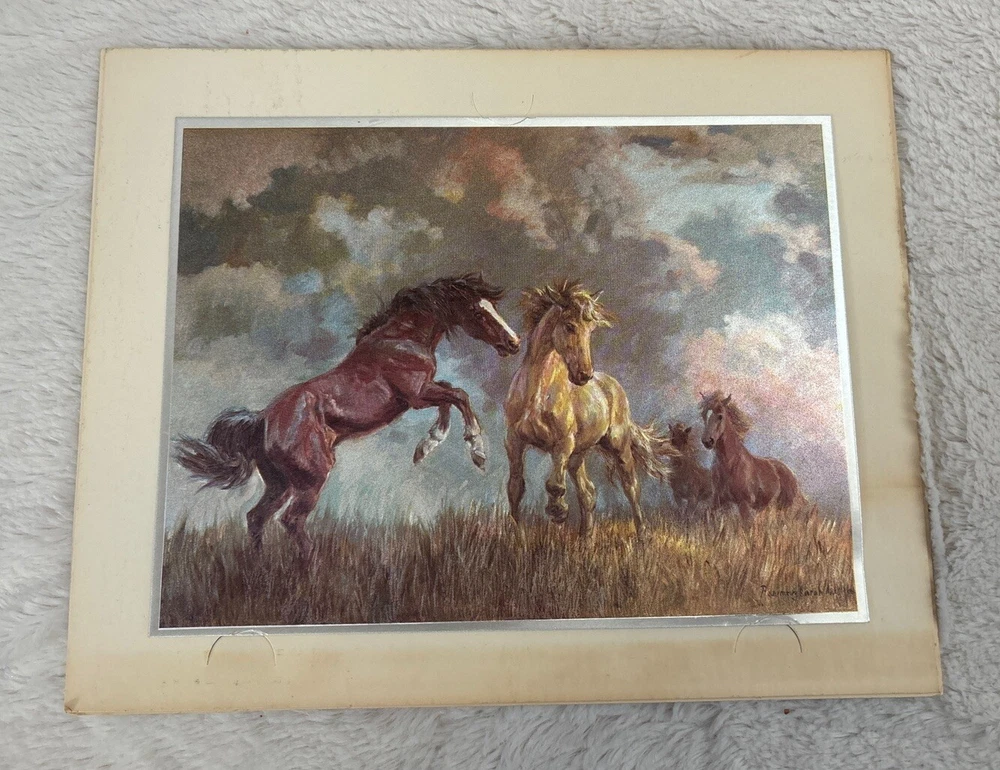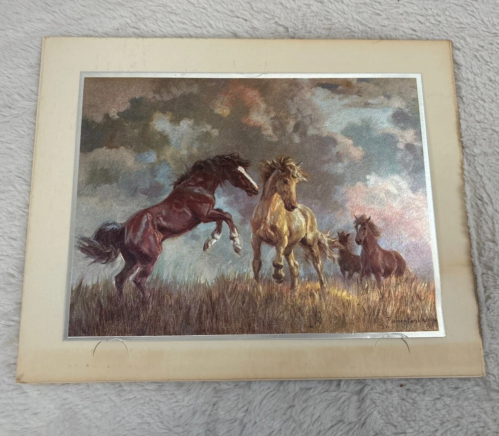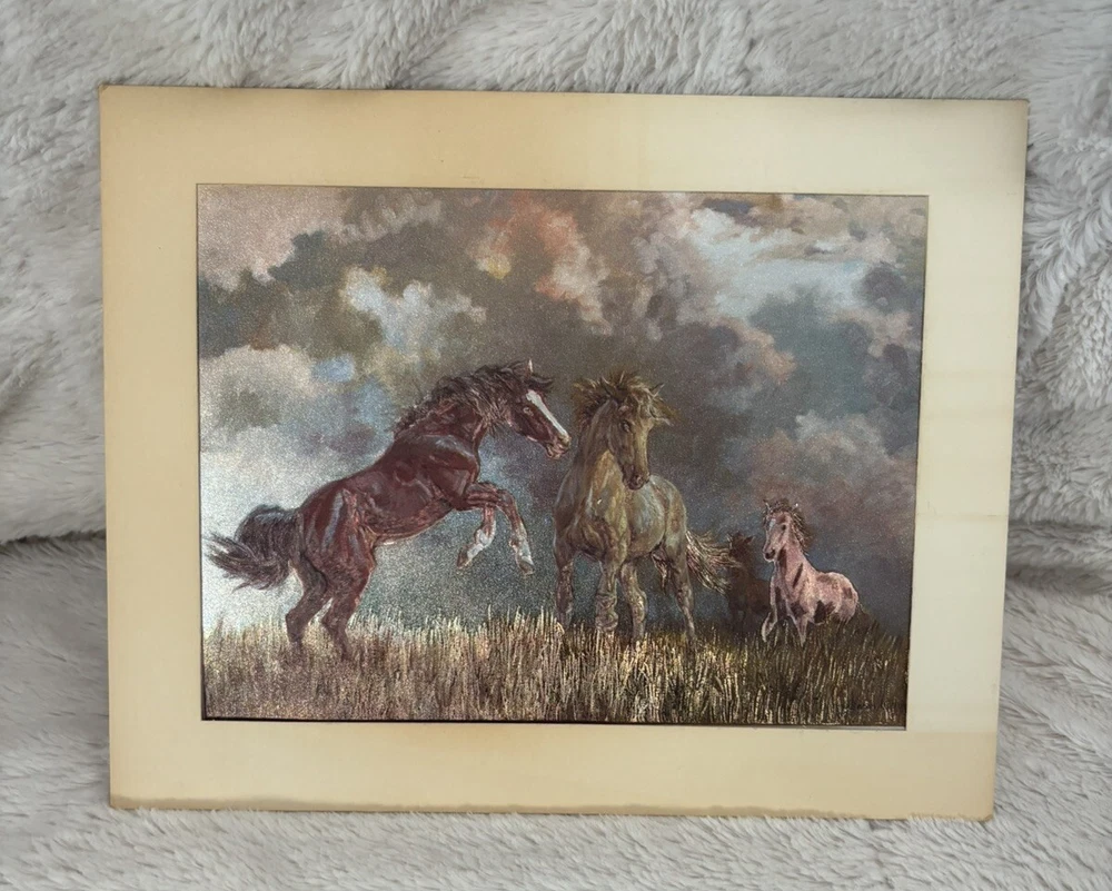 This stunning print by Rosemary Sarah Welch showcases the grace and beauty of equestrian life. The captivating image features a group of horses in a field, captured using the unique foil print technique. This piece is signed by the artist and is sure to add sophistication to any art collection. With its unframed design, this print allows for versatile display options to suit any decor. The theme of this artwork is centered around the world of horses and equestrian culture, making it a perfect addition to any collection with similar subject matter. Add this exquisite print to your collection today. See enclosed photos. From the matte there are a few marks on edge of print