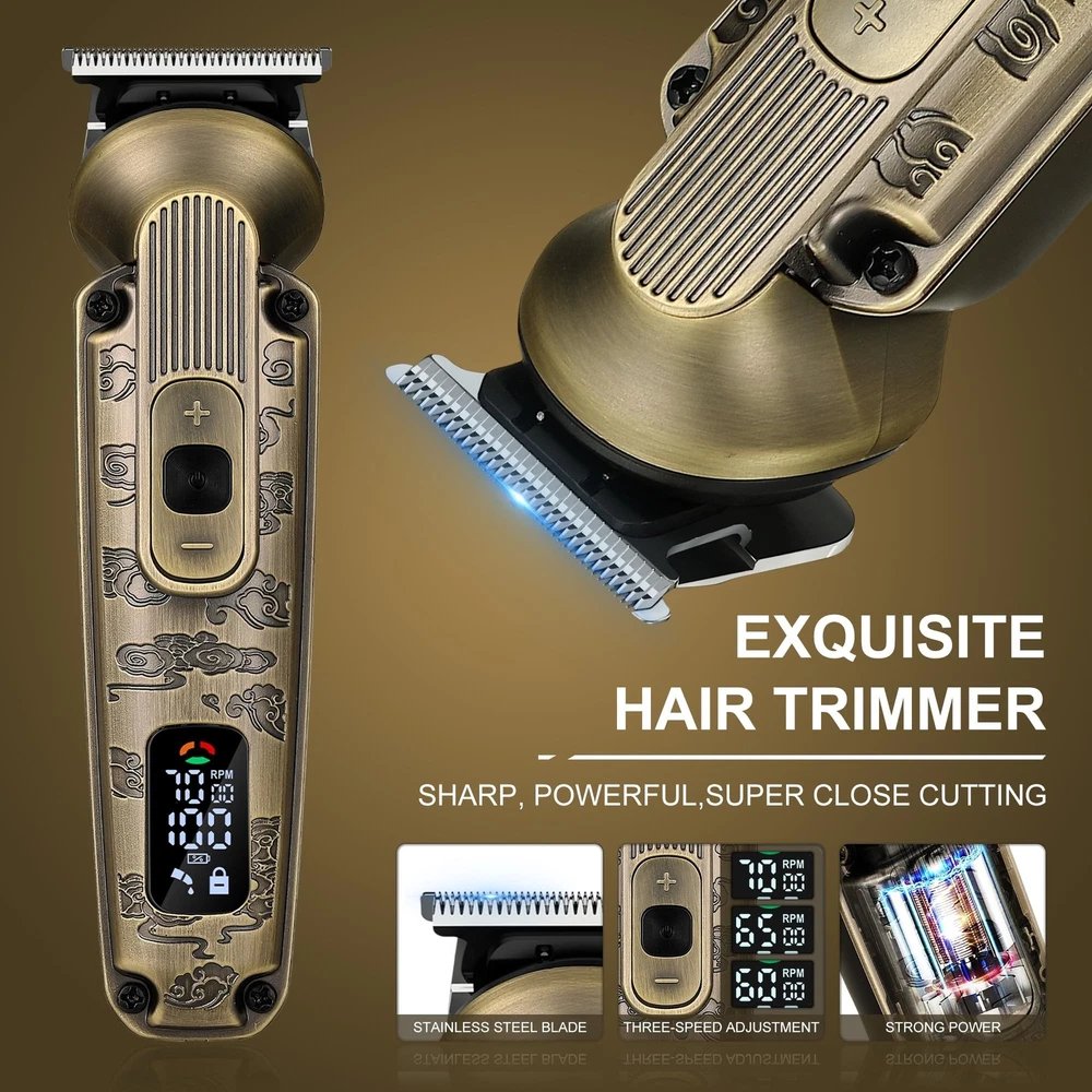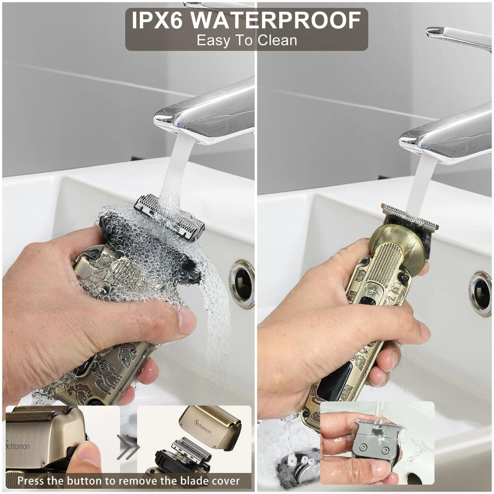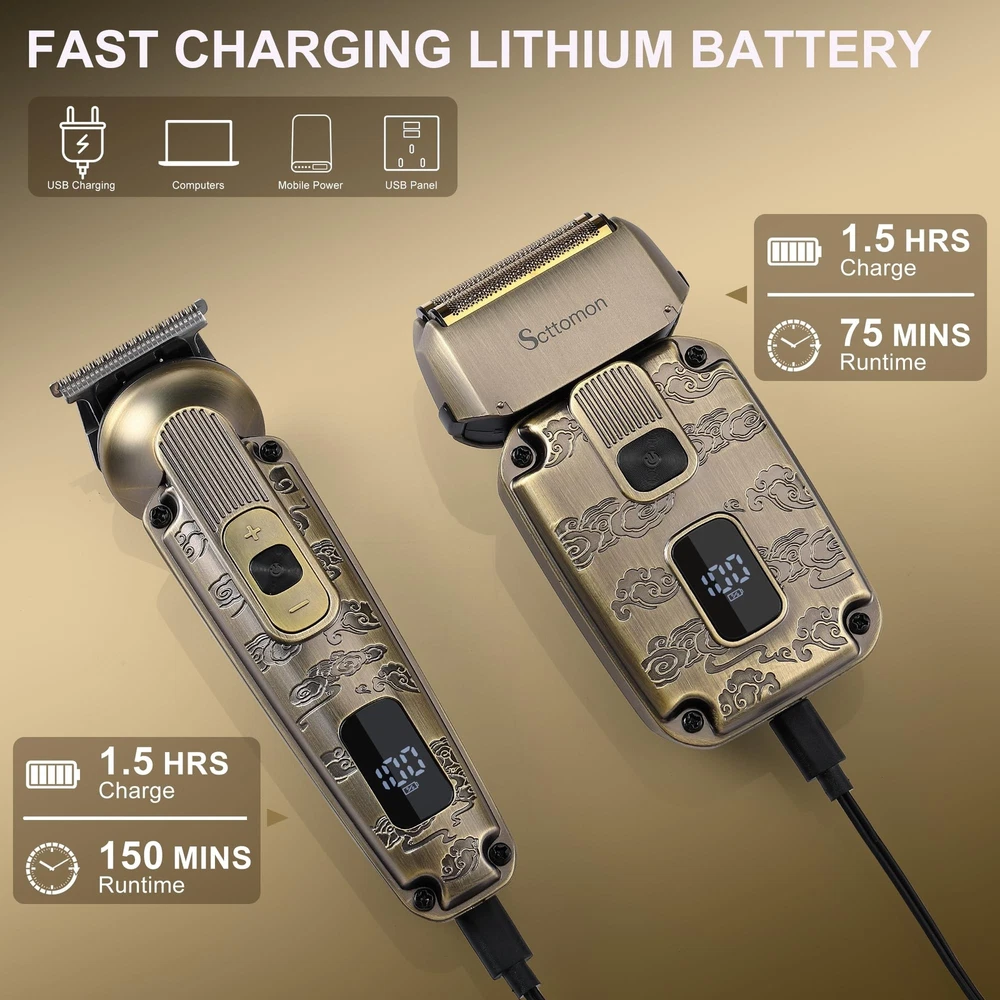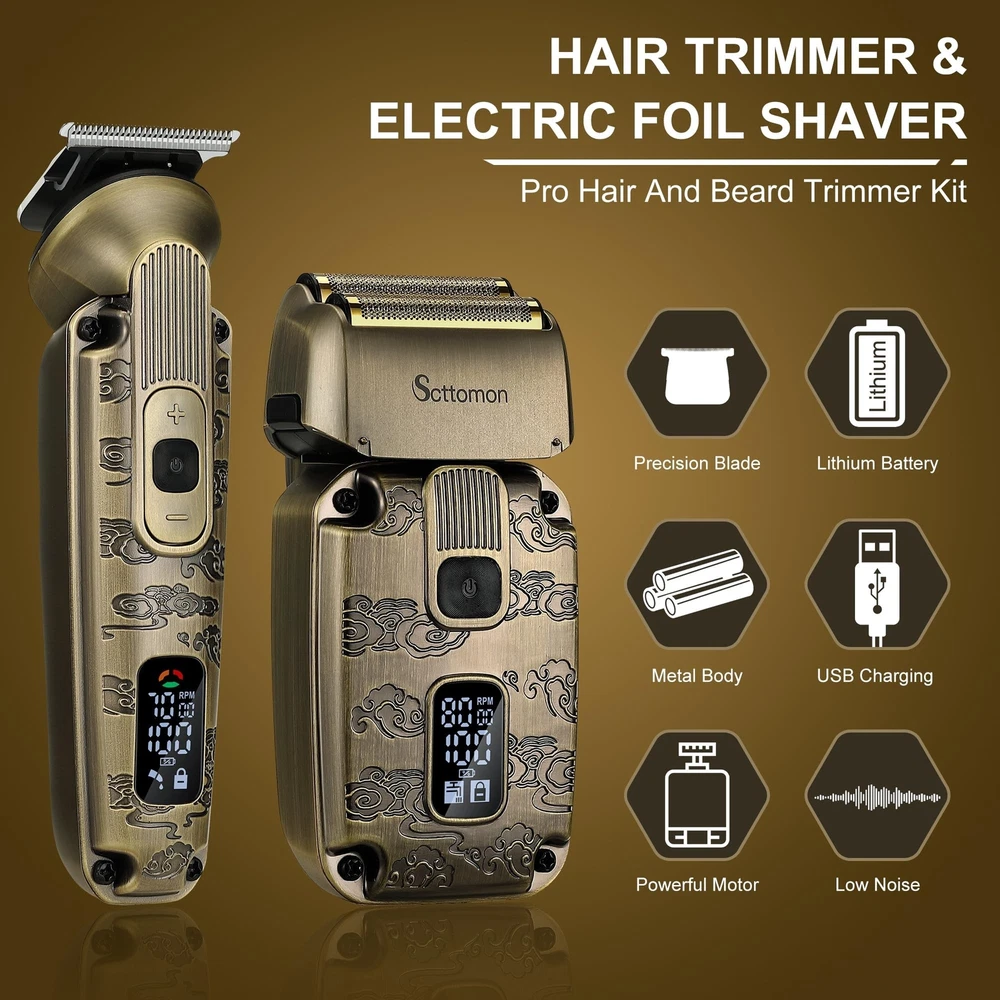 Foil Shavers for Men Beard Trimmer for Men Electric Razor for Men Bald Head Hair Shaving Kit Cordless Waterproof Product Details Recommended Uses For Product: Beard Color: Bronze Hair Type: All Brand: Scttomon Power Source: Battery Powered Package Dimensions : 8.43 x 8.15 x 2.83 inches; 2.2 Pounds Batteries : 1 Lithium Ion batteries required. (included) Date First Available : September 9, 2024 Manufacturer : Scttomon Country of Origin : China Professional Men's Grooming kit: The cordless trimmer set includes hair trimmer and foil shaver. The T-blade trimmer allows for precise hair trimming, ensuring a clean cut every time. The foil shaver provides a smooth and close shave, leaving your skin feeling soft and stubble-free. Ideal for home use and barbershops and we suggest that you first use hair trimmer trim your stubble before using an electric shaver Exquisite Body&Strong Power: T-blade trimmer and foil shaver are made of metal material, which adds luxurious sense and resistant to scratches and dents, keeping it looking flawless for longer. The foil shaver and hair trimmer is equipped with a heavy duty motor and self-sharpening blade that effortlessly removes excess hair without causing any pain and pulling Double-layer Blades&Adjustable speed: The electric shaver adopts a unique double-layer floating mesh design with independent dual cutting blades to fit to contours of the face, neck, and jawline. Achieve flawless and skin-friendly shaving for sideburns, mustaches, and stray hairs with the pop-up trimmer and titanium foil head. Two adjustable speeds(7000RPM/8000RPM) to meet your shaving needs Long-lasting & Portable: With a built-in rechargeable lithium-ion battery, our trimmer kit can provide long-lasting running for you. Charge for sets just 1.5 hours and get up to 150 minutes runtime for trimmer and 75 minutes runtime for shaver. The cordless trimmer set and travel lock design making it convenient and safe to take and use with you wherever you go Waterproof &Wet Dry Shave: The trimmer sets are easy to clean and fully washable because of its IPX6 waterproof design. Press the shaver button to remove the blade cover, and Just clean it under the running water after use. Designed to meet your preferences, not only dry shave, also can be used wet with shaving gel or foam to reducing the risk of skin nicks and cuts Smart LED Display: The high-definition LED screen clearly displays the remaining battery percentage, reminding charging and oil add reminder, three hair trimmer speed turbo mode(6000RPM/6500RPM/7000RPM) display is more intelligent, providing you with all the information to ensure you are using the correct speed and keep trimmer in good condition