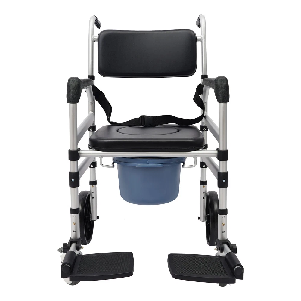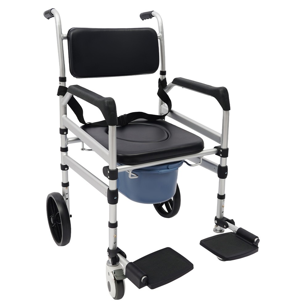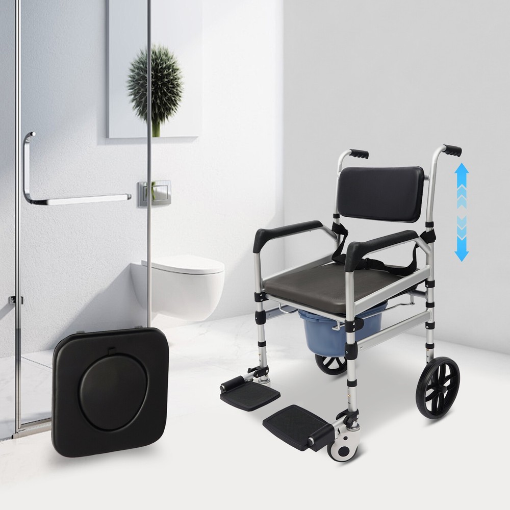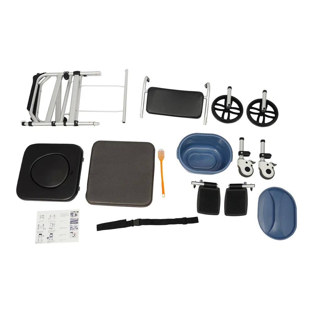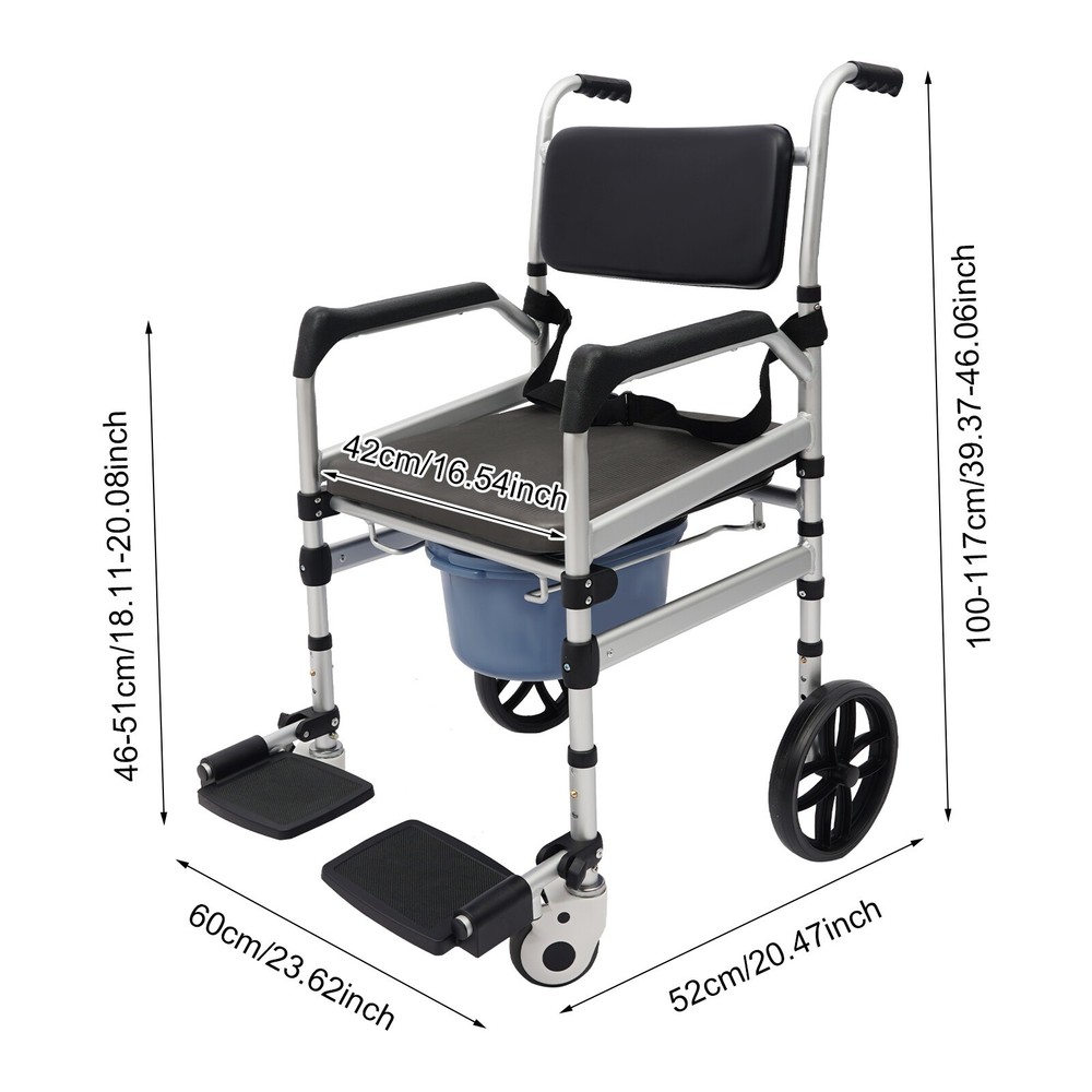 Foldable Shower Chair w/Wheels, Aluminum Alloy Height Adjustable Shower Chair Description This folding shower chair is ergonomically constructed and designed for the elderly, pregnant women, and people with reduced mobility. More than just a piece of assistive furniture for bathing and toileting, it is a combination of care and safety, cleverly blending function and aesthetics to ensure that every use becomes a gentle guardianship. In addition, the foldable design makes it easy to carry and store. Key Features Robust and Durable : It is made of high-class aluminum alloy, sponge, wooden board, and PVC with an anodized matte finish, so it has high hardness, corrosion resistance, wear resistance, deformation-resistance, rust resistance, and good reliability, and it can be used for a long time. Safe and Reliable: High-class materials, sturdy support legs, and a strong frame allow this product to hold up to 330.69 lbs of weight, which prevents it from tilting or swaying during use. The safety belt is designed to prevent the user's body from falling forward from the chair. Its seat plate and armrests have a non-slip design, which effectively reduces the risk of slipping in the shower. Comfort Experience: The large seat plate(inner width: 16.54in) and ergonomic backrest can fit the hip and back well, providing constant comfort and back support, which will help people with limited mobility, such as the elderly, disabled, and pregnant women to bathe more conveniently and comfortably. Thoughtful Design: The 23.62-inch outer width and adjustable seat plate height(18.11-20.08 inches) are designed to fit most home ceramic squatting pans or toilets. The potty can be pulled out from the front and back, or lifted from above after lifting the seat plate, which is convenient for different people to use. Adjustable Height : The sitting height of the product can be adjusted in 3 gears from 18.11in to 20.08in, which can cater to people of different heights, ensuring a comfortable sitting posture and support during showering and toileting. Multi-function : In addition to being a shower chair, it can be placed next to your bed and used as a bedside toilet, placed directly on the toilet, or used as a transport wheelchair to extend the user's range of motion. Moveable and Lockable: Two large directional wheels, two universal wheels with brakes, and handles allow your loved ones and carers to help you move around in comfort, with the two brakes making it easy to stop stably at the right place. Foldable Design: Two foldable footrests make it easy for users to get on and off, plus the foldable main frame, so it is easy to carry or store in the corner of the room without taking up too much space. Ideal Gift: Thanks to its good performance and powerful functions, this product is a great gift for the elderly, disabled, and pregnant women to have a convenient and comfortable toileting and showering experience. Simple Assembly: The simple structure and complete installation parts make the product's assembly very simple and can be completed in a few minutes. Easy Clean-up : With its simple construction and smooth surface, you can simply wipe off surface dust with a soft cloth(not included). Details Potty& Potty Holder: The enlarged and extended potty(14.56 inches) is less likely to leak or splash urine. The potty holder can hold the potty stably for convenient use. O-shaped Cut-out Cushion: This provides easy hygiene and access. Smooth Edges : They not only enhance the aesthetics of the product but also improve safety during installation and use. Application It can be used in hospitals, rehabilitation centers, homes, bedrooms, hotel bathrooms, and more. It is very suitable for pregnant women, patients, elderly people with disabilities, and walking inconveniences. Specifications Style: Modern Color: Silver+Black Cushion Shape: O-shaped Material: Aluminum Alloy, Sponge, Wooden Board, PVC Process: Anodized Matte Finish Assembly Required: Yes Mounting Type: Floor Standing Load-bearing Capacity: 150kg/330.69lbs Seat Adjustable Range: 46-51cm/18.11-20.08in(3 Levels) Seat Inner Width: 42cm/16.54in Product Outer Width: 60cm/23.62in Total Product Height: 100-117cm/39.37-46.06in Package Size: 75*57*20cm/29.53*22.44*7.87in Gross Weight: 10kg/22.05lbs Net Weight: 9.5kg/20.94lbs Package Included 1* Folding Shower Chair 1* Potty 1* Safety Belt 2* Lockable Universal Wheels 2* Large Directional Wheels Notes Please check the size carefully before ordering. It is suitable for toilets with a height below 16.14 inches. The door width should be larger than 24 inches. Please ensure the product is stable and safe before use, and adjust the seat height if necessary. Please use this product within the load-bearing range. Please clean the product regularly for hygiene. Please allow the slight color difference caused by the shooting light and the 1-3 cm error due to manual measurement, and make sure you do not mind before ordering.