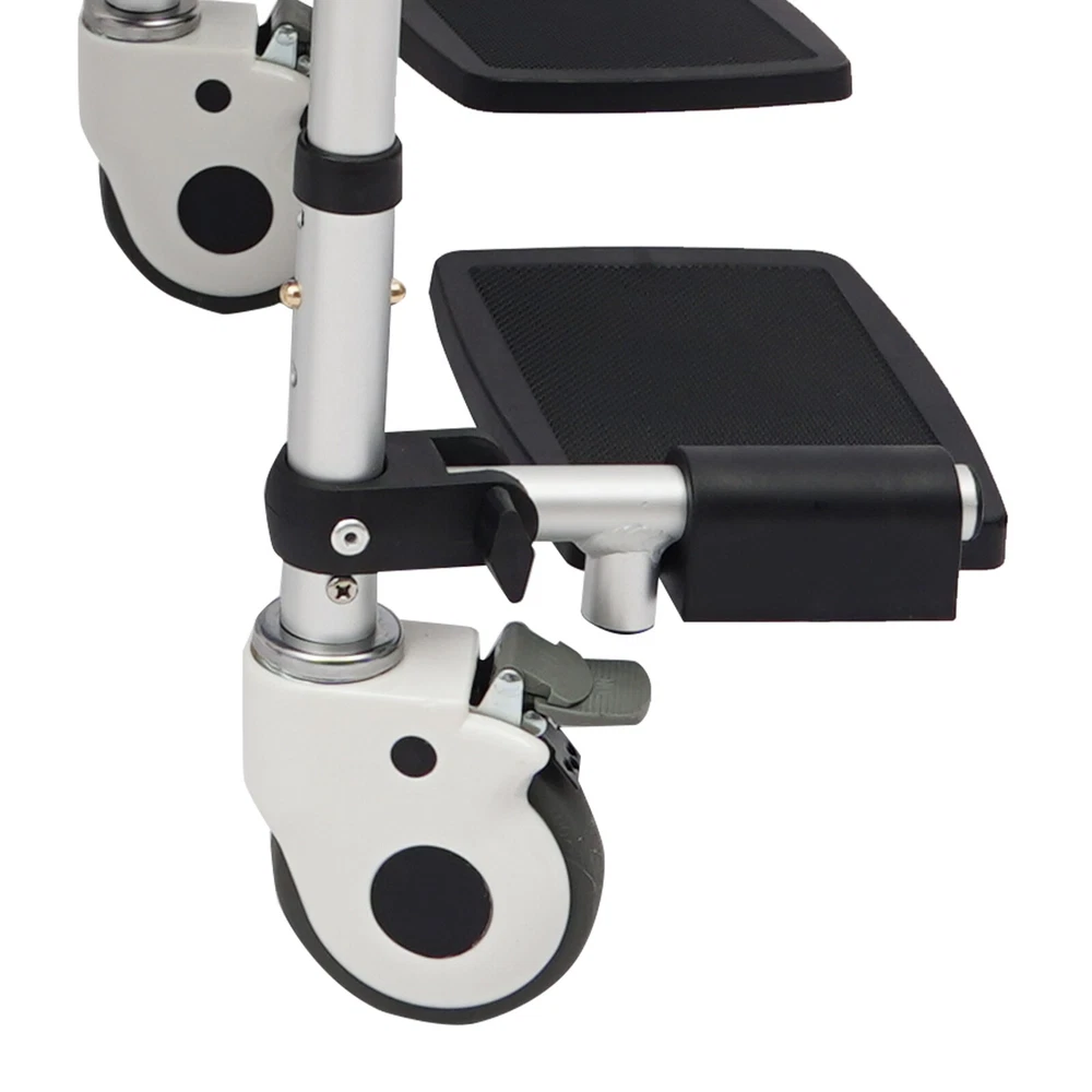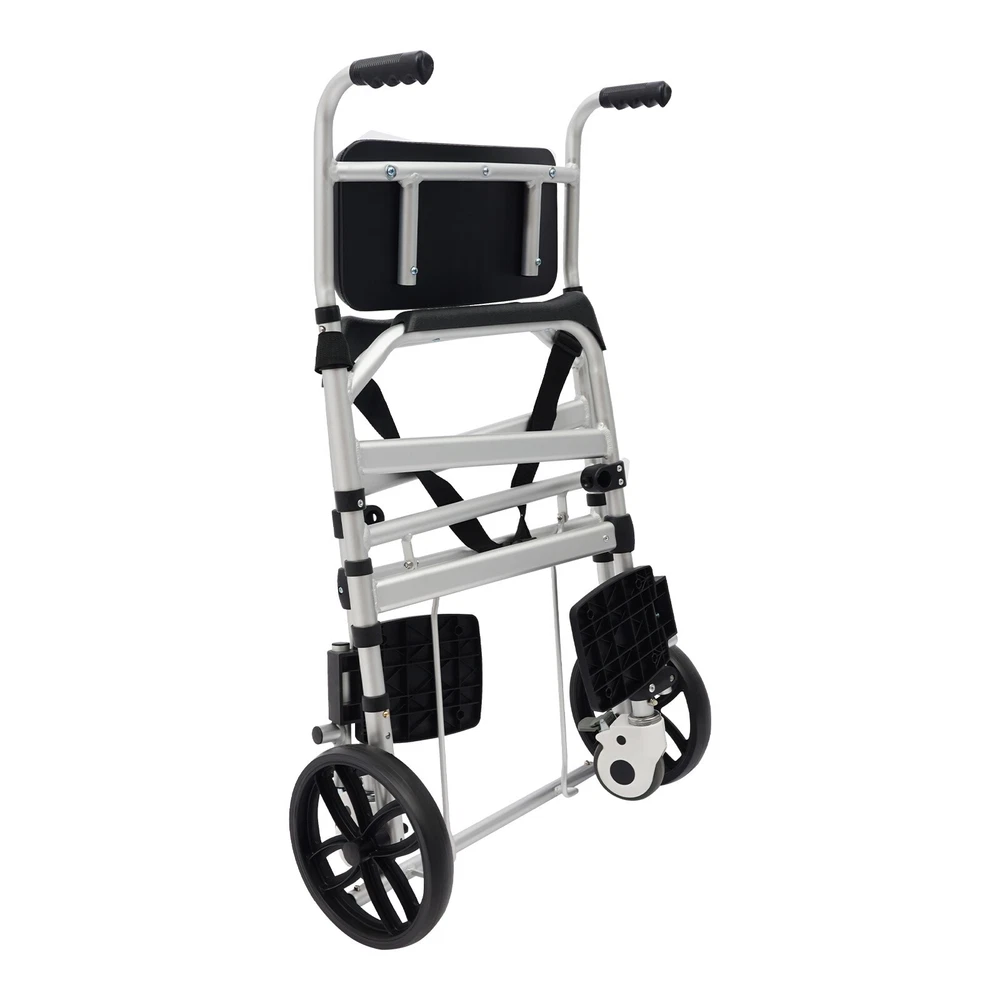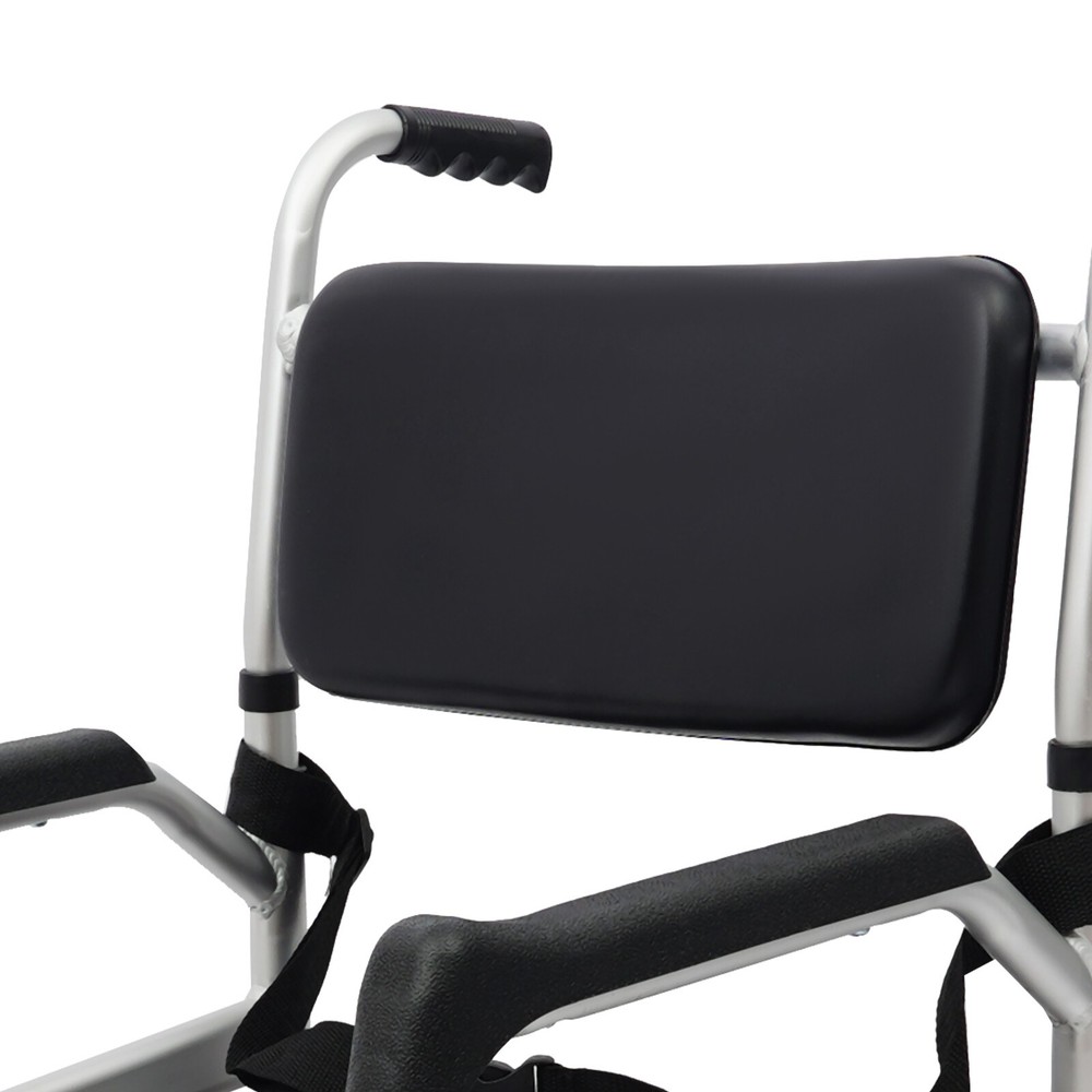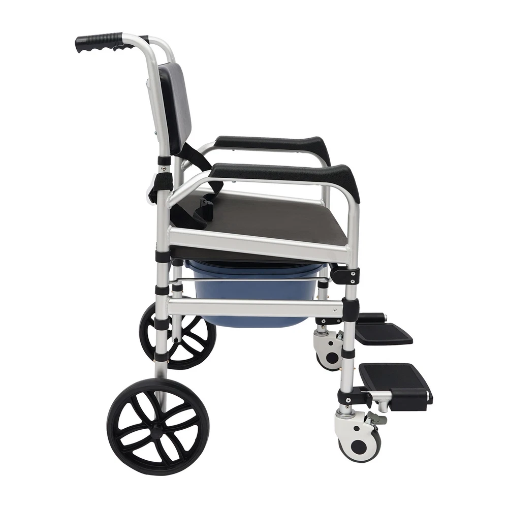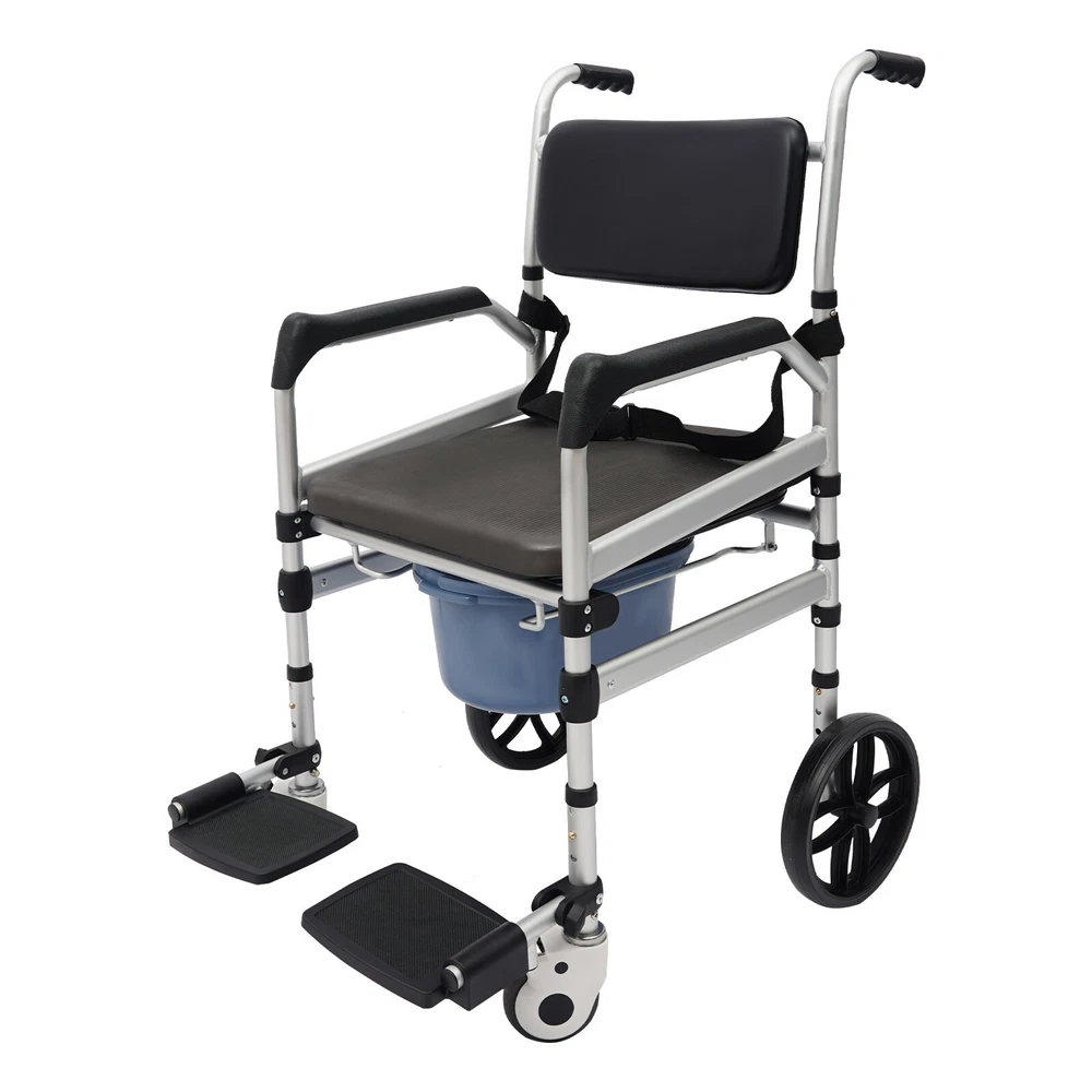 Foldable Shower Chair w/Wheels, Aluminum Alloy Height Adjustable Shower Chair Description This folding shower chair is ergonomically constructed and designed for the elderly, pregnant women, and people with reduced mobility. More than just a piece of assistive furniture for bathing and toileting, it is a combination of care and safety, cleverly blending function and aesthetics to ensure that every use becomes a gentle guardianship. In addition, the foldable design makes it easy to carry and store. Key Features Robust and Durable : It is made of high-class aluminum alloy, sponge, wooden board, and PVC with an anodized matte finish, so it has high hardness, corrosion resistance, wear resistance, deformation-resistance, rust resistance, and good reliability, and it can be used for a long time. Safe and Reliable: High-class materials, sturdy support legs, and a strong frame allow this product to hold up to 330.69 lbs of weight, which prevents it from tilting or swaying during use. The safety belt is designed to prevent the user's body from falling forward from the chair. Its seat plate and armrests have a non-slip design, which effectively reduces the risk of slipping in the shower. Comfort Experience: The large seat plate(inner width: 16.54in) and ergonomic backrest can fit the hip and back well, providing constant comfort and back support, which will help people with limited mobility, such as the elderly, disabled, and pregnant women to bathe more conveniently and comfortably. Thoughtful Design: The 23.62-inch outer width and adjustable seat plate height(18.11-20.08 inches) are designed to fit most home ceramic squatting pans or toilets. The potty can be pulled out from the front and back, or lifted from above after lifting the seat plate, which is convenient for different people to use. Adjustable Height : The sitting height of the product can be adjusted in 3 gears from 18.11in to 20.08in, which can cater to people of different heights, ensuring a comfortable sitting posture and support during showering and toileting. Multi-function : In addition to being a shower chair, it can be placed next to your bed and used as a bedside toilet, placed directly on the toilet, or used as a transport wheelchair to extend the user's range of motion. Moveable and Lockable: Two large directional wheels, two universal wheels with brakes, and handles allow your loved ones and carers to help you move around in comfort, with the two brakes making it easy to stop stably at the right place. Foldable Design: Two foldable footrests make it easy for users to get on and off, plus the foldable main frame, so it is easy to carry or store in the corner of the room without taking up too much space. Ideal Gift: Thanks to its good performance and powerful functions, this product is a great gift for the elderly, disabled, and pregnant women to have a convenient and comfortable toileting and showering experience. Simple Assembly: The simple structure and complete installation parts make the product's assembly very simple and can be completed in a few minutes. Easy Clean-up : With its simple construction and smooth surface, you can simply wipe off surface dust with a soft cloth(not included). Details Potty& Potty Holder: The enlarged and extended potty(14.56 inches) is less likely to leak or splash urine. The potty holder can hold the potty stably for convenient use. O-shaped Cut-out Cushion: This provides easy hygiene and access. Smooth Edges : They not only enhance the aesthetics of the product but also improve safety during installation and use. Application It can be used in hospitals, rehabilitation centers, homes, bedrooms, hotel bathrooms, and more. It is very suitable for pregnant women, patients, elderly people with disabilities, and walking inconveniences. Specifications Style: Modern Color: Silver+Black Cushion Shape: O-shaped Material: Aluminum Alloy, Sponge, Wooden Board, PVC Process: Anodized Matte Finish Assembly Required: Yes Mounting Type: Floor Standing Load-bearing Capacity: 150kg/330.69lbs Seat Adjustable Range: 46-51cm/18.11-20.08in(3 Levels) Seat Inner Width: 42cm/16.54in Product Outer Width: 60cm/23.62in Total Product Height: 100-117cm/39.37-46.06in Package Size: 75*57*20cm/29.53*22.44*7.87in Gross Weight: 10kg/22.05lbs Net Weight: 9.5kg/20.94lbs Package Included 1* Folding Shower Chair 1* Potty 1* Safety Belt 2* Lockable Universal Wheels 2* Large Directional Wheels Notes Please check the size carefully before ordering. It is suitable for toilets with a height below 16.14 inches. The door width should be larger than 24 inches. Please ensure the product is stable and safe before use, and adjust the seat height if necessary. Please use this product within the load-bearing range. Please clean the product regularly for hygiene. Please allow the slight color difference caused by the shooting light and the 1-3 cm error due to manual measurement, and make sure you do not mind before ordering.