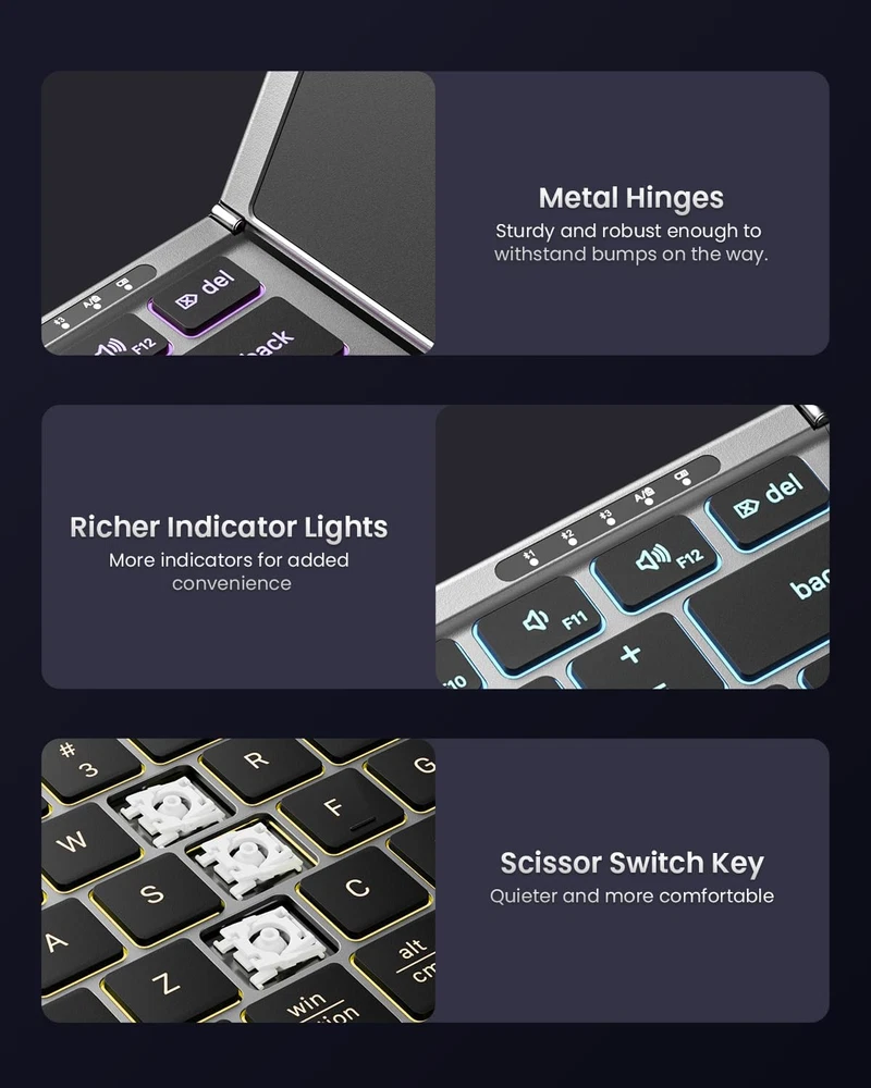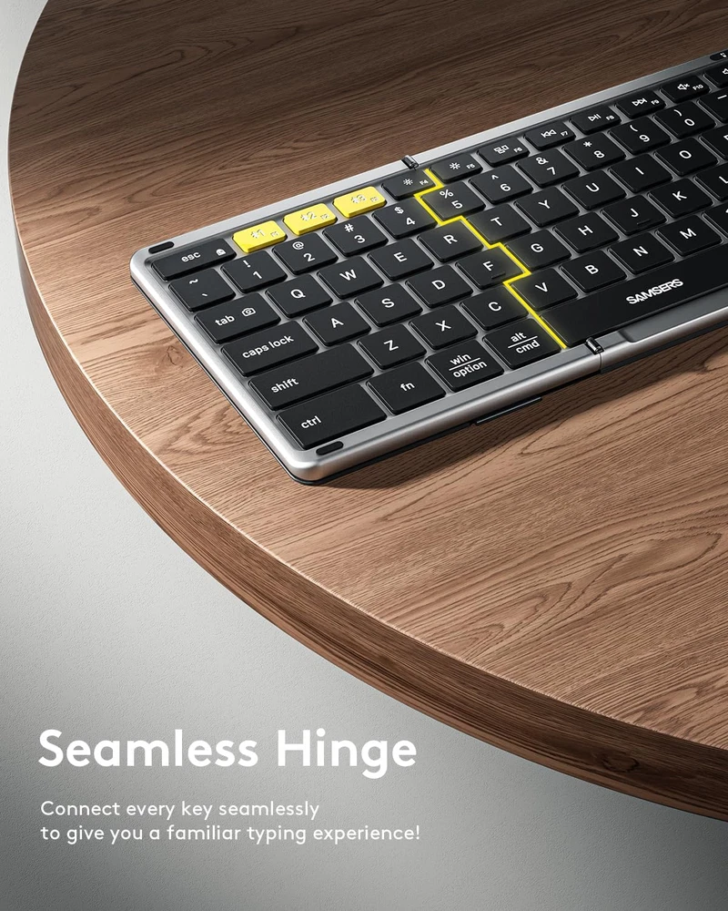 【Full-size Folding Wireless Keyboard】 Elevate your workspace with Samsers foldable keyboard. Designed with standard size (unfolded size: 13.5 x 4.5 inch) and 0.63 inch standard keys, more in line with finger size and typing habits. Innovative seamless metal hinge, allow you to adapt to its layout anytime and anywhere. Quiet scissor-switch keys and non-slip PU leather at the bottom, so that you can fully concentrate on your work! 【Connect up to 3 Devices】 Streamline your workflow with Samsers multi-device Bluetooth keyboard, supports up to 3 connected devices, seamless switching without delay (Bluetooth 5.1 x 3). Compatible with Windows, Mac OS, iOS or Android. You can type, switch, and keep typing on your iPad, phone, tablet, or laptop! 【Multi-touch Trackpad Foldable Keyboard】Upgraded larger sensitive touchpad supports multi-touch, allowing you to control your device without a mouse. Richer and more practical multimedia shortcuts with fn lock function make your work more convenient and efficient! Built-in 500 mAh battery can last up to 110 hours (no blacklight) or standby 300 days after a 2-3 hour charge. One full zcharge is enough time for your short business trip or vacation! 【Adjustable 7 Color Backlight Lighting】Illuminate your workspace with adjustable backlit options. Choose from 7 colors(Green, purple, blue, yellow, white, cyan and red ) and 4 brightness levels (High-Medium-Low-Off) to match your environment and preferences, creating your focused and comfortable atmosphere! 【Delicate Portable Keyboard】Black PU leather appearance, made of ABS+PU material, lightweight but steady, no need to worry about daily wear or scratches. Elegant layout design, excellent tactile feel and simple appearance make it a perfect match for your tablet, phone and laptop. The Great gift for travel and business trips! 【Little Things & Big Convenience】 Samsers folding keyboard with backlight, only 11.0 ounces. Palm-sized keyboard can be folded up magnetically and put in your briefcase without taking up much space. Maximum convenience for you with minimum weight and size! Comes with a phone stand and a velvet storage bag, the perfect companion for a folding keyboard. Not just a keyboard, but a travel solution! Product Description The video showcases the product in use. The video guides you through product setup. The video compares multiple products. The video shows the product being unpacked. hero-video Merchant Video Support More Gestures Responsive trackpad with multi-touch gestures - Scroll, Swipe, Click. Level up your productivity~ 1 7 Color Backlight 2 Up to 3 Devices 3 Standard Full Size 4 Multi-Gesture Trackpad 1 Newly Upgraded Chip 2 Comfort Scissor Switch Is it a real full-size keyboard? Yes, it is. Designed with Full-Size standard size (unfolded size: 13.5 x 4.5 inch) and 0.63 inch standard keys, more in line with finger size and typing habits~ Touchpad not Working? It's Not Responding? Use the fn+ shift (right key)key combination to check if the trackpad is turned off. lf the touchpad doesn't work in i0S13.4 or higher, Open "Settings"-"Accessibility"-"Touch"-"AssistiveTouch"-"On", and you can enable the touchpad function. How to turn on/off the LED lights and adjust the backlit lightings? Please Use light icon (Left side of arrow key) to adjust 4 levels of backlight brightness levels : High-Medium-Low-Off) Please Use fn + alt (right key) to select 7 available backlight colors. How many lighting colors does this backlit keyboard have? Can the letters light up? The backlit wireless keyboard has 7 switchable backlit colors and 3-level adjustable brightness. The letters and edge of the keys both can light up. There's a problem with my foldable keyboard that I can't solve, what should I do? Please check the manual and Find Samsers support team immediately we will be 100% responsible for each of our products and customers. Unlock More Colors, More Series and Styles from Samsers Add to Cart Add to Cart Customer Reviews 4.6 out of 5 stars 567 4.6 out of 5 stars 54 4.4 out of 5 stars 203 4.4 out of 5 stars 284 4.5 out of 5 stars 119 4.3 out of 5 stars 3,889 4.4 out of 5 stars 554 Price $56.99 $ 56 . 99 $45.78 $ 45 . 78 $50.99 $ 50 . 99 $59.93 $ 59 . 93 $44.99 $ 44 . 99 $34.99 $ 34 . 99 $43.60 $ 43 . 60 Highlights Full Size Layout, Mouse Compact Size , Mouse 7-color Backlit, Full Size 7-color Backlit, Full Size 7-color Backlit, Full Size Compact Size, Touchpad Full Size, Large Numpad, Mouse Shell Material Premium PU Leather Premium PU Leather Premium PU Leather Premium PU Leather Premium PU Leather High Quality ABS N/A Connectivity Tech 2.4G USB, BT 5.0 X 2 2.4G USB, BT 5.0 X 2 BT 5.1 X 3 BT 5.1 X 3 BT 5.1 X 3 2.4G USB, BT 5.1 X 2 2.4G USB, BT 5.0 X 2 Keycap Dimension 0.62 in 0.65 in 0.62 in 0.62 in 0.65 in 0.57 in 0.62 in Keyboard Open Size 13.5"L x 4.5"W x 0.35"H 11.2"L x 4.8"W x 0.35"H 13.5"L x 4.5"W x 0.35"H 13.5"L x 4.5"W x 0.35"H 11.2"L x 4.8"W x 0.35"H 11.89"L x 3.85"W x 0.22"H 17.1"L x 5.3"W x 0.91"H USB C Recharge ✔ ✔ ✔ ✔ ✔ ✔ ✔ Phone Stand Included ✔ ✔ ✔ ✔ ✔ ✔ ✘ Carry Pouch/Case Included ✔ ✔ ✔ ✔ ✔ ✘ ✘ Windows, IOS, Mac OS, Android ✔ ✔ ✔ ✔ ✔ ✔ ✔