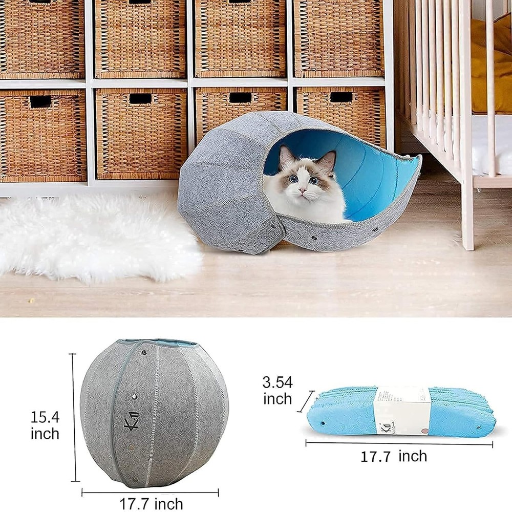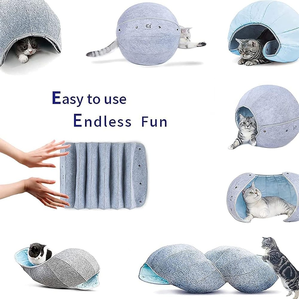 ✨ Product Description Give your feline friend a world of comfort and fun with this versatile 2-in-1 Cat D-Ball Bed & Tunnel! Designed to satisfy your cat’s natural instincts, it transforms from a cozy, enclosed cave into an interactive play tunnel in seconds. The soft, dual-layer fabric keeps your cat warm in winter and cool in summer, while the felt exterior and plush velvet interior create a secure, den-like space that reduces anxiety. Lightweight and foldable, it’s perfect for travel or moving between rooms, making it your cat’s go-to spot for napping, playing, or simply observing the world from a safe vantage point. 🎯 Key Features 2-in-1 Design : Easily transforms from a cozy cave bed into an open play tunnel to satisfy your cat’s need for both rest and activity. All-Season Comfort : The outer felt layer is breathable for summer, while the inner short-hair velvet lining provides warmth for winter. Anxiety-Relieving Hideaway : The enclosed, D-ball shape creates a sense of security, making it ideal for shy, anxious, or skittish cats. Foldable & Portable : Lightweight and collapsible for easy storage and travel, helping your cat feel safe and familiar in new environments. Safe & Non-Toxic : Made with high-quality felt and velvet, free of PBDE flame retardants, so you can trust it’s safe for your pet. Low-Maintenance Care : Simply vacuum or brush away loose fur for daily cleaning, or machine wash on a gentle cycle for deeper cleans. 📏 Technical Specifications Feature Details Material Outer: Breathable felt; Inner: Soft short-hair velvet Safety PBDE flame retardant-free Function 2-in-1 (cave bed + play tunnel) Portability Foldable & lightweight Cleaning Vacuum/brush for daily care; machine washable (gentle cycle) Seasonality All-season use Ideal For Kittens to adult cats