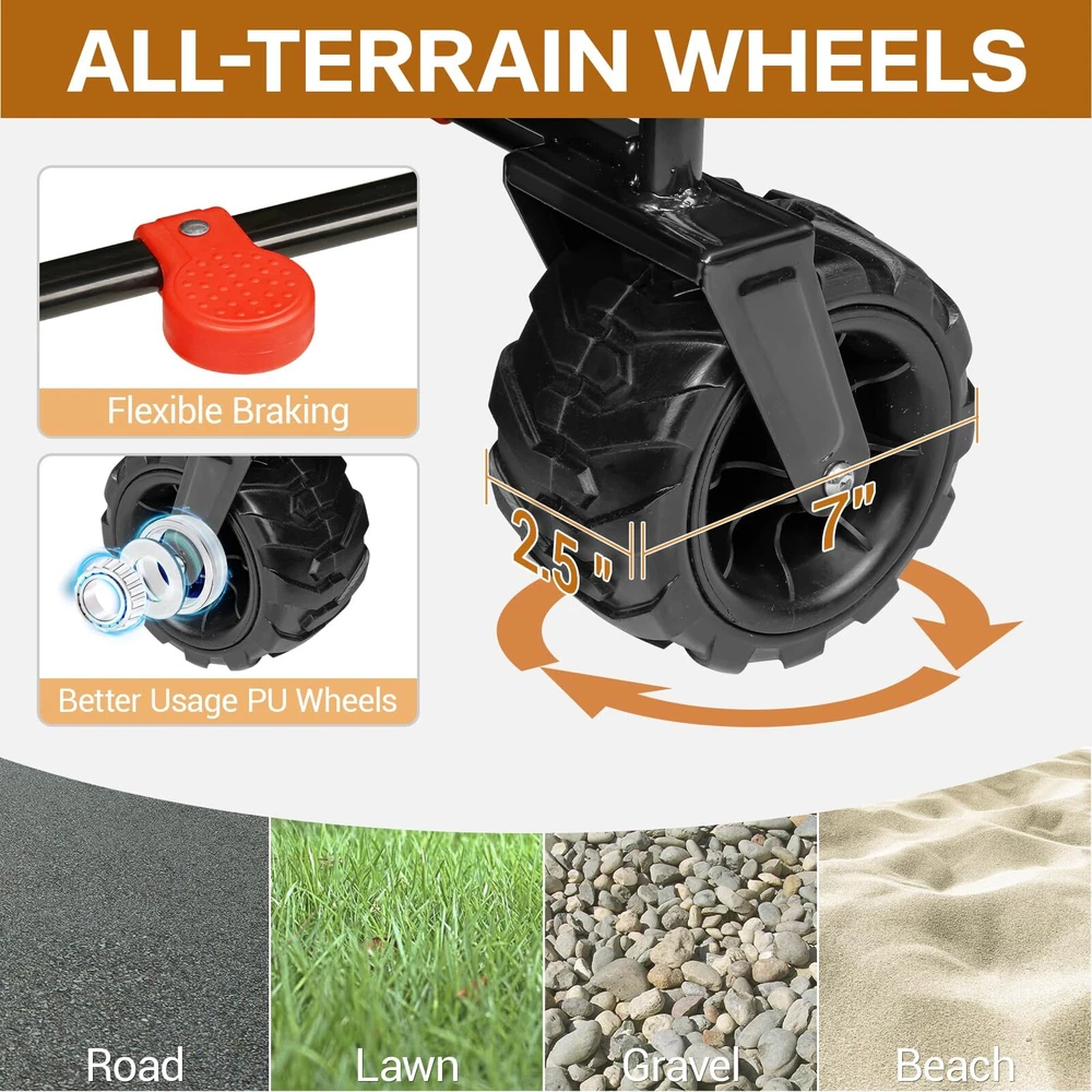 Rear Push Handle Design: This wagon cart has extra collapsible rear handle design, mainly for carrying heavier things, push the rear handle will become more easily and won't get tired for a long time. The large capacity can store more things, very practical. ideal for going to the beach, sporting events, picnics, walking the dog, moving, or even just going to the market for groceries or other shopping trips. Durable Wheels: Its four 7 inch PU tires are made of premium and durable rubber material, has better elasticity, abrasion resistance and puncture resistance. 360° smooth rotation Low noise tires with brake pad in the back can flexible and easy to control the direction. The big wheels for all terrain, can drive on the lawn, gravel, beach, etc. Excellent Quality: This whole foldable wagon cart made of heavy duty steel and features a welded integrated frame, more solid. Its cross design makes the whole construction more stable, and with rust-resistant coating for added durability. Care for Every Details: The front handle can flexible 90 ° adjustable and highly retractable, and the rear handle can be adjusted to the most suitable angle, it also can be folded up to save space when not in use. There are also 2 mesh pockets for conveniently storing bottles. Very practical. Specification & After Sales: This collapsible push wagon cart's bed size is L30''×W16.5'' ×H10''. Load capacity 330 Lbs. products come with a 1-year manufacturer's warranty for quality defects so you can purchase with confidence. If any problem, please feel free to contact us.