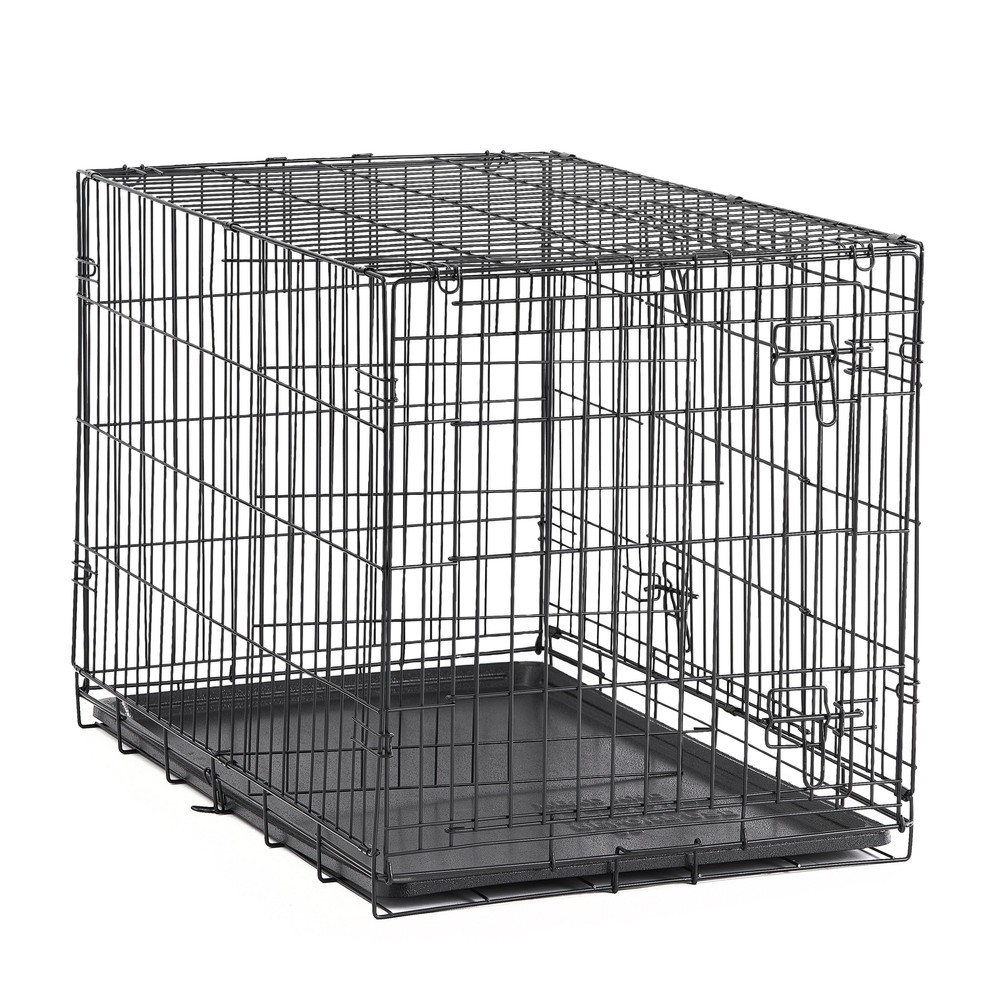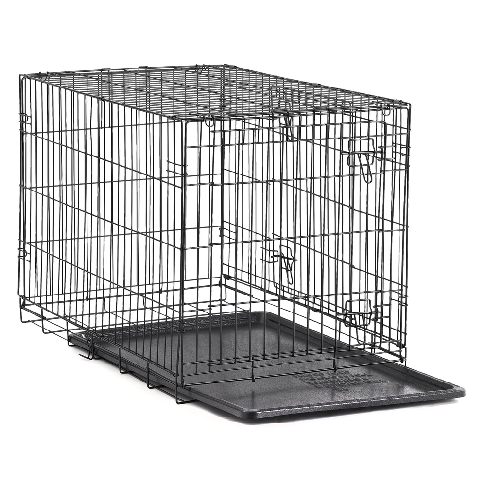 Keep your pet secure with the Double-Door Folding Dog Crate with Divider. It features a heavy-duty, non-corrosive steel frame and a 22-inch double door with locking latches to prevent your animal from escaping. The open wire construction offers visibility and ventilation for your furry friend while the removable floor provides a smooth surface for your dog to enjoy food, water, toys, and treats on while inside. When not in use, it folds flat for compact storage and transport. This kennel can accommodate dogs up to 25 pounds and is suitable for house training and creating a comfortable, den-like space for your dog. Keep your dog safe while away with the Double-Door Folding Dog Crate with Divider.Help your pets live theOur products are specially crafted with one goal in mind, seeing your pet at its very best. With a variety of offerings designed to keep animals healthy, happy and energized, stands out as the brand that truly puts your pet first. Key Features: Strong and durable heavy-gauge steel frame Ideal for house training and creating comfortable containment Suitable for breeds up to 25 lbs Includes a divider for housing 2 smaller dogs Folds flat for easy transport and storage Quick and easy to assemble Removable tray Front and side access doors with dual-sliding latches Provides clear visibility and ventilation