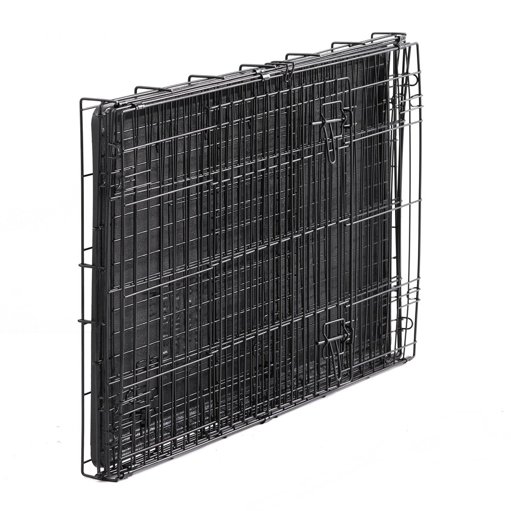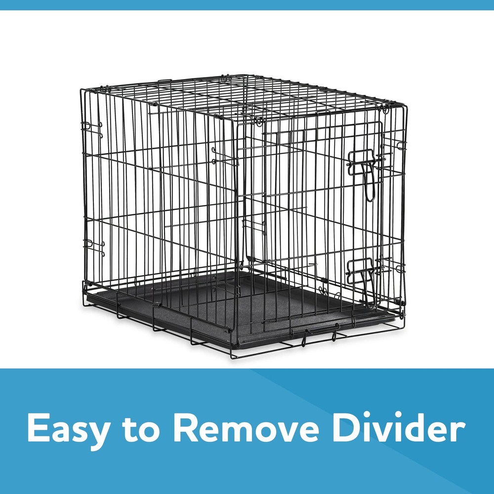Keep your pet secure with the Double-Door Folding Dog Crate with Divider. It features a heavy-duty, non-corrosive steel frame and a 22-inch double door with locking latches to prevent your animal from escaping. The open wire construction offers visibility and ventilation for your furry friend while the removable floor provides a smooth surface for your dog to enjoy food, water, toys, and treats on while inside. When not in use, it folds flat for compact storage and transport. This kennel can accommodate dogs up to 25 pounds and is suitable for house training and creating a comfortable, den-like space for your dog. Key Features: Strong and durable heavy-gauge steel frame Ideal for house training and creating comfortable containment Suitable for breeds up to 25 lbs Includes a divider for housing 2 smaller dogs Folds flat for easy transport and storage Quick and easy to assemble Removable tray Front and side access doors with dual-sliding latches Provides clear visibility and ventilation