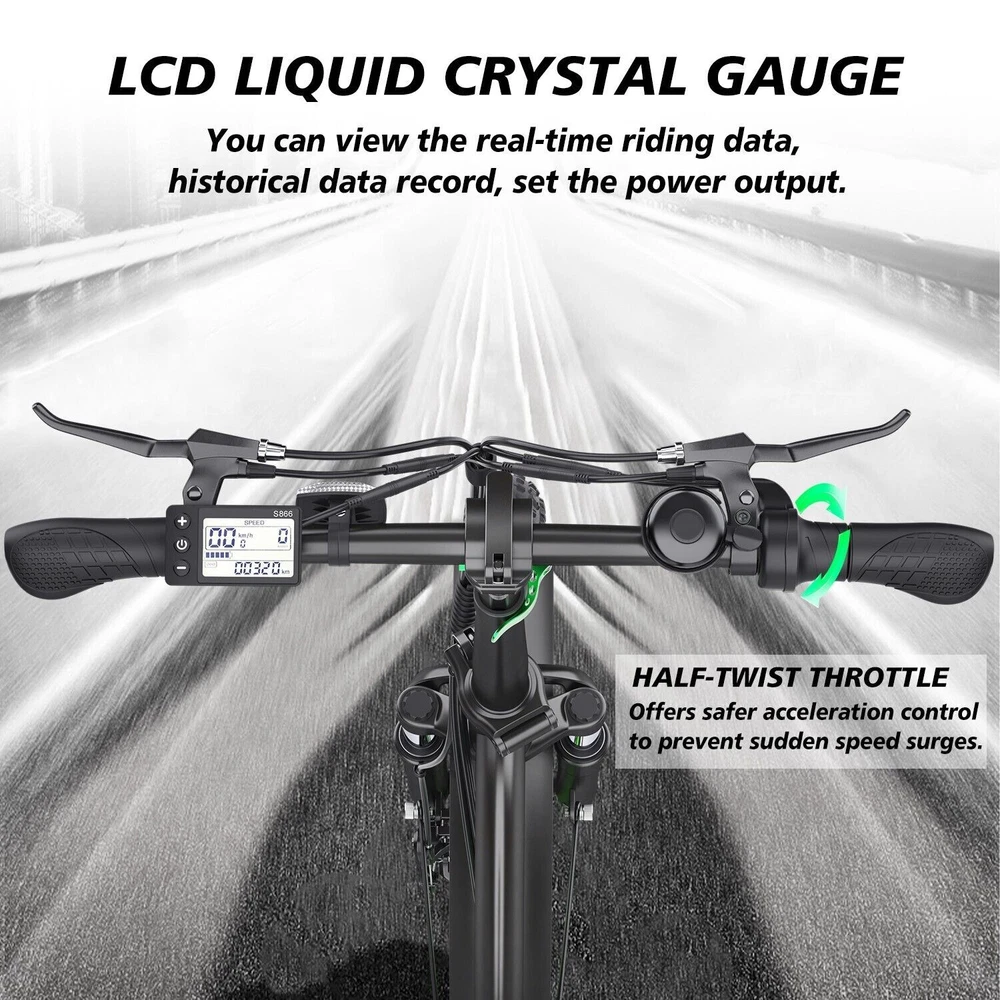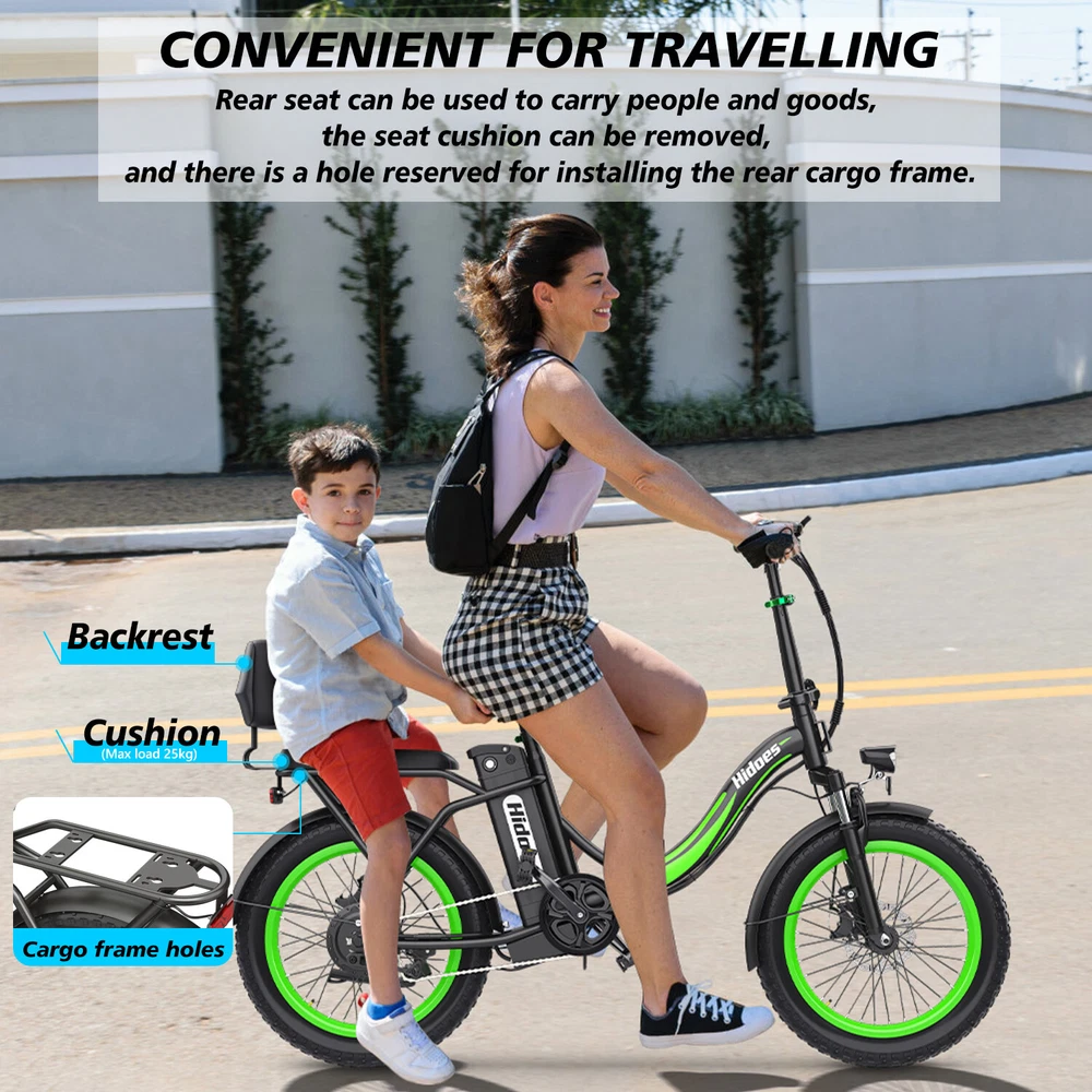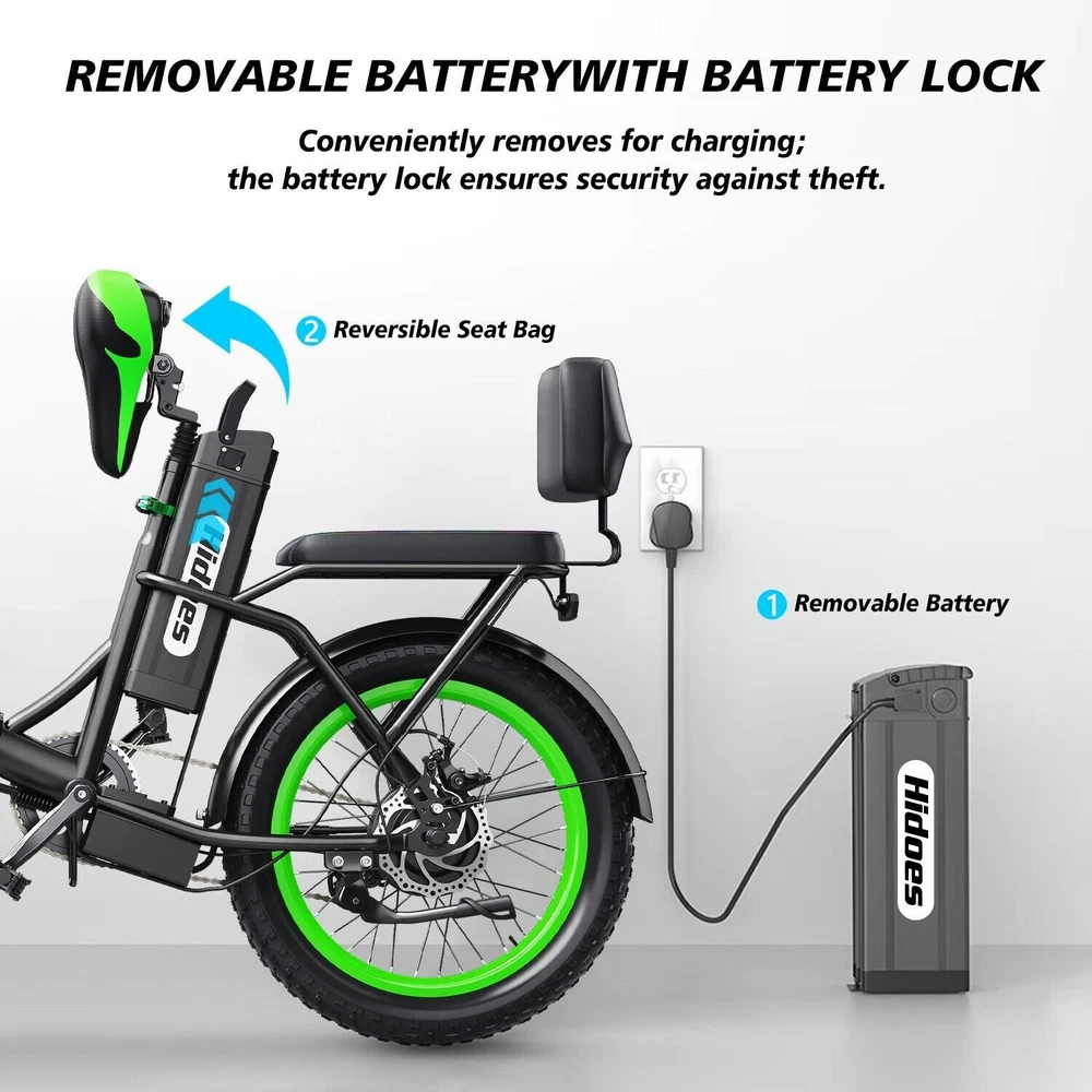Brand: Hidoes Item Weight: 30Kg Suitable Height: 5'5"-6'1" (170-185cm) Brake Type: Disc Brake - Mechanical Manufacturer Warranty: 1 Year Battery: 48V/13Ah (624WH) Gear Change Mechanism: See Description Motor Type: Rear Hub Motor Maximum Speed: 25 mph Bike Type: E-Folding Bike Model: Folding Electric Bike Frame Size: Large Material: Iron Package Size: 93*43*75CM Shifter Style: See Description Features: Adjustable Seat, Display, Front Light, Kickstand, Lithium Ion Battery, Pedal Assist, Rear Bike Rack, Rear Light Frame Number: No gtin13: Does not apply Max Load: 330 LBS (150KG) Country/Region of Manufacture: China Color: Black+Green Motor Power: 750 W Maximum Range: 25-35KM In Pure Electric Mode Charging Time: 5-7 Hours MPN: Does not apply Wheel Size: 20 in Tire Type: Fat Tires Voltage: 48 V Max Speed: 15.5-25 MPH (25-40KM/H) Handlebar Type: See Description UPC: Does not apply Suspension Type: Full Suspension (Front & Rear) Department: Unisex Adult Model Year: 2023