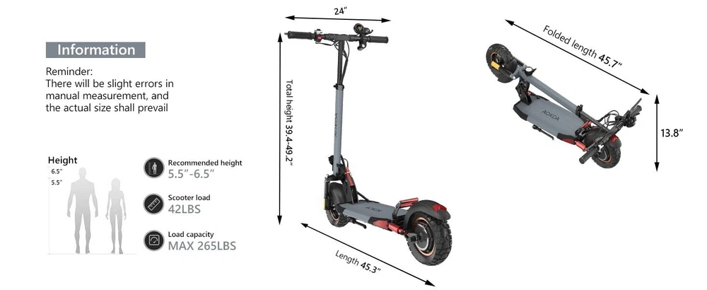 🛴New Way to Across the City Freely - The AOKDA electric scooter for adults which is powered by 48V/12.5Ah battery, makes it easier for you to complete daily travel. One charge is enough for you to ride for 20 miles under specific conditions. Max load 265 lbs. 🛴Let You Ride As You Want, Easy to Drive - Our e-scooter has three different riding modes (Eco: 15Mph, D: 22Mph, S: 28Mph), you can choose the most suitable mode for you according to your needs, and the strong 800W brushless motor allows you ride speed up to 28Mph. 🛴Comfortable Riding Experiences, Enjoy Every Trip - Our electric scooter for adult adopts front and rear wheel suspension system and 10-inch pneumatic tires, which means you can enjoy a smoother and more comfortable riding experience, even on rough roads. 🛴Make Riding More Safety - Our e-scooter for adult is not only equipped with super bright headlight & taillight, but also has a side ambient light, which improves the safety of night riding and allows you to travel with peace of mind at any time. The perfect front & rear dual brakes and electronic braking system allow you to stop whenever you want. 🛴Easy to Fold & Carry - You can fold the electric scooter for adults with two-steps only in a few seconds for carrying and storage. The unfolded size: 45.28"L x 23.62"W x 47.24"H. The folded size is 45.28"L x 8.66"W x 17.72"H, easy to put in your garage or office. 🛴Buy with Confidence - We have always focused on the quality and technical improvement of electric scooters. Our adult electric scooter is designed to be the most sturdy and powerful electric scooter which will quickly become your favorite commuting or outdoor travel companion. We offer 180-days warranty for different parts, contact us to get fast and professional service. 🛴【Important Note】- The max speed and max range per full charged vary based on several factors, including: rider weight, riding surface, incline, ambient temperature, battery level, riding style (stop/start vs cruising), etc. Q&A: How fast can the electric scooter go? Top Speed: 28MPH / 45KMPH (the speed greatly depends on the rider weight, road condition, riding mode...etc) How long do the electric scooter last? Well, with proper care and maintenance, this e-scooter can last anywhere more than 5 years or even longer. What are the benefits of this off road electric scooter? This off road electric scooters with high power motor, fast, portable, and with detachable seat. Not only good for off road riding, but also good for urban commuting. It also save you money on gas because they can be charged quickly. Do this electric scooter work in the rain? Well, it support IP6 waterproof. It's OK to work in small rain, but not recommend in heavy rain. And the pedal of the e scooter cannot be submerged in water. Or the battery and controller will be damaged. iENYRID ADULT ELECTRIC SCOOTER 2400 Dual Motor LONG RANGE 60KM HIGH SPEED 37MPH 1099.0 USD Free shipping AOKDA A1 800W Electric Scooter Up to Speed 28Mph 10in Folding Commuter E-Scooter 455.0 USD Free shipping Adult E-Scooter,Electric Scooter 800W 28MPH,30KM Range eScooter,Free Shipping US 464.25 USD 619.0 USD Free shipping 25% off Electric Scooter Adult Folding E-Scooter 2OOO Dual Motor Off Road Waterproof US 1059.0 USD 25.0 USD with Seat Electric Scooter, Commuter Foldable E-Scooter 28 mph,Free Shipping USA 619.0 USD Free shipping 800W Motor Electric Scooter Teens 28Mph 48V 10in Folding Fast Speed E-Scooter US 619.0 USD Free shipping Electric Scooter Adult 800W 28MPH,30KM Range 10'' Folding eScooter,PRO E-Scooter 464.25 USD 619.0 USD Free shipping 25% off Adult Folding Electric Scooter 900W Peak Motors Speed 28MPH Safe Urban Commuter 589.0 USD Free shipping 800W Electric Scooter Adult with Seat Folding E-scooter Urban Commuter 28MPH LED 514.01 USD 658.99 USD 50.0 USD 22% off ES10 Folding Electric Scooter 2000W 48V 20Ah 31Mph Dual Motor 10in Off-Road Tire 859.0 USD Free shipping 48V 800W Folding Electric Scooter 28MPH Urban Commuter Adult E-Scooter With Seat 539.99 USD 50.0 USD Adult Folding Electric Scooter 2OOO 34Mph Dual Motor 10'' Off-Road Tire eScooter 869.25 USD 1159.0 USD Free shipping 25% off 800W Electric Scooter for Adults 22-31 Miles Range 10" Tires Folding E Scooter 538.98 USD Free shipping iENYRID Electric Scooter Adult Folding E-Scooter 8OOW Motor Off Road Waterproof 512.99 USD 539.99 USD Free shipping 5% off iENYRID Electric Scooter Adult Folding E-Scooter 800W Motor Off Road Waterproof 512.99 USD 539.99 USD Free shipping 5% off 800W Motor Folding Commuter Electric Scooter w/Seat 28MPH for Adults & Teens US 538.99 USD 50.0 USD Electric Scooter Dual Suspension &Brakes Adult Folding E-Scooter 800 Motor 28MPH 464.25 USD 619.0 USD Free shipping 25% off 28MPH E-Scooter Fast Powerful Urban Commuter Long Range 2 Wheel Electric Scooter 593.1 USD 659.0 USD Free shipping 10% off