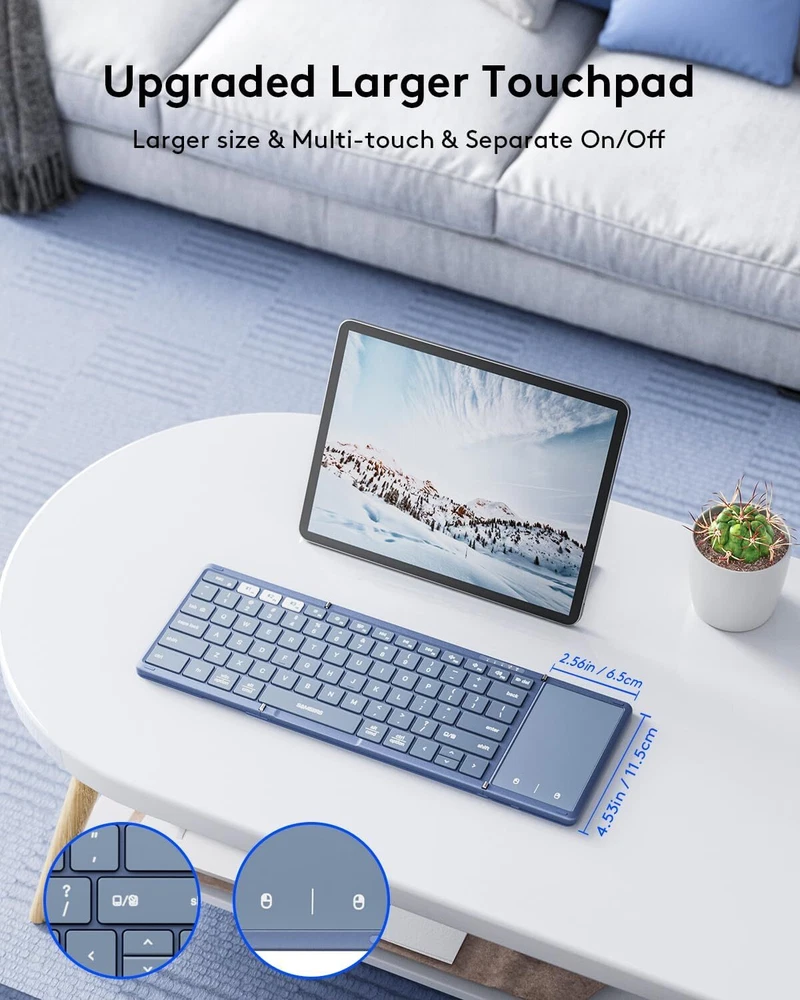 Product Description Foldable Bluetooth Keyboard with Touchpad, Full-Size Wireless Folding Keyboard with PU Leather, Portable Travel Keyboard for iOS Android Windows Mac OS, Support 3 Devices (BT5.1 x 3), Blue 【Full-size Folding Wireless Keyboard】 foldable keyboard is designed with standard size (unfolded size: 13.5 x 4.5 inch) and 0.63 inch standard keys, more in line with finger size and typing habits. Innovative seamless metal hinge, allow you to adapt to its layout anytime and anywhere. Quiet scissor-switch keys and non-slip PU leather at the bottom, so that you can fully concentrate on your work! 【Connect up to 3 Devices】 multi-device Bluetooth keyboard supports 3 devices to connect at the same time, seamless switching without delay (Bluetooth 5.1 x 3). Compatible with Windows, Mac OS, iOS or Android. You can type, switch, and keep typing on your iPad, phone, tablet, or laptop! 【Multi-touch Trackpad Foldable Keyboard】Upgraded larger sensitive touchpad supports multi-touch and mouse function, allowing you to control your device without a mouse. Built-in rechargeable battery can last up to 70 hours or standby 120 days after a 2-3 hour charge. One full charge is enough time for your short business trip or vacation! (Note: Type-C charging cable included) 【Delicate Portable Keyboard】Blue PU leather appearance, made of ABS+PU material, lightweight but stable, no need to worry about daily wear or scratches. Elegant layout design, excellent tactile feel and simple appearance make it a perfect match for your tablet, phone and laptop. The Great gift for travel and business trips! 【Little Things & Big Convenience】 portable folding keyboard, only 9.3 ounces. Palm-sized keyboard can be folded up magnetically and put in your briefcase without taking up much space. Maximum convenience for you with minimum weight and size! Comes with a phone stand and a velvet storage bag, the perfect companion for a folding keyboard. Not just a keyboard, but a travel solution! About Us We are a reputable seller with many years of experience selling on eBay. Our goal is to provide high-quality products and excellent customer service. Shipping Items will be shipped within 1-3 business days when we received payment. (Orders are not processed on weekends & holidays) Tracking information will be sent once item is shipped. Delivery time depends on destination and other factors Item is shipped to ebay address. Leaving correct address can minimize delay. For international shipping and shipping to Guam, Hawaii and Alaska, Please contact us before placing the order. International buyers please note: Import duties, taxes and charges are not included in the item price or shipping charges. These charges are buyer’s responsibility. We will try our best to reduce the risk of the custom duties. Local pick-up is unavailable at the moment. Contact Us We reply any email messages within 1 business / working days(off-duty at weekend). If you do not get a response from us, then please check your junk or spam mailbox. Our Business hours: Mon-Fri 9:00-18:00, UTC/GMT +8 hours. Please contact us either by clicking "contact seller" in the "purchase history" section or simply click "ask a question" at the bottom of this page. If you are unsatisfied with our item or service, please contact us before leaving any feedback. We are committed to resolve all issues in a friendly and satisfactory manner.