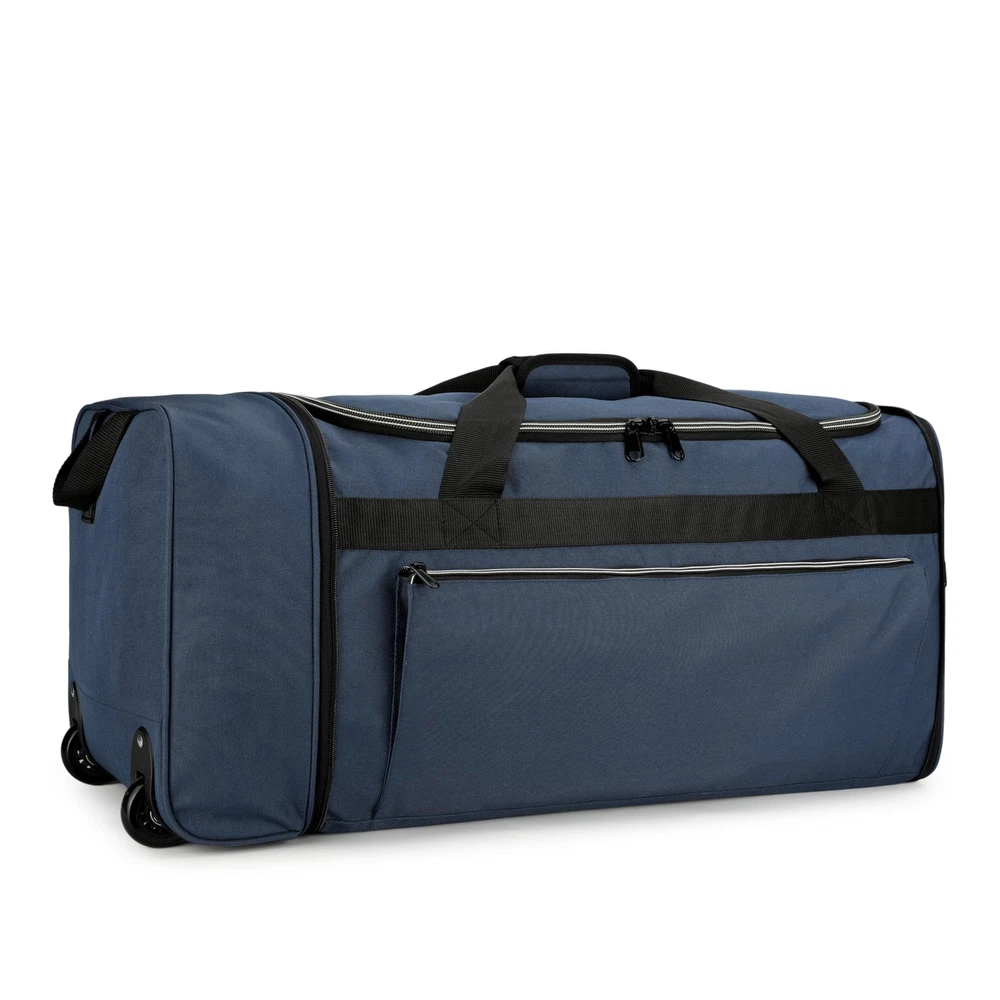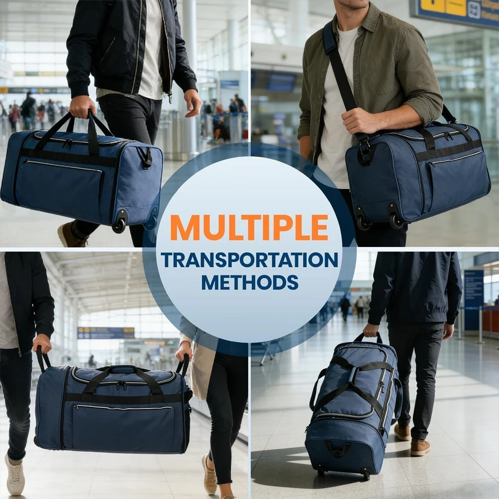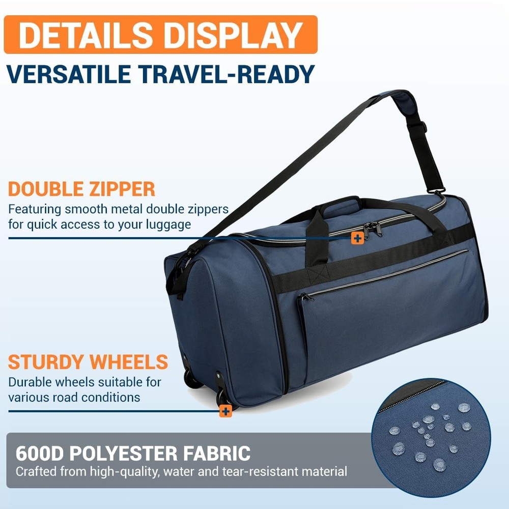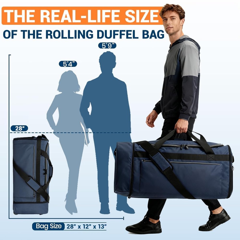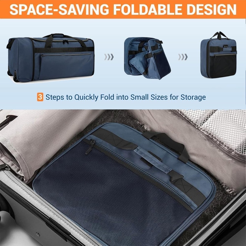 Foldable Rolling Duffle Bag with Wheels, 80L Large Duffle Bag for Travel, Carry On Duffel Bag for Men and Women Foldable Design – Measuring 28"(L) × 12"(W) × 13"(H) and weighing just 1.1 lbs, this rolling duffle bag with wheels can be quickly folded down to a compact 12"(L) × 4"(W) × 13"(H) flat size. It easily fits into your luggage as a “just-in-case” spare bag, perfect for storing souvenirs or unexpected necessities during your trip. 80L Large Capacity – Featuring a spacious U-shaped opening in the main compartment, this rolling duffle bag offers 80 liters of storage space, easily accommodating 3–4 days' worth of travel gear. It allows for quick access to your belongings without the need for rummaging. Additionally, a front zippered pocket and a side zippered mesh pocket help keep your essentials organized. Durable Material – Crafted from 600D water-resistant and tear-resistant polyester, this duffel bag with wheels is sturdy, abrasion-resistant, and easy to wipe clean. The interior is lined with PVC to protect your belongings from light rain, splashes, and everyday wear and tear. Heavy-Duty Wheels & Strenthened Bottom – The foldable travel bag is equipped with a foldable reinforced base panel to enhance durability and longevity. It also features two heavy-duty wheels housed within protective wheel casings, ensuring smooth mobility for effortless and comfortable travel. Comfortable Carrying Options – Customize how you carry this carry on duffel bag with its removable shoulder strap, padded top handle, and dual side handles. Designed for versatility, it is an ideal choice for travel, flights, checked luggage, or camping, making it easy to handle in various carrying scenarios.