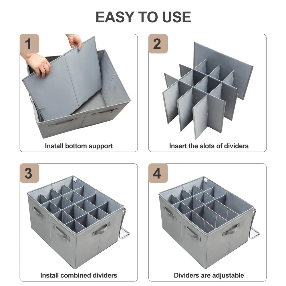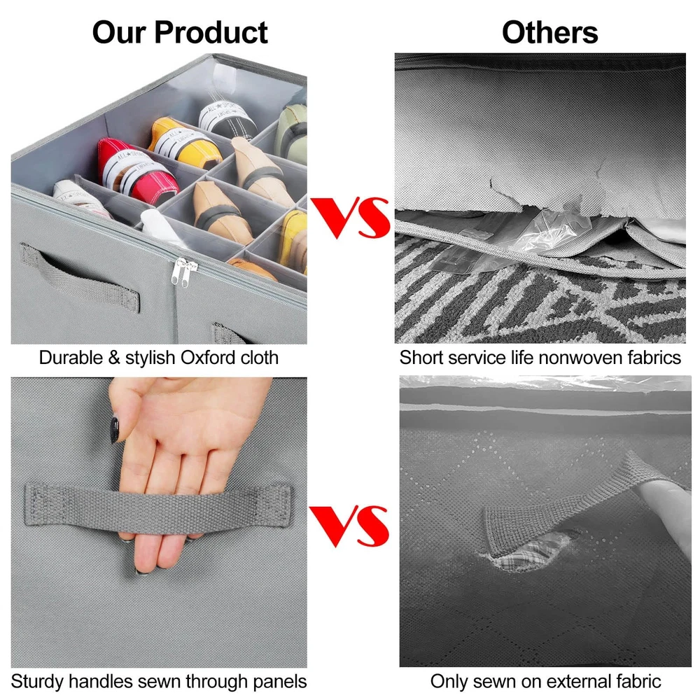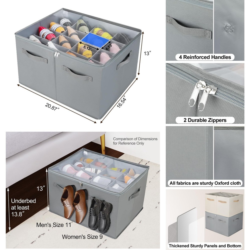Shoe Organizer for Closet, Foldable Shoe Box with Adjustable Dividers and Clear Cover, Space Saving Shoe Storage Organizer Cabinet with Reinforced Handles, Fits 16 Pairs, Gray Large Capacity Shoe Storage: shoe organizer measures 20.87''L x 16.54''W x 13'H (53x42x33cm), and fits up to 16 pairs of shoes. When set to 16, the size of each compartment is 5.12 '' x 4.13 '' (13x10.5cm). When not in use, the shoe storage box can be folded up for storage to save space Adjustable Compartments: Connecting and adjusting each compartment of shoe box using card slots makes installation and use of closet shoe organizer very simple. The dividers can be adjusted according to the size of the shoes, such as sandals, high heels, sneakers, boots, slippers etc. Adjustable partition design of storage bin also helps you organize various items like clothes, handbags, books, blankets, towels, toys, shampoo, and more Space Saving Storage Solution: Compared to a shoe rack of the same size, shoe storage boxes are dustproof and can store more pairs of shoes, which is very space saving. Shoes storage organizer is also suitable for storing shoes when seasona changes. Shoe boxes can be placed in cabinets, closets, wardrobes, entryways, top shelves or just on the floor. Shoes organizer is available for walk in closet, living rooms, bedrooms, entrances, attics, garage, basements, RVs, dormitories and more Visual Design& Easy Access: The shoe basket has a transparent PVC lid that provides excellent visibility and allows for easy identification of the contents, making it easy for you to pick the shoes you need at any time. The lid also prevents dust. The durable zippers make the opening and closing of the shoe storage containers smooth and convenient, so you can store and take out the shoes without obstruction Durable Materials & High-Quality: High quality Oxford fabric is more durable and stylish compared to non-woven fabrics. The reinforced side boards and inserted bottom ensure that shoe box can maintain its shape even under pulling or other pressure, and will not collapse when empty or full. The reinforced handles allow you to easily remove shoe bin from closet, shelves ect. With no handles on the back to avoid occupying space when placed against the cabinet wall Not Just Shoe Storage: The high and rectangular partition design makes this storage box also suitable for storing water bottles, wine glasses, wine, champagne, and more. Adjustable partition design of storage bin also helps you organize various items like clothes, handbags, books, blankets, towels, toys, shampoo, and so on