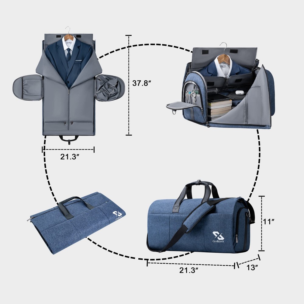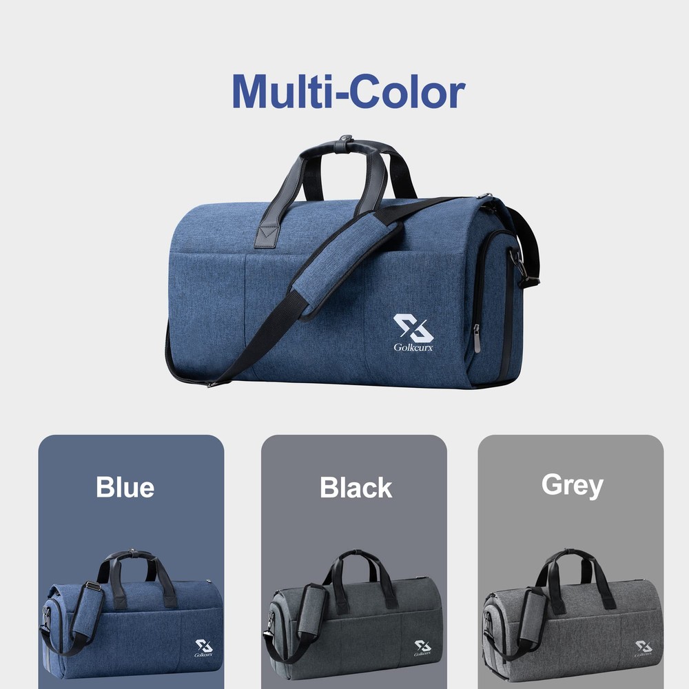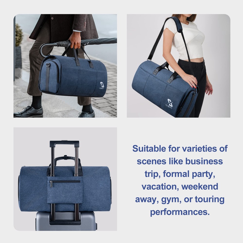 【2 in 1 GARMENT BAG】This garment travel bag combines the feature of a garment bag and travel duffle bag. There are 2 buckles inside to keep the garment flat and prevent it from moving during the trip, keep your dress or suit neat and wrinkle-free. It's a perfect choice for your business trip, formal party, vacation, end of the week out, gym, or touring performance 【CARRY ON & LIGHTWEIGHT】Unfolded flat size: 37.8”L x 21.3”W, 45L duffel bag folded dimension: 21.3”L x 13”W x 11”H. Light weight: 2.6 pounds. This convertible garment bag size is able to be compliant with aviation size standard, and is able to be carried on as a luggage item. Short ring handles allow you to easily carry the garment travel bag through the airport or pull out the detachable and adjustable shoulder strap for hands-free travel 【HARD-WEARING &WATER-PROOF】It is made of high quality, durable fabric that is resistant to scratches, tears, and water splashes. With sturdy zippers and bigger size zippers on the outside bag, make it easy for entry 【FUNCTIONALITY】There are multiple interior & exterior zipper pockets for storage. The big front pockets for speedy entry to anything. Two side pockets, one is a shoe compartment, and the other is a passport pocket. Garment pocket inside for storing your suits or dresses, dress watches, ties, cuff links, belts, or any other personal belongings 【SALES SERVICE】is committed to providing excellent customer service to its customers including pre-sales and after-sales service. Please feel free to contact us if you have any questions or concerns you may have