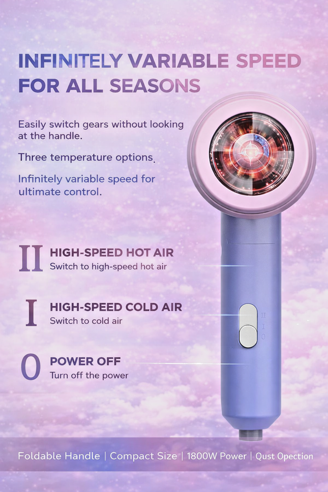 This compact foldable hair dryer is designed for travel, everyday use, and small spaces . Lightweight and easy to store, it delivers quick drying airflow while maintaining consistent heat for safer styling. Ideal for home, gym bags, dorm rooms, and travel luggage. SPECIFICATIONS • Power: 1000W • Motor Type: AC Motor • Voltage: 110V • Design: Foldable & Portable • Size: Travel Size • Color: White • Material: Plastic • Use: Household & Travel • Heat Control: Adjustable heat settings PACKAGE CONTENTS • 1 × Foldable Hair Dryer • 1 × Concentrator Nozzle • 1 × User Manual