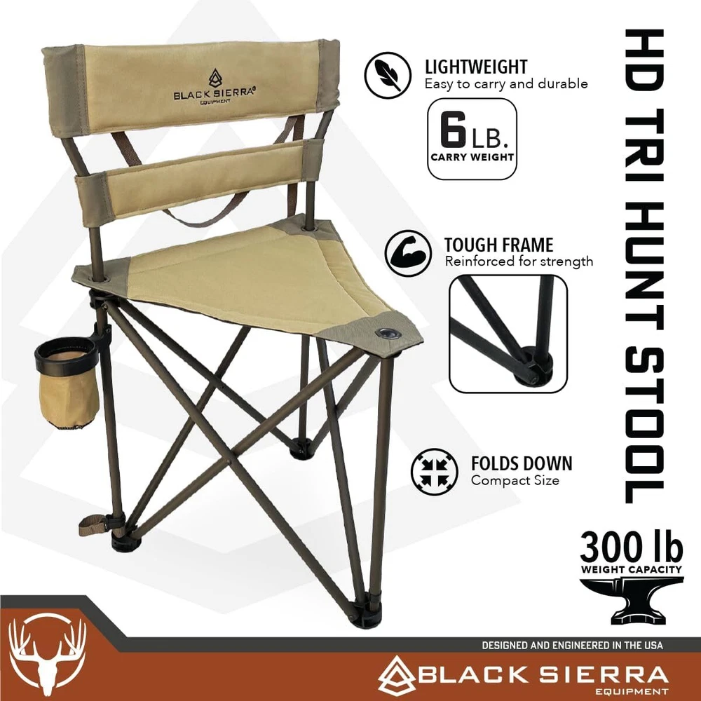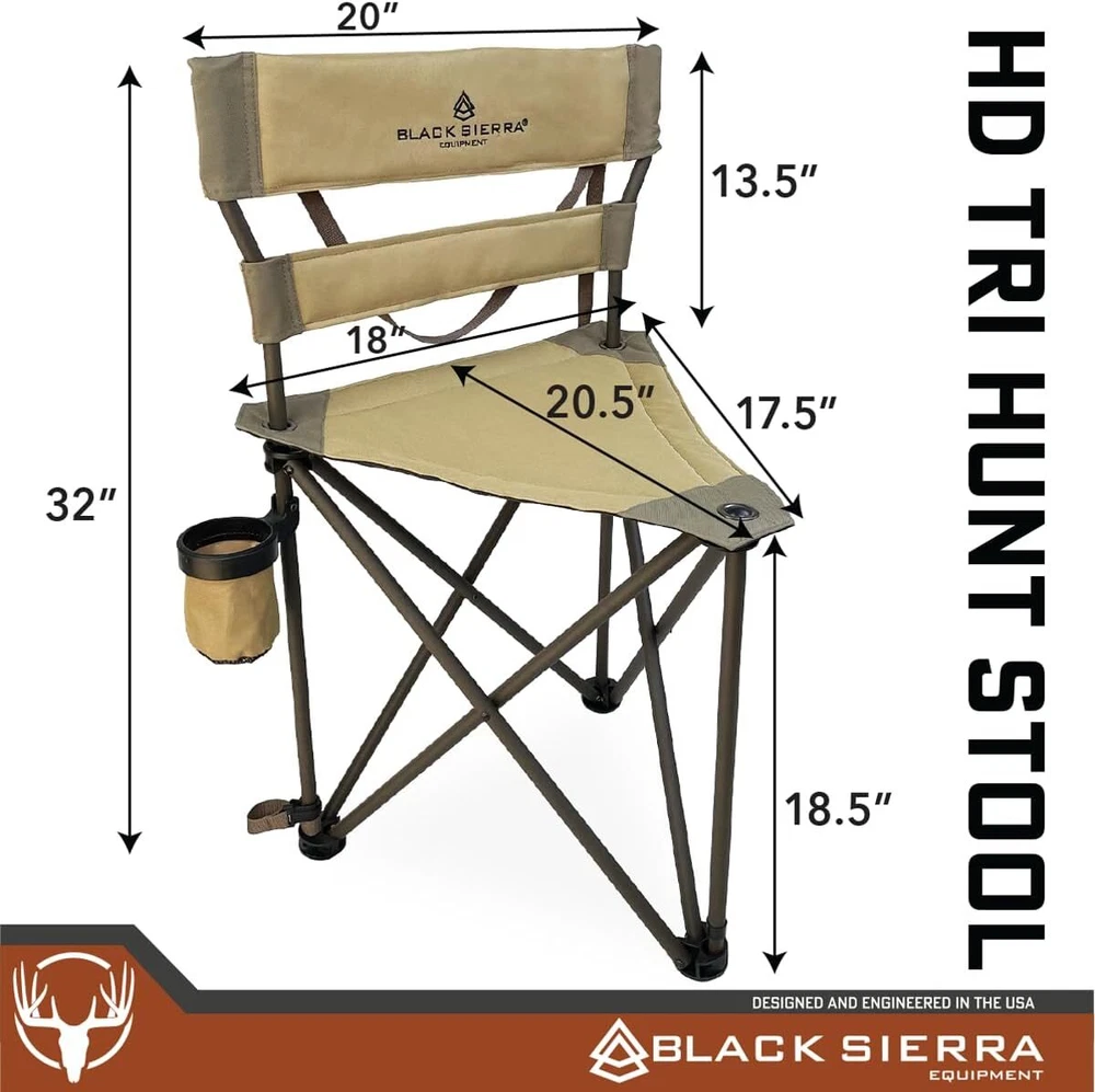 Product Description HD Tri Hunt Stool BUILT FOR THE OUTDOORS : This Tripod style chair is the complete choice for hunting, fishing, travel, sports games and more! Complete with an adjustable cupholder for storing drinks. COMFORTABLE DESIGN : Durable poly oxford padded seating and backrest offers all day comfort, and double layered back design provides a cozy ergonomic support perfect for all day use. LASTING SUPPORT : Built with a heavy-duty powder coated steel frame that can support 300 lbs. This chair measures 32”H, 18” L, 20.5” D when open PORTABLE : This lightweight chair has a carry strap included, making the Tri-Hunt Stool perfect for easy transport while camping, hunting, hiking, or on the sidelines. CONVENIENT : Easy to set up and take down. Quick folding capability makes this the perfect chair for any time you are on the go! Features Lightweight The HD Tri Hunt Field Chair only weighs 6 lbs. With a built in carry strap, this chair is perfect for all camping, hunting, and fishing trips Tough Frame Equipped with a heavy duty powder coated steel frame and a weight rating of 300 lbs, this chair ensures durability in the field Folds Down This compact stool folds down, making it easy to set up and take down while on the go HD Tri Hunt High Back Field Chair Tri-Pod Stool XL Tri Leg Stool Add to Cart Add to Cart Add to Cart Add to Cart Customer Reviews 4.3 out of 5 stars 137 4.2 out of 5 stars 66 4.6 out of 5 stars 116 4.4 out of 5 stars 177 Price $45.99 $ 45 . 99 $32.99 $ 32 . 99 $36.99 $ 36 . 99 $31.99 $ 31 . 99 Weight Capacity 300 lbs 300 lbs 225 lbs 225 lbs Size 30"H x 15.5"W x 11"D 32"H x 18"W x 20.5"D 38"H x 24"W x 25"D 20"H x 16.5"W x 16.5"D Folded Size 22" x 16" 32" x 8" 31.5" x 4" 27" x 3.5" Weight 5 lbs 6 lbs 3 oz 3 lbs 1 oz 2 lbs 5 oz Feature Easy to Transport / Storage Easy to Transport Easy to Transport Easy to Transport
