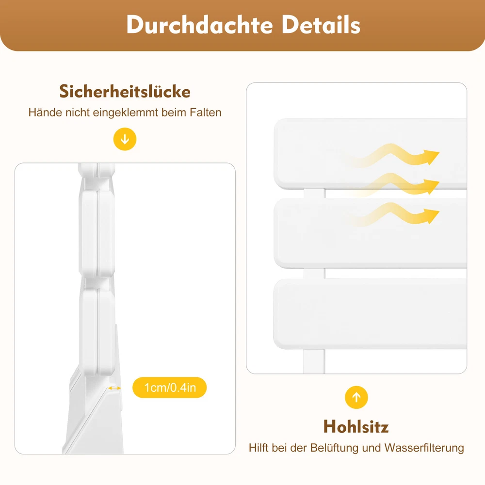 Specifications Material: Stainless Steel, Aluminum Alloy, Abs Color: White Style: Modern Surface Treatment: Injection Molding Installation Type: Wall-mounted Assembly Required: Yes Folding Degree: 90° Load Capacity: 130kg/286.6lbs Gross Weight: 1.85kg/4lbs Net Weight: 1.65kg/3.63lbs Bracket Size: 32*10cm/12.6*4in Gap Spacing: 1cm/0.4in Product Thickness: 29mm/1.14in Product Size: 32*34cm/12.6*13.38in Package Size: 33.5*37*6cm/13.2*14.56*2.36in Description Please Do Not Compromise on Comfort! the Elderly, Pregnant Women, and Those with Limited Mobility in Your Home Deserve a Better Experience. Bending over at the Doorstep Every Day to Change Shoes, Standing for a Long Time to Wash up, and Other Small Things Are Tiring for Them, and May Even Trigger High Blood Pressure. Our Folding Shower Seat Is a Wall-mounted Solution That Provides Stability, Comfort, and Safety. It Greatly Expands the Space at the Entrance or Bathroom, Ensuring Better Care for You and Your Family. Key Features Intimate Care: It Is a Necessity in Households with Limited Mobility, Providing a Safe and Supportive Seat! Standing, Bending down, Shaving or Taking a Shower for a Long Time Is No Longer a Difficult Task, for This Seat Greatly Enhancing Their Daily Shower Experience! Folding Design: This Shower Seat Is Compact in Size(12.6*13.38in) and Can Be Folded When Not in Use, Saving Valuable Bathroom Space. It Is an Ideal Solution for Those Seeking Supportive Shower Experience. Selected Materials: High Quality Aluminum Alloy Load-bearing Rods and Base, Abs Panel, and Stainless Steel Screws Provide a High Degree of Durability and Stability (Maximum Load-bearing Capacity of 286.6 Pounds). You Can Confidently Install It in Damp Environments like Bathrooms. Comfortable & Safe: Our Folding Shower Seat Features Ergonomic Dimensions, Smooth Surface, and Rounded Edges, Providing Unparalleled Comfort and Safety for Most Age and Weight Users. Exquisite Appearance: Its Elegant and Minimalist Design Makes It a Unique and Practical Shoe Changing Stool or Seat, Ideally Blending with Various Interior Decoration Styles and Adding a Touch of Refinement to the Overall Space. Waterproof Function: with Excellent Waterproof Function, It Ensures Easy Maintenance and Prevents Damage Even in Humid Environments, Allowing You to Use It for a Long Time with Peace of Mind. Simple Cleaning: the Smooth Surface and Overall Minimalist Structure Make Water and Stains Impossible to Escape! You Just Need to Gently Wipe It with a Neutral Cleaning Agent and a Towel to Make It Look Brand New Again. Easy to Install: with a Simple Structure and Clear Components, You Can Easily Install It in a Short Time, Enjoying a Sense of Achievement from Components to the Finished Product! Details Anti-pinch Gap: This Gap Between the Seat and the Wall(0.4in) Is Thoughtful and Ensures That Your Hands Are Not Pinched When Folding the Chair. Hollow Seat: the Hollow Seat Not Only Helps with Ventilation, but Also Filters Water Faster, Making It More Suitable for Bathroom Use Scenarios. Application It Can Be Used on the Walls of Bathrooms, Shower Rooms, Porches, Corridors, Living Rooms, Balconies, Changing Rooms, Daycare Centers, Saunas (Load-bearing Walls Such As Concrete, Solid Bricks, Dense Natural Stones, Steel Reinforcement, Etc.) for Adults, Pregnant Women, Children, the Elderly, and People with Disabilities. How to Install After Determining the Installation Height, Mark the Location of the Holes to Be Punched. Connect the Installation Holes to the Marked Positions. Insert the Bracket into the Body. The Support Panel Assembly Insert Inside the Tank Body. After Installation, Install the Decorative Cover. Specifications Material: Stainless Steel, Aluminum Alloy, Abs Color: White Style: Modern Surface Treatment: Injection Molding Installation Type: Wall-mounted Assembly Required: Yes Folding Degree: 90° Load Capacity: 130kg/286.6lbs Gross Weight: 1.85kg/4lbs Net Weight: 1.65kg/3.63lbs Bracket Size: 32*10cm/12.6*4in Gap Spacing: 1cm/0.4in Product Thickness: 29mm/1.14in Product Size: 32*34cm/12.6*13.38in Package Size: 33.5*37*6cm/13.2*14.56*2.36in Package Included 1*Folding Shower Seat 1*English Installation Manual All Accessories for Assembly Notes Please Carefully Read the Manual and Strictly Follow the Precautions to Have a Better Experience. Before Placing an Order, Please Ensure Accurate Measurement of Your Space and Compare It with the Specifications of This Product. Please Ensure That Your Walls Have Sufficient Support, and Low Load-bearing Walls Such As Porous Bricks, Gray Sandstone, Thin Hollow Walls, Simple Board Walls, and Gypsum Walls Cannot Be Installed. When Drilling into a Solid Wall, If It Is Found That the Wall Is Loose, the Load-bearing Capacity Is Not High, or the Screws Are Not Tight Enough, Please Install Them in Other Places or Reinforce the Wall Before Drilling and Assembling. Please Allow the Slight Color Difference Caused by the Shooting Light and 1-3cm Error Due to Manual Measurement, and Make Sure You Do Not Mind Before You Order.