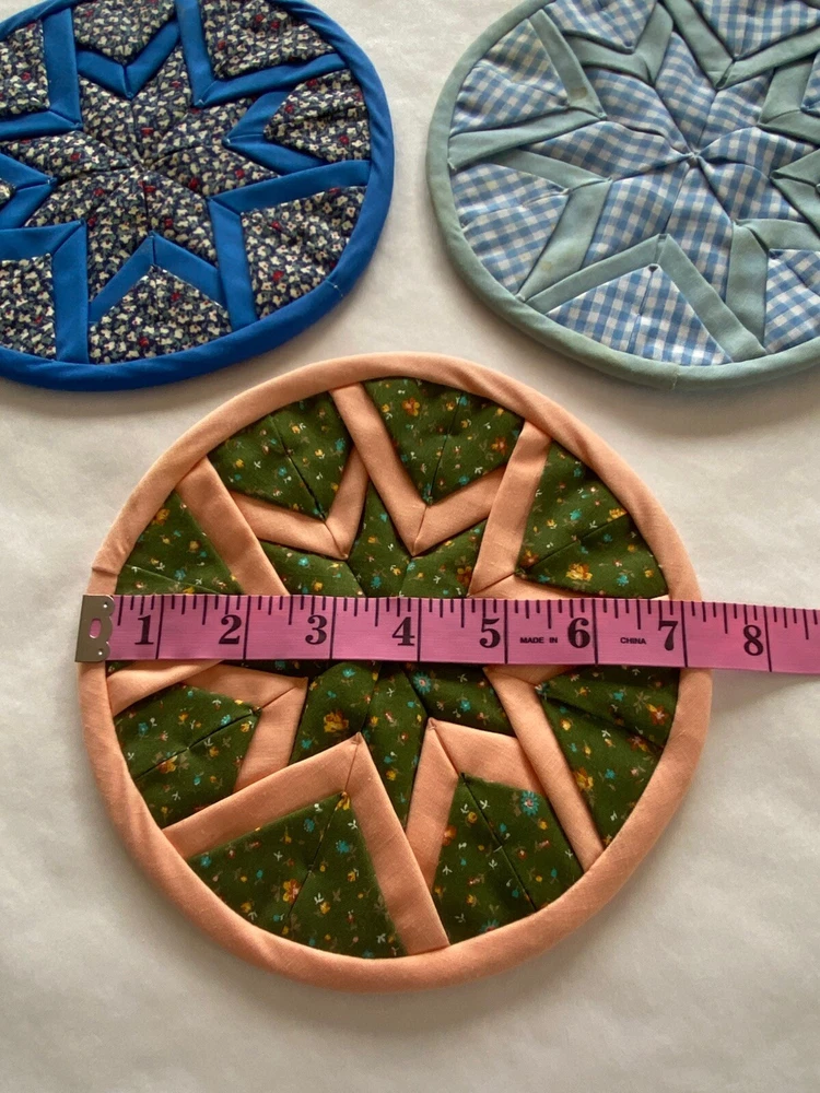 Folded Star Quilted Trivet/Potholders Set Of 3 Reversible Handmade *See photos close up for stains visible on light blue potholder*