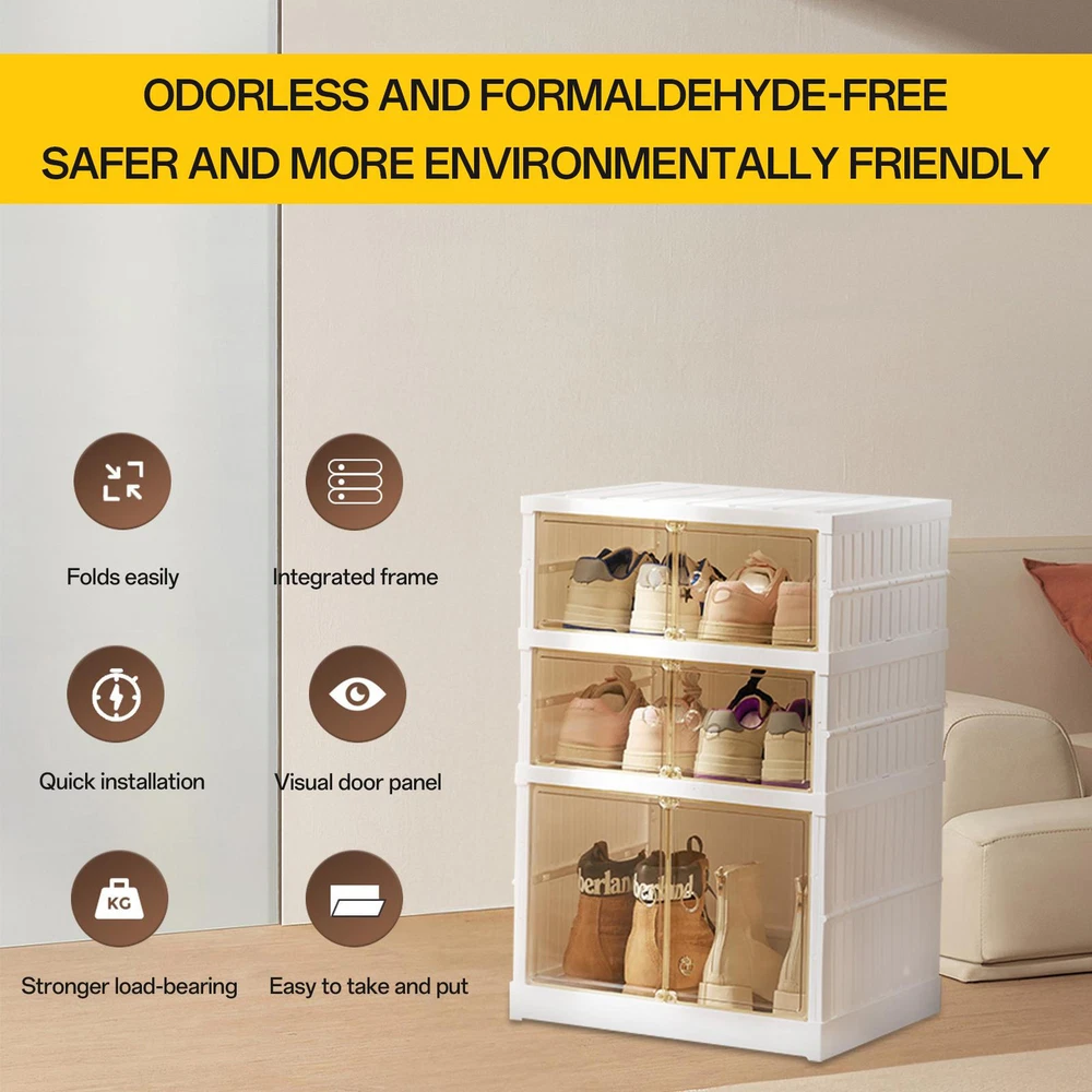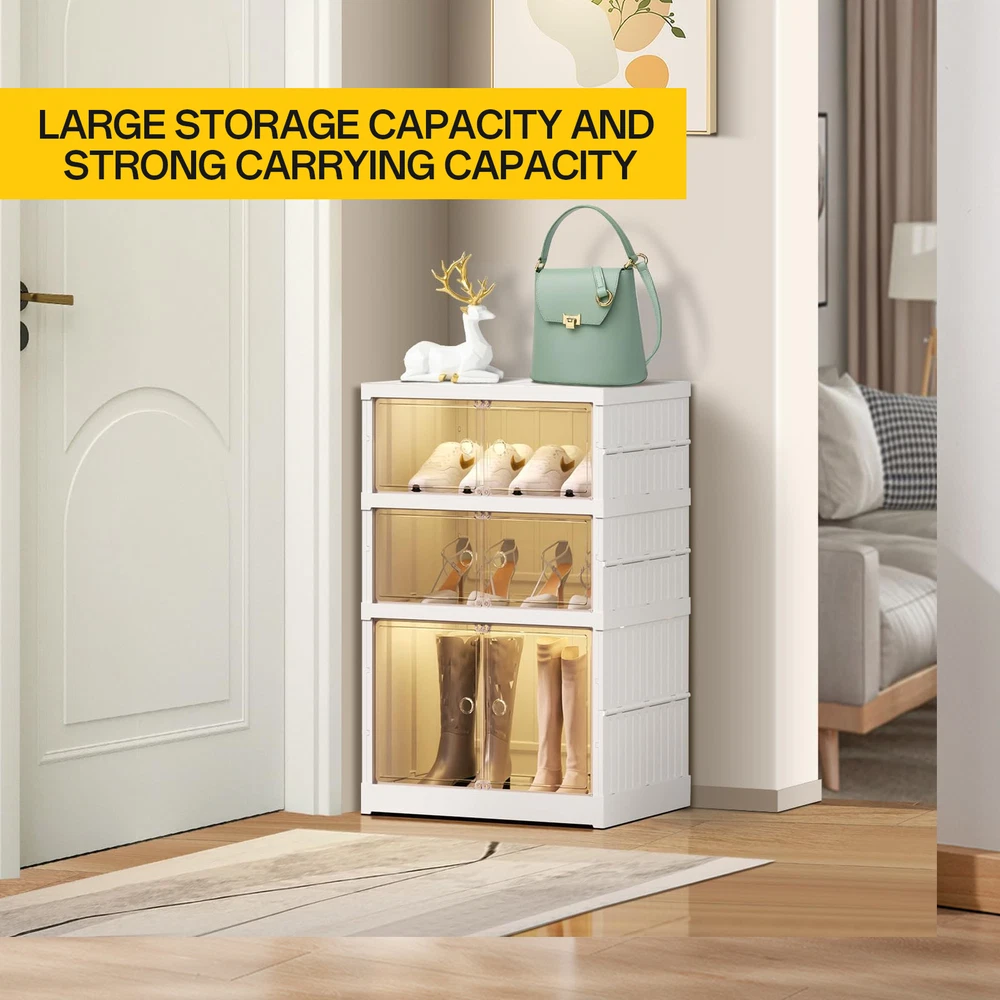Store category Sign Up Now ! You may also like Product Description Bullet Points: Quick Set-Up: With no assembly tools required, this stackable shoe cabinet can be easily folded and stored. Its smart design maximizes space and saves time on set-up and clean-up, making it the perfect storage solution for any home Optimized Shoe Storage: This folding shoe cabinet can store men's and women's shoes for most types of shoes, featuring a high boot storage design and holds 6 pairs of multi-tiered shoe racks across 3 layers Stylish Innovation: Our folding shoe cabinet features a sleek and fashionable design that compliments any decor. Crafted from high-quality PP+PET material, it reduces dust and boasts super suction power to keep the door firmly shut for added security Effortless Retrieval: Find the shoes you need quickly and easily, with a light brown transparent door that makes it easy to clean and identify your footwear collection Wide Application: Suitable for closet, bedroom, storage room, living room, and garage, this folding shoe cabinet provides versatile storage solutions, ensuring your space stays organized Organize your closet with ease using our 3-layer stackable shoe rack organizer. With super suction power, find the shoes you need quickly and efficiently. Perfect for any closet, this foldable rack will keep your shoes visible and accessible. No more shoe clutter! Specification: Product Name: Folding Shoe Cabinet Number of layers: three layers Specification: 2 short +1 high (4 pairs of shoes + 1 pair of boots) Product size: about 44x34.5x66cm/17.32x13.58x25.98 inches Product weight: about 3.8kg Color: white Packing List: 1* Foldable Shoe Rack Notes: 1. Due to different lighting and screen settings, the item color may be slightly different from the picture. 2. Due to different manual measurements, please allow a 1-2cm difference in size. Payment Delivery details Terms of sales About us Feedback & DSRs Payment Before you palce an order, please kindly make sure that you have a paypal account. We accept PAYPAL payment only. Payment should be completed within 2 days after auction closed, or unpaid dispute will be filed for an closing auction. An unpaid case will be filled after 4 days. Delivery details We ship to your eBay address. Each package will be shipped to US by UPS Regular Parcel with tracking number. Please check your shipping address carefully before checkout, it can't be changed if order completed. All items will be shipped within 1-2 business day upon receipt of payment.Orders placed on weekend will be shipped within 3 days. If you do not receive your item in 7-10 business days.please contact us immediately for further assistance. We will be responsible for any damages or losses incurred in the shipping process. About us We maintain high standards of excellence FIVE STAR and strive for 100% customer satisfaction! Positive Feedback is very important to us. We hope that you contact us immediately Before you give us neutral or negative feedback, so that we can satisfactorily address your concerns. We promise to offer the lowest price and high quality produce. Our working time: From Monday to Friday(9:30 am to 18:00pm), we don't working on holidays ,hope you can understand and know that , thank you. Please always talk to us via ebay Message. We appreciate your business and look forward to growing our e-Bay sales with satisfied customers. Feedback Contact us If you have any questions, please feel free to contact with us by ebay Message during our business hours ( 9:30a.m. to 5:30 p.m.), or email us through eBay, we will try our best to help you to resolve it. For any presale or after-sale questions,please do feel free to email us! Due to the time difference, each email will be replied within 1 working day,and weekend will be delayed a bit. Feedback