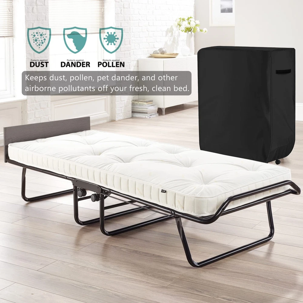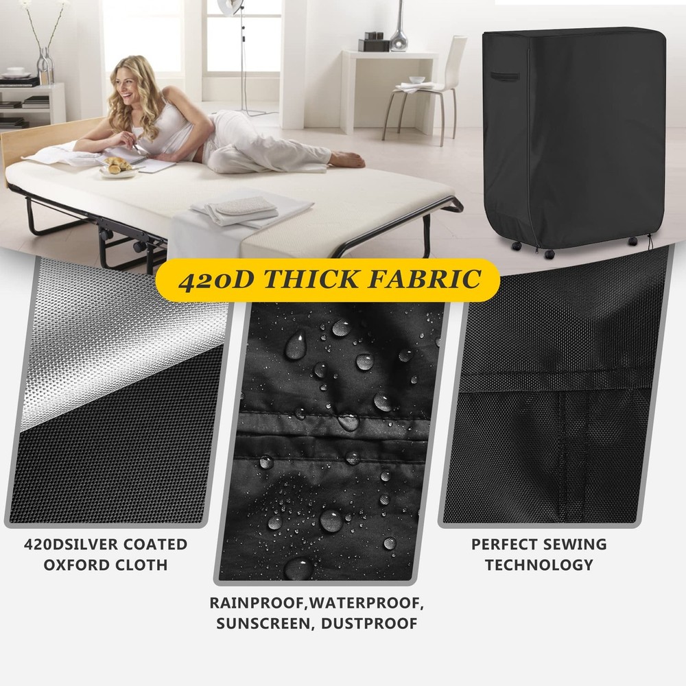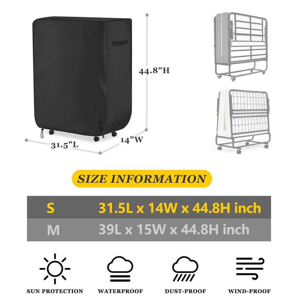 Features: 1. Use 420D Oxford cloth, snow and frost proof in winter, dust and sun proof in summer, leaf proof in autumn, universal in all seasons. 2. With tear resistance, weather resistance and good breathability. 3. folding bed storage cover can better protect furniture from the sun, rain, snow, leaves, etc. 4. Folding bed protective cover can be cleaned by just washing or wiping, light weight. 5. Suitable for swimming pool beach chairs, patio folding beds, folding chairs, etc. Specifications: Condition: 100% brand new Product Type. Rollaway bedspread Material: 420D Oxford cloth Color : Khaki Applicable scenes: swimming pool beach chairs, patio folding beds, folding chairs Rollaway bed storage cover size: Small Single:31.5"L x 14"W x 44.8"H Twin:39"L x 15"W x 44.8"H [PRODUCT SIZE]- 31.5 " L X 14 " W X 44.8 " H, suitable for folding bed 31 " and below, the coverage depends on the height of the folding bed, please carefully measure the size of the folding bed before buying [PRODUCT DESIGN] - Folding bed cover design makes it more suitable for long-term storage. Rectangular storage bag with zipper and carry handle is designed to protect the folding bed from the risk of stains, damage and moisture once the Rolla bed cover is over the folding bed. Makes the folding bed perfect for long-term storage in garages, storage rooms, basements and spare rooms. [PRODUCT MATERIAL]- Using 420D Oxford cloth, winter snowproof and frostproof, summer dustproof and sunproof, autumn anti-fall leaves, four seasons. With tear resistance, weather resistance and good breathability [EASY TO USE]- Rollaway bed protector can only be hand-washed or wiped with a damp towel to clean the dust, machine washing will damage the silver coating layer [1-YEAR ]-offers a 1 year manufacturer's on its products. If you have any questions, please contact us. can also be given as a gift to your family or friends