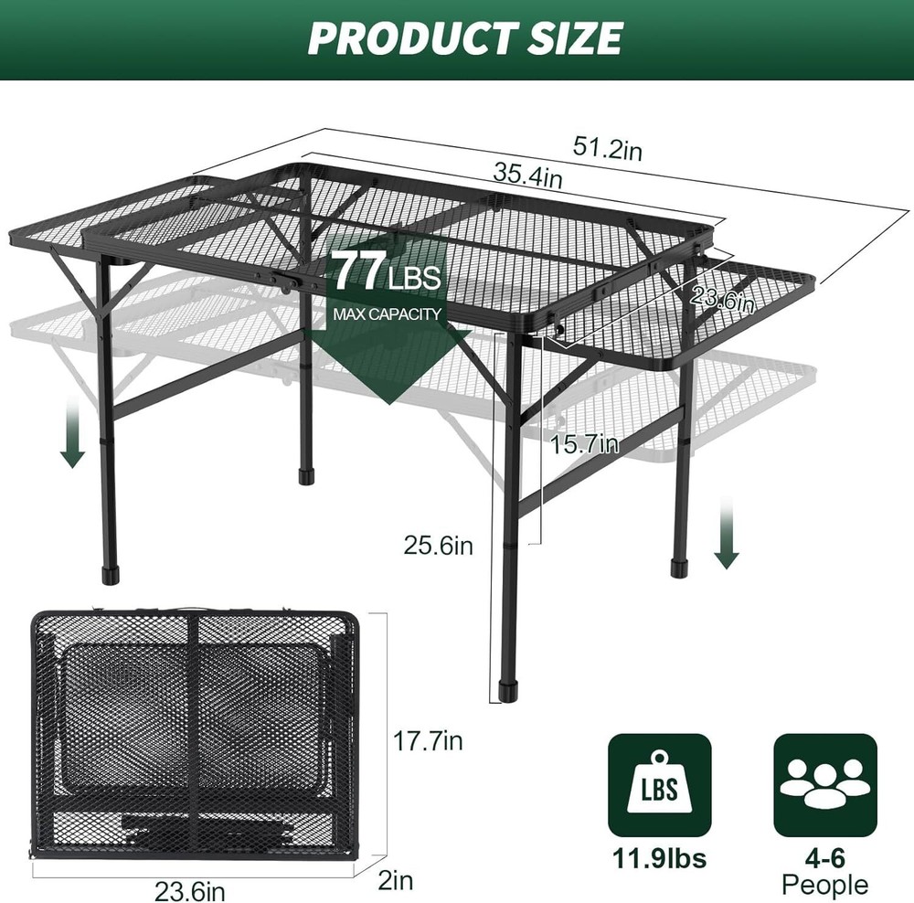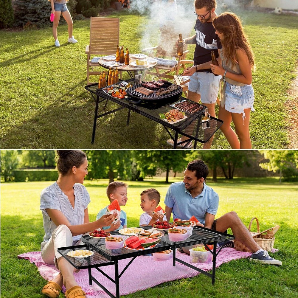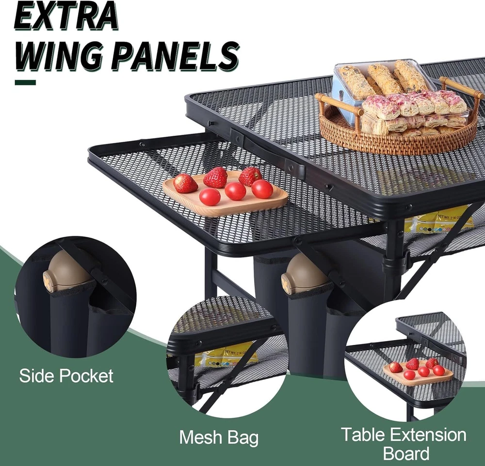Folding Camping Grill Table with 2 Wing Panels and Mesh Desktop