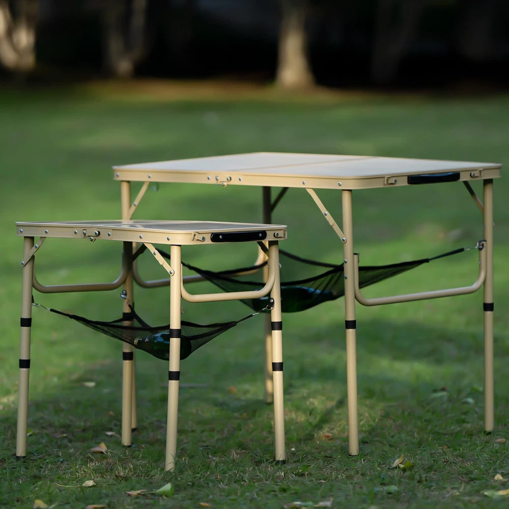 Unique Design: The surface of this camping folding table is made of spray-coated technology, which has a better texture. The high-grade yellow color shows a unique taste and style. It can be perfectly matched whether it is used at home or outdoors Extra Storage Space: The portable camping table with mesh storage tier and S hooks provides more space. When camping, you can put some small kitchen tools, snacks, flashlights on the mesh tier. The S hooks can to be hanged speakers, equipment,etc 2 Height Adjustable: The camping table can be adjusted to 2 different heights, suitable for a variety of needs. If the ground underneath the camp table is uneven, simply adjust the table legs to stabilize it Portable & Foldable: This Aluminum folding table measures 35.6" x 23.7" and weighs only 9.1 lbs. When folded, it can be placed in any limited space. It's easy to carry with comfortable handle. It also unfolds quickly without tools Versatile to Use: The picnic Folding Table is easy to assemble and perfect for outdoor and indoor use. It's ideal as a patio table, laptop table, dining table, picnic table, beach table, or BBQ table. You can take the table to travel wherever you want