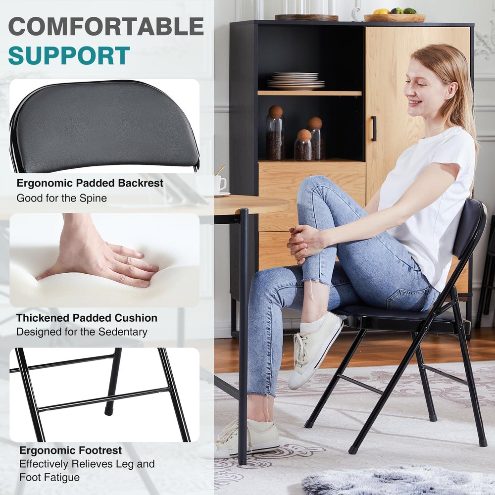 These folding chairs are a game-changer! The plush cushioning and soft PU leather make them incredibly comfortable, whether for work or relaxing. The sturdy metal frame feels solid yet lightweight, and the foldable design makes storage a breeze. Perfect for home, office, or outdoor use—love the sleek black finish too!