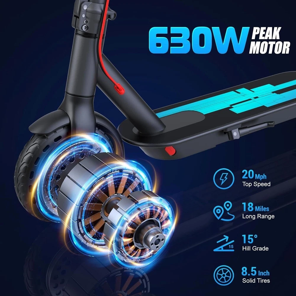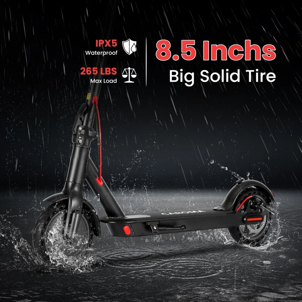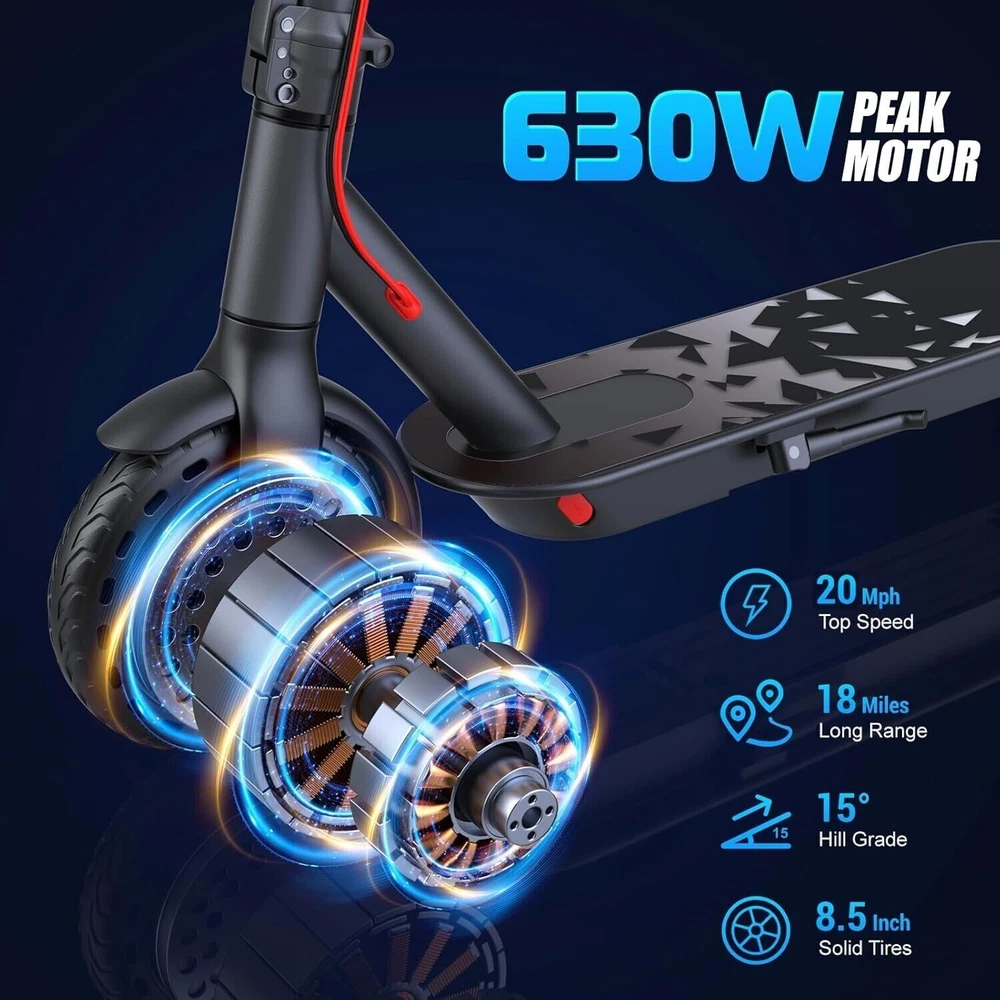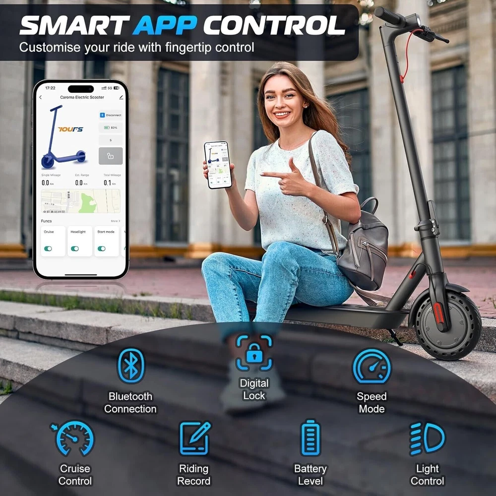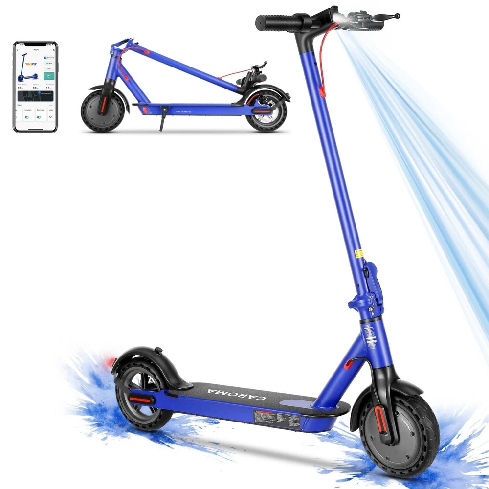 Product Description About this item Powerful Motor: CAROMA electric scooter for adults features a peak 630W front-wheel motor, delivering strong and efficient performance. It can reach speeds up to 20 MPH, making it perfect for both quick commutes and leisurely rides Long-Range Battery: Equipped with a 36.5V battery, this e scooter for adults offers a maximum range of 18 miles on a single charge. This ensures you can travel longer distances without worrying about running out of power, ideal for daily use Adjustable Speed Modes: Caroma electric scooter adults comes with three speed modes: 6 MPH, 10 MPH, and 20 MPH. This allows you to easily adjust your speed to match different riding conditions and preferences, offering flexibility and control Durable Tires and Brakes: Featuring 8.5-inch solid, puncture-proof tires, you can ride Caroma adult scooter confidently on various terrains without the fear of flats. The rear-wheel disc brake provides high stability and excellent braking performance for added safety Lightweight and Portable: Weighing only 27.5 lbs and featuring a foldable design, this motorized scooter for adults is easy to carry and store. Despite its lightweight frame, it supports up to 265 lbs, making it suitable for a wide range of riders. The LED display shows speed, mode, and battery life for added convenience Bright Lights: Caroma electric scooter comes with a headlight and taillight to keep you visible at night, which ensures your safe while riding in the dark Connected to APP: Caroma e scooter can be connected to the APP in your phone by bluetooth, and you can view battery level, mileage, riding record and control buletooth, digital lock, cruise system, speed mode and light on your phone about the scooter