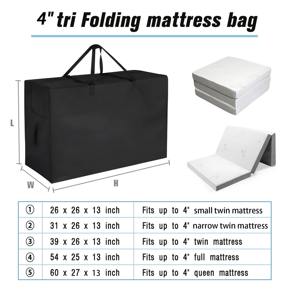 Size:39 x 26 x 13 inch(Not included mattress); It is with open mattress measures 75 x 38 x 4 inch,folded mattress measures 38 x 25 x 12 inch tri-folding twin memory foam topper.Note: The bag does not fit 6 inch Thickness of the mattress Material: The twin tri foldable mattress cover is made of lightweight oxford material, which is tear-resistant and can protect and your folding mattress well Portable Design: The carry bag of trifold mattress is designed with a premium quality 3-side metal zipper, which makes it easy to put your folding mattress in, and the handles on both sides can be easily moved.note:The package may have an unpleasant odor when first opened. You can take the product out and let it sit for a while until the odor dissipates before using it Multiple protection: The bags can be dustproof, waterproof, sunscreen, and can also prevent pets from damaging the mattress. The zipper is not waterproof, please do not place it for a long time in rainy days. Service: hopes to bring you a pleasant shopping experience. If you have any questions in the process of purchasing and using,you can us in time