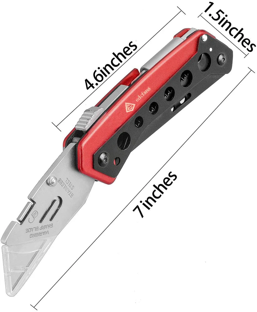 【Built to Last】- Aluminum alloy handle of Pocket Knife with black and red grit blasting for durability and longevity. Stainless Steel blade head is sturdy and rustless. Each Box Cutter come with 10 SK5 stainless steel blades which are hard and sharp. 【Multi-function tool】- This retractable Utility knife features a box cutter, small saw, fruit knife, flat head/Phillips screwdriver etc. Ergonomic comfort grip handle design for increase friction to anti slip and save labor. 【Quick Change Blade】- Quick-change blade mechanism for easy installing and releasing knife. This folding knife can Work quickly and easily. Lock the blade tightly and helps prevent injury. The utility knife blade is sharp enough to cut boxes, rope, carpet, plastic, leather, wallpaper etc. 【Safety Design】- With lock back and Liner lock release design, Pocket Knife safely locks the blade in place when in use. Secure folding mechanism makes sure no accident opening when Box Cutter in your pocket. Transparent plastic protector on the blade tip prevent hurting when not in use. 【Easy Carry】- Weight 6.76 OZ tactical knife with potable and convenience belt clip design easy to clip on your belt or backpack. You can carry the utility knife with the nylon sheath we give too. Such a useful EDC outdoor gadgets for office, home, work, hiking, camping.