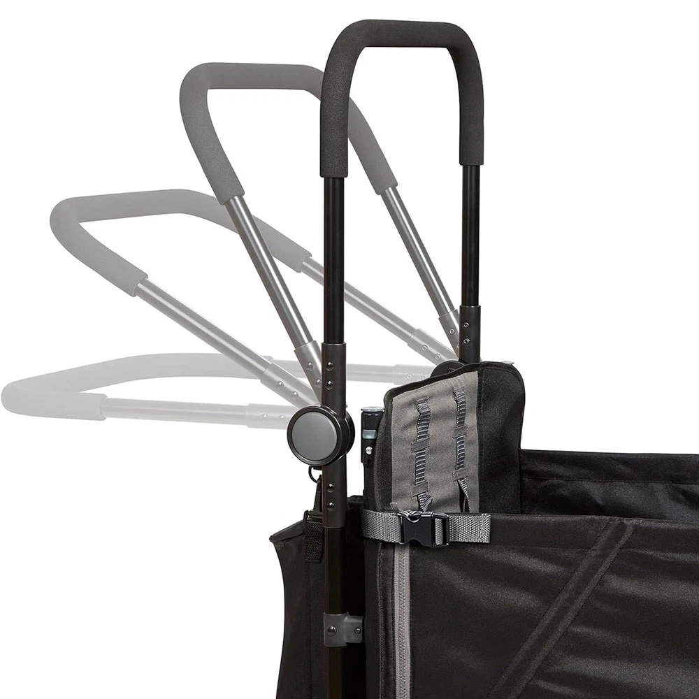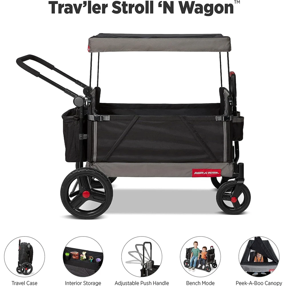 Baby Wagon Smooth Ride: Toddler wagon keeps kids comfortable on the trail, beach, or wherever life takes them; Suitable for ages 1 year and up and accommodates up to 120 pounds Push Pull Wagon Features: Separate handles in front and back are adjustable and collapsible, making it ideal as a pull toy or as a push wagon for kids Toy Wagon Compact Design: Easily foldable Radio Flyer wagon with a convenient travel case for easy storage and access to toddler outdoor toys during family journeys Toddler Push Cart Convenience: Includes travel wagon cup holders, interior mesh pockets, and enough space for up to 2 kids; Baby wagon toy converts to bench mode for seating Kid Wagon Safety Features: Rear foot brake, 5-point safety harness, and Ultra-Violet protective canopy with peek-a-boo mesh keep your children secure while riding the all terrain stroller wagon Product Dimensions 47.24"D x 24.41"W x 41.34"H Material Fabric Color Black Special Feature Portable Product Dimensions 47.24"D x 24.41"W x 41.34"H Material Fabric Color Black Special Feature Portable Number of Shelves 1 Target Audience Unisex Adult Handle Material Aluminum Item Weight 37 Pounds Number of Wheels 4 Weight Limit 120 Pounds Assembly Required Yes Caster Type Pneumatic Frame Material Metal Item Weight 37 pounds