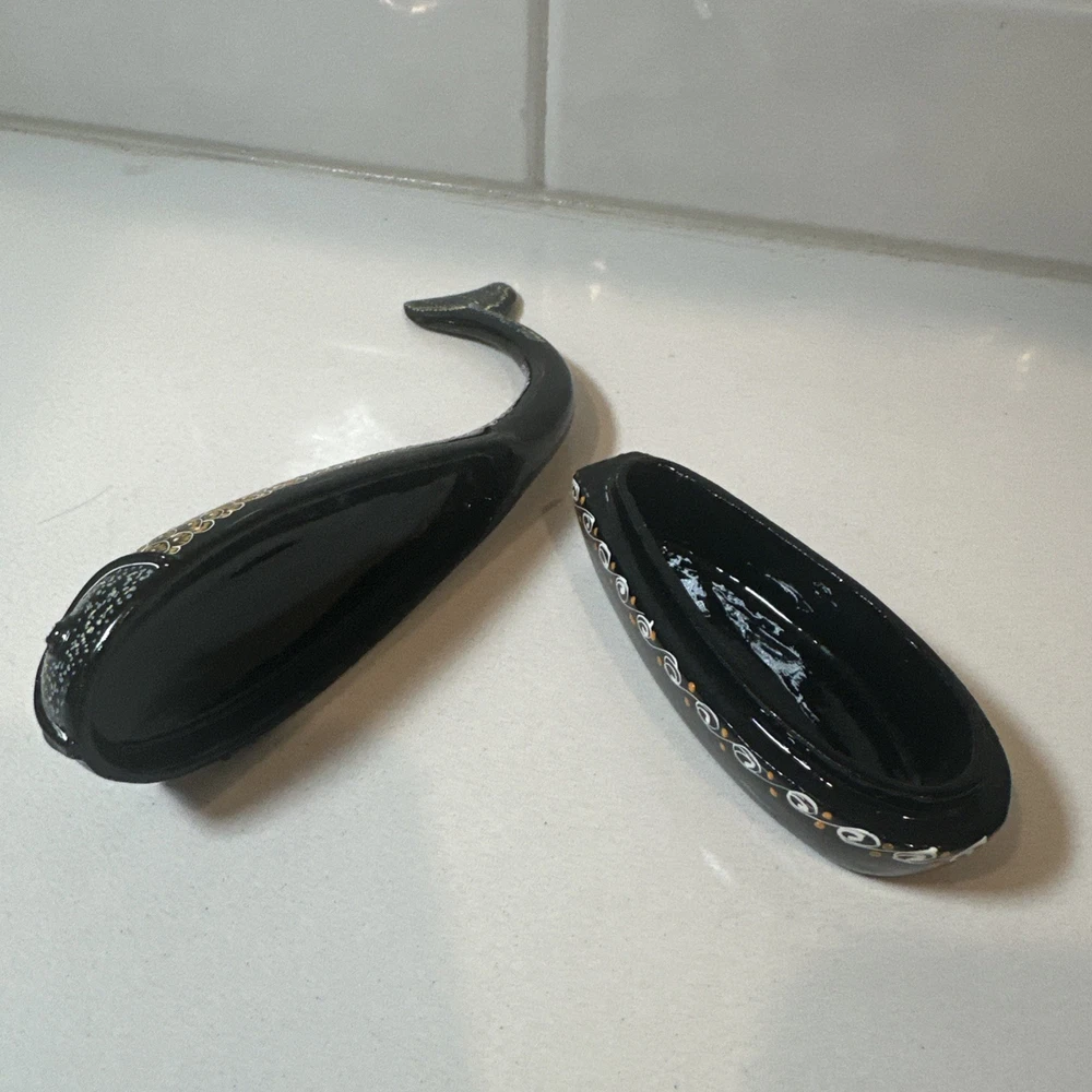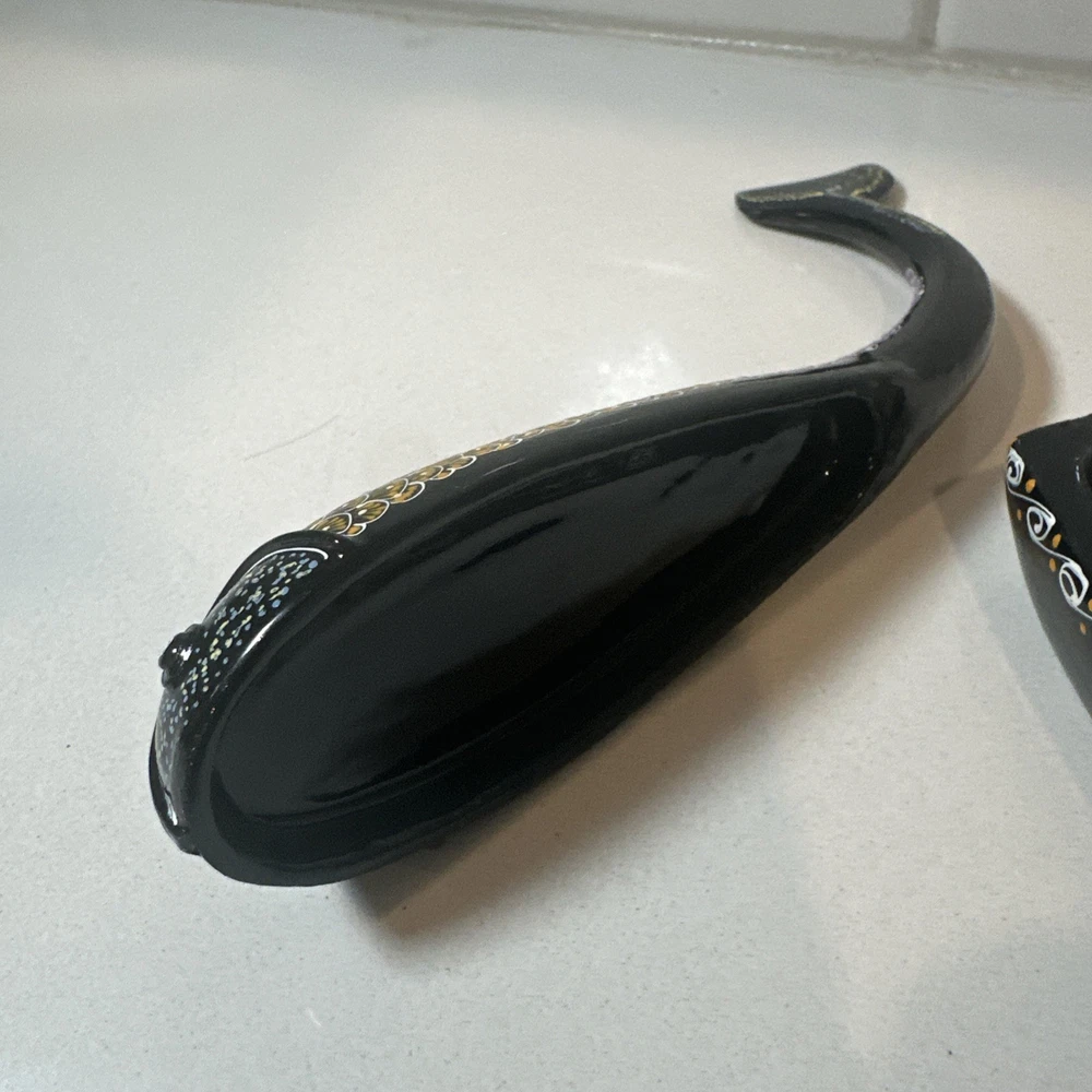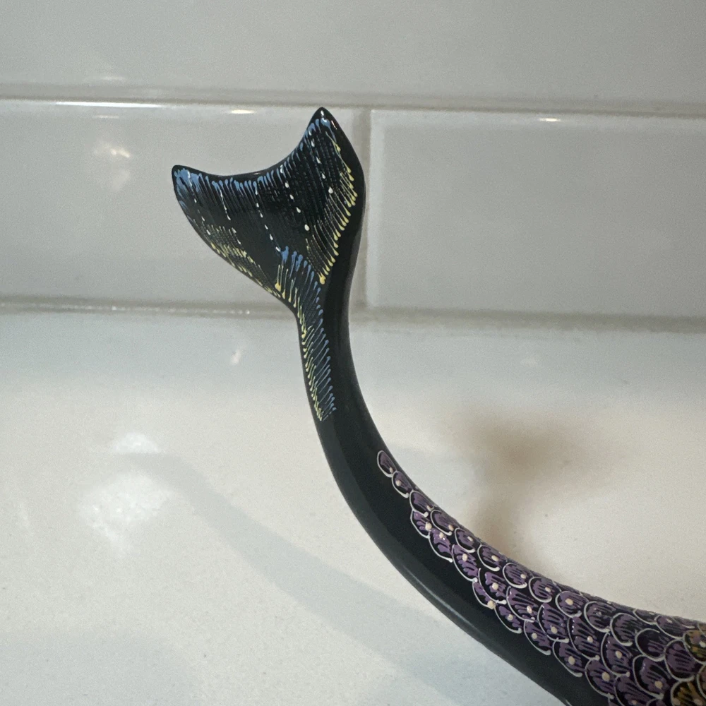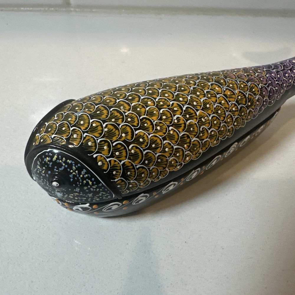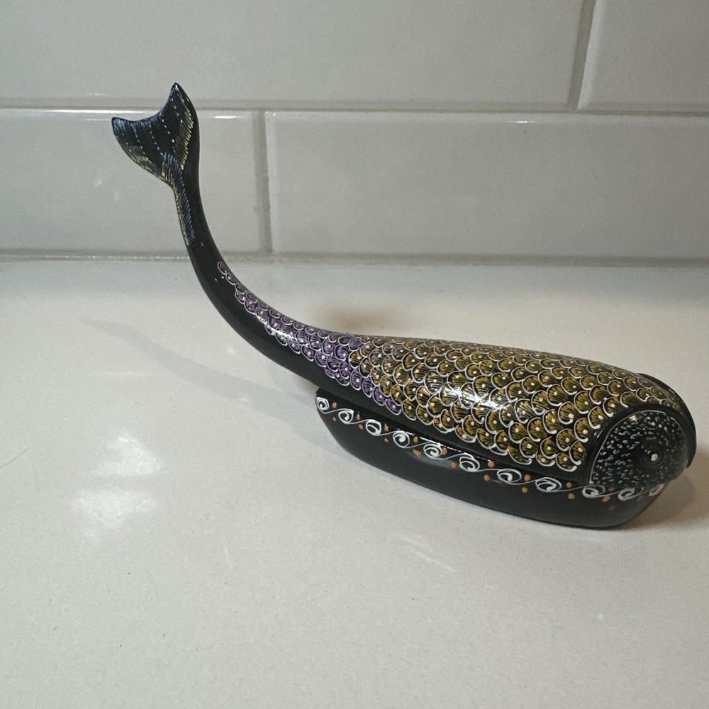 Folk Art Whale Fish Trinket Box Black Lacquer Wooden Hand Painted Multicolor