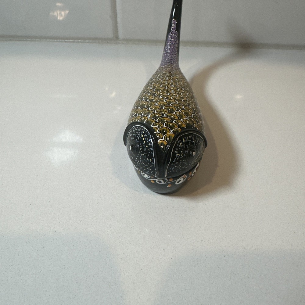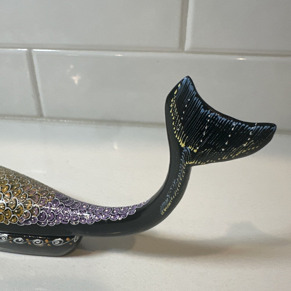 This Folk Art Whale Fish Trinket Box is a handmade collectible piece from the 1980s, featuring a bohemian pattern and a medium size of 7.5 inches long, 3.5 inches high, and 1 1/2 inches wide. The black lacquer wooden box is hand-painted with multicolor accents, showcasing a whale shape and a black hand character. Perfect for all occasions, this original trinket box from Russian Federation adds a touch of art and style to any decorative collection.