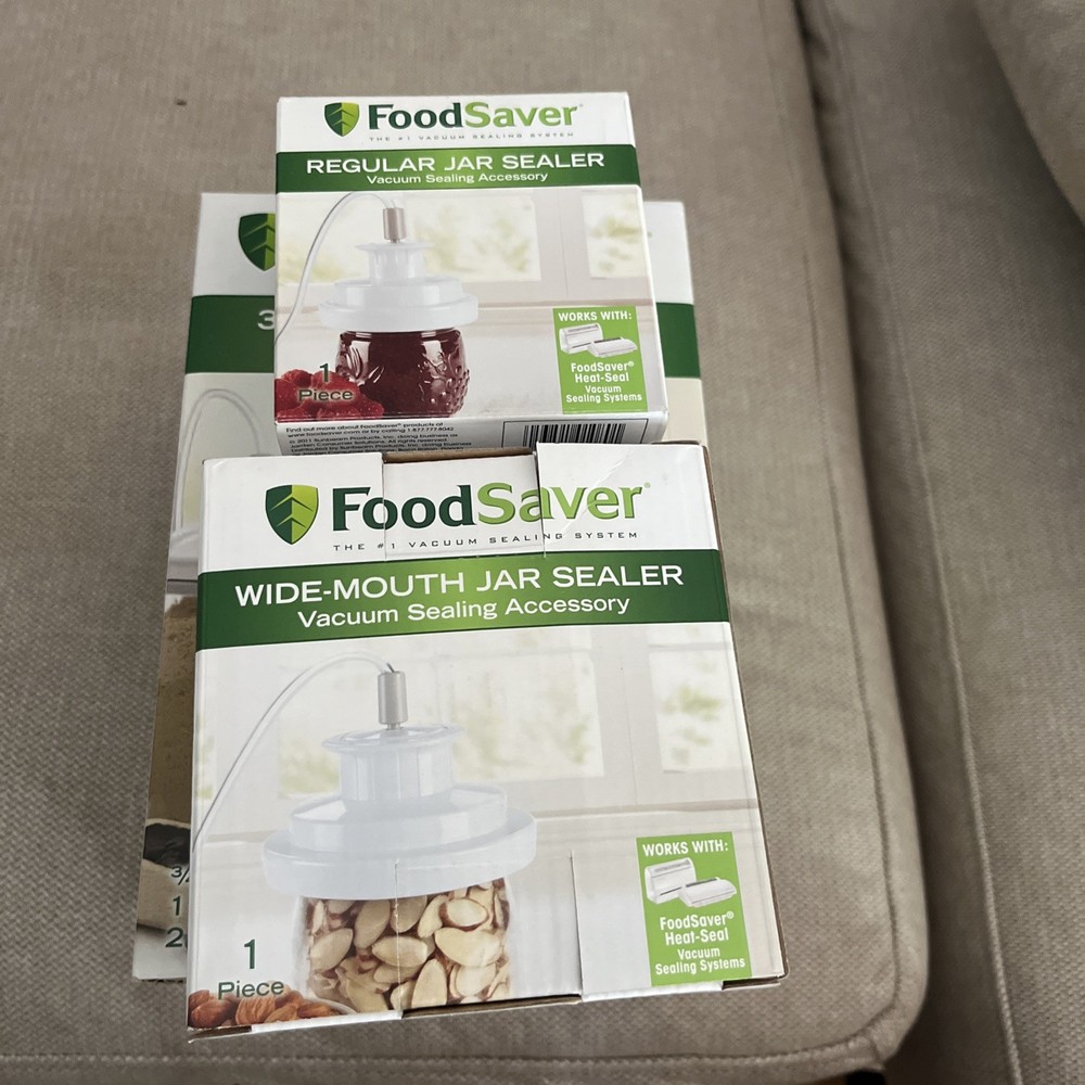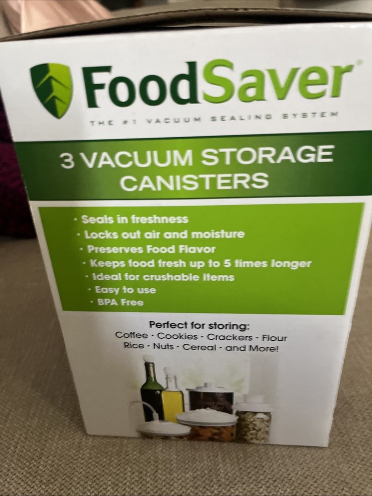 New in box never used. 3 vacuum storage canisters for use with a FoodSaver heat-seal vacuum sealing system. Will add the wide mouth and regular mouth sealers at no additional cost. 3/4 , 1 1/2, 2. 1/2 capacity containers