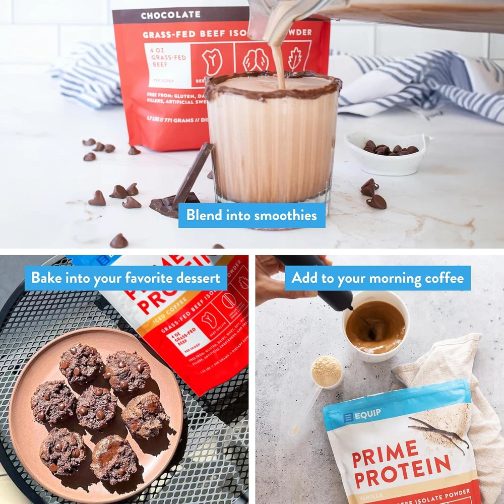High Protein, Low Sugar: Prime Protein delivers 21g+ of bioavailable complete protein made from grass-fed beef, making it an excellent choice for your keto, paleo, carnivore or protein-forward diet. Unlike other protein isolate powders, it is free from added sugar, soy, dairy, gluten, egg, and whey. Equip’s grass fed beef protein powder is perfect for clean, bloat-free nutrition and contains the same amount of protein as 4oz of steak. Support Muscle Growth & Recovery: Packed with collagen, gelatin, and essential micro-nutrients, Prime Protein is ideal for recovery or building muscle post workout, for both men and women. Blend it into your drinks, smoothie or shake for nutritious pre- or post-workout fuel or incorporate it into your favorite dessert recipe for an added protein boost. Delicious Dessert-Like Flavors: Choose from 6 indulgent flavors, all made with only a handful of real-food ingredients and naturally with stevia, including chocolate, vanilla, unflavored, strawberry, salted caramel, peanut butter and iced coffee. Prime Protein is a delicious way to enjoy whole-food protein, making it a great alternative protein supplement to bone broth for those with a sweet tooth. Clean, Pure Ingredients Only: Say goodbye to unnecessary additives. Prime Protein is crafted with the best real, whole ingredients, offering a pure, nutrient-dense protein blend without fillers, artificial flavors, or junk. Made with Care & Guaranteed Quality: Prime Protein is 3rd party tested. If you are not satisfied with your first purchase, we offer a 30-day refund or replacement. Please note that Amazon doesn't accept food product returns, so reach out to us directly for quick assistance. Product Description Clean Nutrition That's Truly Delicious Add to Cart Add to Cart Add to Cart Add to Cart Add to Cart Add to Cart Add to Cart Customer Reviews 4.6 out of 5 stars 484 4.6 out of 5 stars 484 4.7 out of 5 stars 395 4.2 out of 5 stars 141 4.1 out of 5 stars 41 4.4 out of 5 stars 31 5.0 out of 5 stars 23 Price $47.99 $ 47 . 99 $49.99 $ 49 . 99 $49.99 $ 49 . 99 $54.99 $ 54 . 99 $56.99 $ 56 . 99 $24.99 $ 24 . 99 $46.99 $ 46 . 99 Item Form Powder Gummy Powder Powder Powder Whole Bean Capsule Servings 30 30 30 30 20 - 30 Calories Per Serving 10 38 60 20 50 - 5 Goals & Benefits Vitality, gut health, immunity Gut health, immunity Joints, gut, tissues, skin Focus, energy, recovery Post-workout recovery Gold standard taste and purity Detox, digestion & metabolism Gluten, dairy and soy free ✔ ✔ ✔ ✔ ✔ ✔ ✔