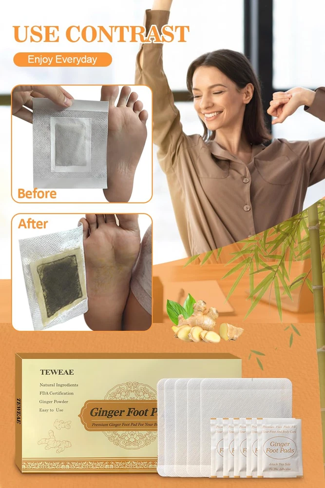 1. ginger foot pads: Larger breathable adhesive sheet, comfortable and not easy to fall off 2. Ingredient List: Vinegar-35%, Ginger -30%, Wood Vinegar-4%, Anion -3%, Plant Fiber-6%, Tourmaline-3%, Dextrin-15%, Chitin-4% 3. Directions: 1) Clean both feet with warm water and let them dry. 2) Attach the foot pads to the center of the adhesive. 3) Peel off the protective tape from the adhesive. 4) Attach the foot pads to the soles of the feet 4. Tips:We recommend sticking the foot for 6-8 hours to the best results. The best time to paste is before going to bed at night 5. Tips:Clean your soles of feet, we recommend cleansing with a wet tissue in the summer and a towel in the winter