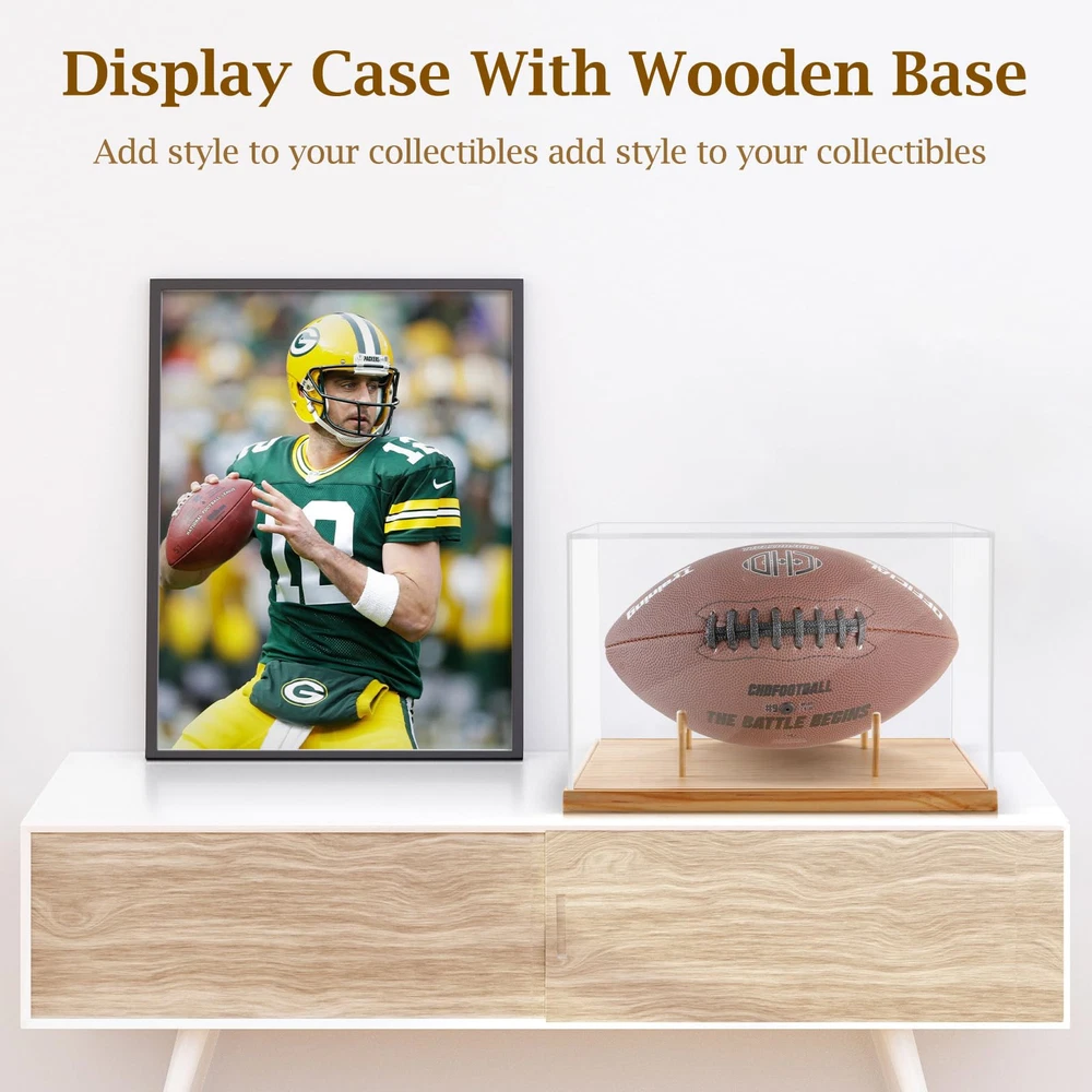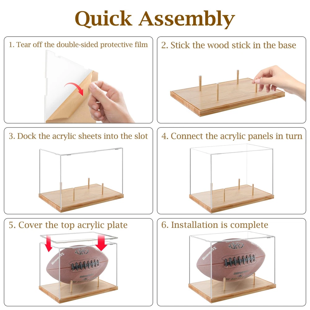 Football Display Case Full Size:Acrylic box inside size: 11.7”x 7”x 7.4“, wooden base size:12.2”x 7.48”x 0.59“. This football case size is designed to fit most footballs. It is recommended to measure the size of the football before buying. High Transparent Acrylic: Football case display clear is made of the highest quality acrylic material, the vision is clear and the high transparency makes the collection in the box achieve a better display effect. Antioxidant Protection:Displaying your memorabilia, keeping clean from dust, but also antioxidant and UV protection, can well protect the items inside from the external environment, protect your signature collection from fading. Easy Assembly:Display case is composed of 4 clear acrylic panels and a wooden base.The installation only needs to insert the acrylic panel into the card slot. The base xith 4 small detachable wood sticks. (Peel off the protective film before use) Multi functional Applications:Wooden base football display box not only meets your storage needs, but also adorns your space. You can use it to your models, trophy, perfume and plaything etc. It is the best choice for collectors and sports enthusiasts.