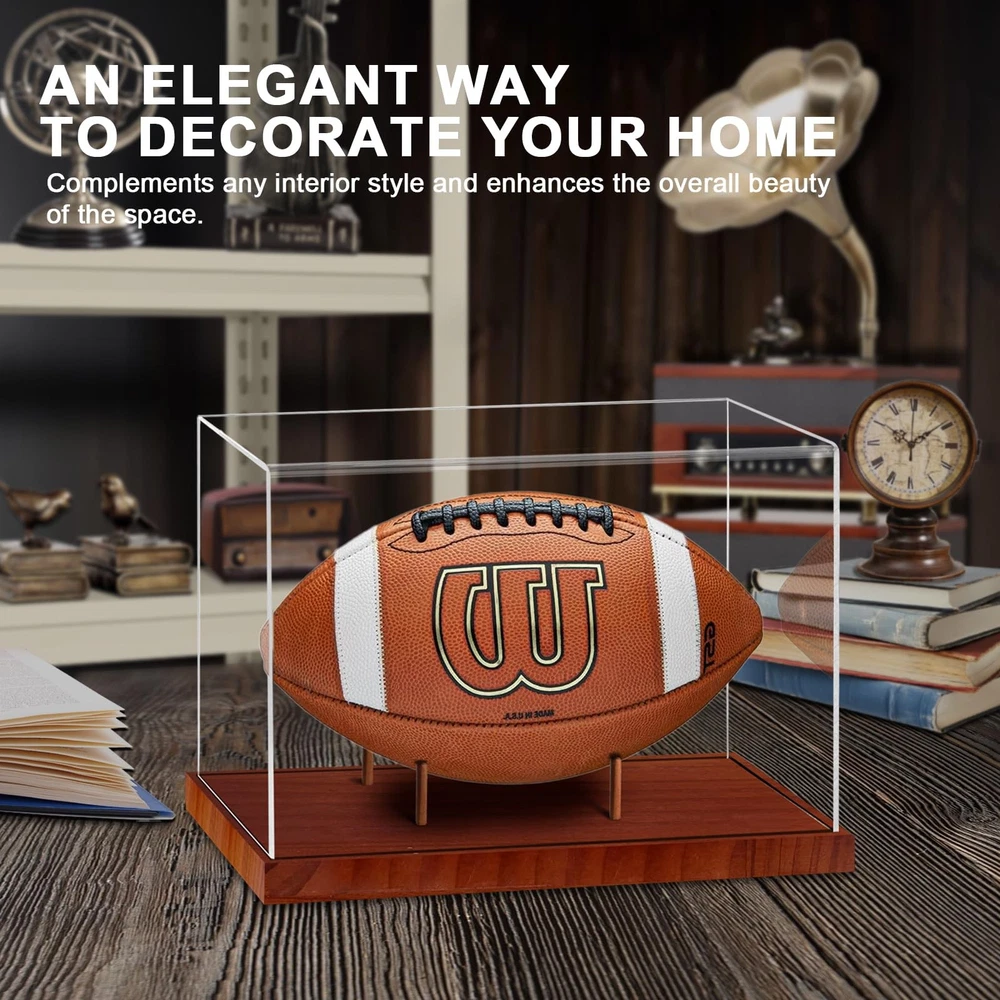 We specialize in crafting premium acrylic football display case, empowering brand retail presentations through innovative design. Created by professional designers and exported worldwide, our cases perfectly showcase footballs, figurines, and collectibles in both home and window settings. Featuring smart spatial optimization for organized storage, they transform collections into eye-catching focal points for both special events and everyday display. Premium UV-Protected Acrylic & Solid Wood Construction: Crafted with museum-grade acrylic walls 30% thicker than standard displays (3mm thickness), the football case features advanced 99% UV-blocking technology to eternally safeguard autographs from fading. Its hand-polished crystal-clear enclosure harmonizes with a rugged acacia wood foundation, creating an heirloom-quality preservation system designed to protect your memorabilia for generations. Vintage Elegance Reimagined: The substantial acacia wood base showcases nature's artistry through its warm vintage-brown woodgrain finish. Effortlessly assemble your display by inserting the wooden support rods, positioning your football, and securing the seamless acrylic case. Enhanced with four 0.78" non-slip silicone pads, the base maintains immaculate surfaces while ensuring unwavering stability - transforming your collectible into a sophisticated centerpiece that commands attention. Innovative Angular Display Architecture: Meticulously engineered at 12.9"x7.5"x8.3", this football display case perfectly cradles standard-sized footballs. Four strategically placed cylindrical wood risers elevate your ball at an optimized angle, creating dynamic visual depth. More than a case, this is a kinetic sculpture celebrating athletic legacy - designed to stir passion in sports connoisseurs and casual fans alike. Multiple Display Options: The Football case with removable wooden rod system accommodates diverse memorabilia configurations. The interplay between industrial-grade transparency and organic wood textures creates chameleonic versatility - equally at home in modern loft spaces, traditional studies, or corporate trophy rooms. Its timeless walnut patina adapts to evolving décor while perpetually enhancing spatial aesthetics. Ideal Gift for Football Enthusiasts: Transcend ordinary display solutions with this excellent quality acrylic and artisan woodcraft. Unlike flimsy alternatives, every architectural detail - from molecular UV filters to precision-milled joinery - serves both form and function. The ultimate expression of fandom, this museum-quality acrylic display case displays precious memorabilia to perfection, making it the perfect gift for those who.