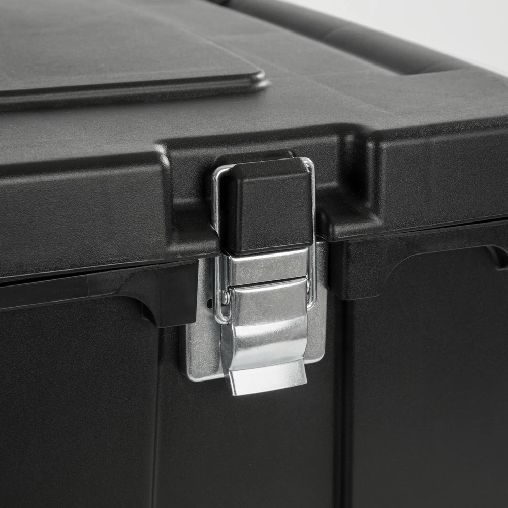 Need a durable and portable storage solution for camping or moving? The Footlocker is the ideal multi-purpose solution! It offers ample storage capacity and quality construction that is ideal for storing camping gear, sporting equipment, and more. Pack it up and use it to move into a dorm room, and keep your items concealed in your living space for easy access. Smooth rolling wheels and ergonomic handles allow for easier transporting of heavy loads. Use the integrated side handles or the full grip bail style handle when carrying lighter loads. The footlocker utilizes metal hinges and latches and accepts a standard-size padlock for added security. The overall assembled dimensions of this item are 31 1/4" L x 17 5/8" W x 13 7/8" H. Plastic Footlocker Adult Black Outside Dimensions: 31 1/4" x 17 5/8" x 13 7/8" Interior Dimensions at bottom: 26 1/2" x 13 3/4" x 12 3/8" Durable construction makes it the ideal solution for storing items in the garage, attic or basement or for transporting to camp or college Choose between the integrated handles on the sides of the Footlocker or the full grip bail handle when transporting Wheels allow Footlocker to be easily moved without having to carry it Features metal hinges and latches and accepts a standard size padlock for added security BPA-free and phthalate-free