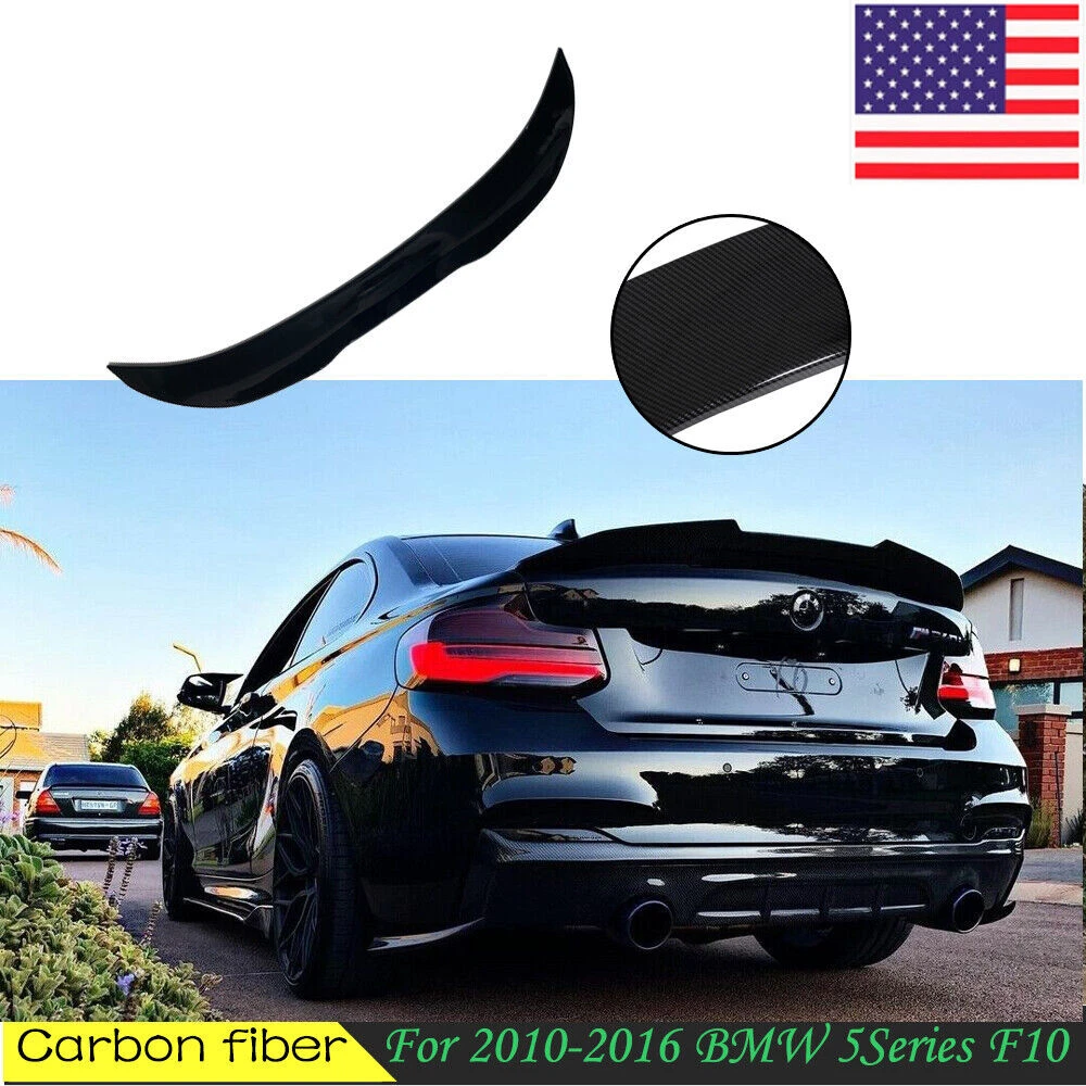 Description: We appreciate you place an order. If you are satisfied with the item, please take a moment to reward our efforrs by leaving us a POSITIVE FEEDBACK and perfect " 5 STAR" scores. If you intend to leave a neutral or negative fe edback, please contact us firstly, so that we can satisfactorily address your concerns and rectify any issues. Specifications: Product Name: Rear Trunk Spoiler Style: PSM Style Spoiler Color: Carbon Fiber Look Material: ABS (Acrylonitrile Butadiene Styrene) Surface Finish: Painted Placement on Vehicle: Rear Quantity: 1 PCS Gross Weight: 4.51lb Package Dimensions (L x W x H): 51.57''*10.62''*2.75''(132*33*8cm) Features: - 100% Brand New - High Quality ABS Plastic and Durability - Will Dramatically Improve the Sporty Appearance and Performance for BMW - OEM Fitment and Easy installation Direct Adhesive Fitment: Fit For BMW 5 Series F10 M5 Sedan 2010-2017 WILL NOT FIT ESTATE/TOURING (The Compatibility Is Just For Reference. Please Compare With Your Original One Before Purchasing! ) Note: 1.We provide clear pictures, measurements where possible. Please check as much as possible to make sure the item is the one that you need. 2.Please allow 0.5-1 inch difference due to manual measurement. (1inch=2.54cm) 3.Instruction is not included. Professional Installation Is Highly Recommended! 4.The color of the actual items may slightly different from the listing images due to different computer screen, thanks for your understanding. Package Included: 1x Rear Trunk Spoiler INSTALLATION: This Product Recommends Professional Installation. Any damage during installation will not be refunded. Professional installation is strongly recommended. On Jan 7, 2025 at 08:13:50 PST, seller added the following information: