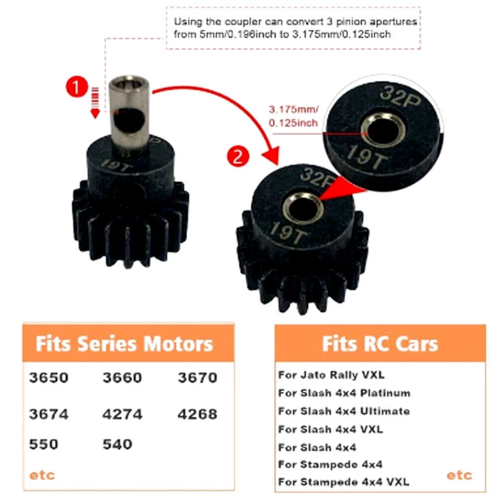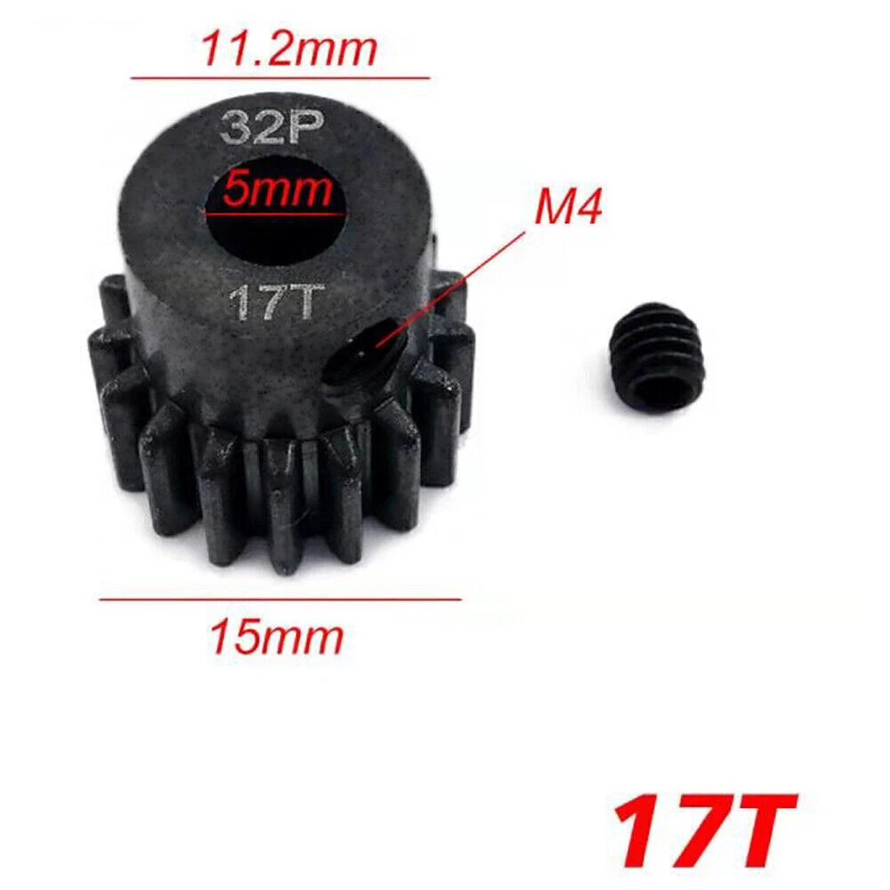 Product Description If you have any questions, please contact customer service first, do not open disputes easily, thank you! Feature: 1, Made of high-strength alloy steel and with M4 screws to prevent slipping 2, High precision steel gear 3, 0.8 metric pitch, compatible with 32-pitch 4, Suitable for 1/10 Traxxas Slash 4x4 Stampede 4x4 VXL Rustler 4X4 E-Revo Note :Suitable for motors with 5mm shaft diameter, 3660 3670 3674 4274 4268 series motors, not suitable for 3650 motors Specification: Item: 32P Steel Metal Gear Color: Black Screw: M4 Inner diameter: 5.0mm Package List: 1 * 15T 1 * 17T 1 * 19T 1 * 54T 3 * Conversion axis 1 * Screwdrive About Us We accept all payments authorized by eBay. powered by