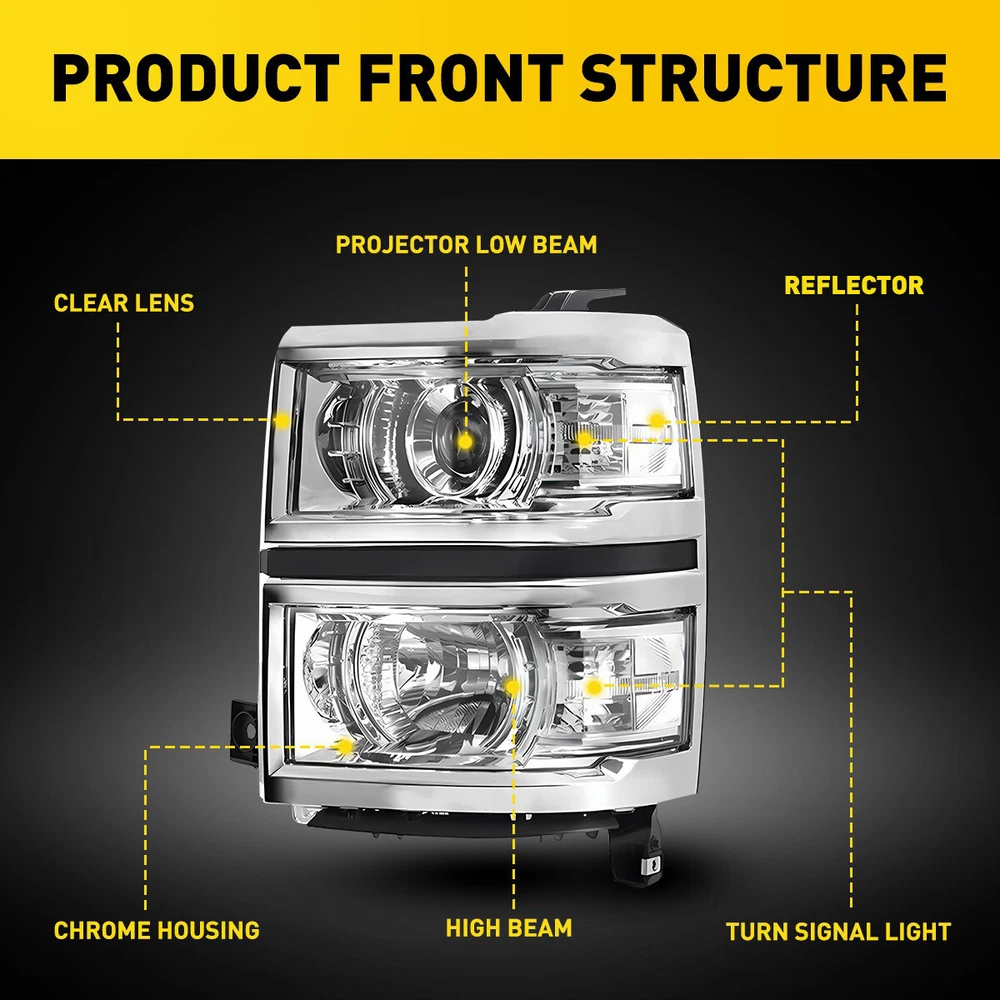Fit for: 2014-2015 Chevy Silverado 1500 models only (Fit 2014 New Body style models only; Does NOT fit HD models) Specifications: OE number: 20933724, 20933725, 20933722, 20933723, 23172782, 23172783 GM2502389, GM2503389, GM2502395, GM2503395, GM2502410 Material: ABS+PC (ABS Plastic Housing/Polycarbonate lens) Appearance color: 1.Housing Color: Chrome 2.Lens Color: Clear 3.Reflector Color: White Note: Projector √ (include) DRL × (Not include) Bulb × (Not include) Features: *Easy to install: For 14-15 Chevy Silverado 1500 Projector White Chrome Housing Corner Headlights Fit for: 2014-2015 Chevy Silverado 1500 models only (Fit 2014 New Body style models only; Does NOT fit HD models) Specifications: OE number: 20933724, 20933725, 20933722, 20933723, 23172782, 23172783 GM2502389, GM2503389, GM2502395, GM2503395, GM2502410 Material: ABS+PC (ABS Plastic Housing/Polycarbonate lens) Appearance color: 1.Housing Color: Chrome 2.Lens Color: Clear 3.Reflector Color: White Note: Projector √ (include) DRL × (Not include) Bulb × (Not include) Features: *Easy to install: Direct replacement, drilling and cutting are not required. *Superior quality: Made of ABS and PC materials with toughness and heat resistance functions to ensure its long service life and durability. *Angle adjustment: Equipped with a headlamp Angle adjustment knob, you can adjust the best Angle of view through the knob. *Suggestion: 1.Please confirm the OE number before purchasing!!! 2.Professional installation is required!!! Package Included: Headlights *2 (Left+Right) Item Specifics Brand AUXITO Type Headlight Assembly Placement on Vehicle Front,Left,Right OE/OEM Part Number 20933724, 20933725, 20933722, 20933723, 23172782, 23172783 Fitment for 2014-2015 Chevy Silverado 1500 models only Specifics Fit 2014 New Body style models only; Does NOT fit HD models Manufacturer Warranty 1 Year Universal Fitment No Interchange Part Number GM2502389, GM2503389, GM2502395, GM2503395, GM2502410 Fitment Type Direct Replacement Number of Pieces 2 Fit for 2014-2015 Chevy Silverado 1500 models only Fit for 1 2014 New Body style models only; Does NOT fit HD models Manufacturer Part Number 20933724, 20933725, 20933722, 20933723, 23172782, 23172783 Material ABS PC (ABS Plastic Housing/Polycarbonate lens) Housing Color Chrome Lens Color Clear Reflector Color White Note Projector √ (include) DRL (Not include) Bulb (Not include) Features *Easy to install *Superior quality *Angle adjustment Package Included Headlights *2 (Left Right) KEYWORD CHROME HOUSING Clear CORNER HEADLIGHT HEAD LAMPS KEYWORD 1 LH RH headlights Chrome White Projector KEYWORD 2 Chrome Housing Headlights Lamps Left Right Pairs 14-15 KEYWORD 2 Chrome Housing Headlights Lamps Left Right Pairs 14-15 Warranty 2 year Payment Returns DESCRIPTION PAYMENT SHIPPING RETURN POLICY CONTACT US Shop Category Store Home LED Headlight ◈ H4 ◈ H13 LED Reverse Light ◈ T15/921/W16W LED License Plate Light LED Side Marker Light Car Parts & Accessories Tail Light assemblies Other Hot Item REPLACEMENT Radio Touch-screen GLASS Digitizer LCD For Chevy GMC 15-18 MYLINK USD 32.99 New Fits 2013-20 Nissan Pathfinder Front Left & Right Outer Bumper Cover Bracket USD 17.99 10ft Seal Strip Trim For Car Front Rear Windshield Sunroof Weatherstrip Rubber USD 12.99 Fuel Gas Door Lock Cylinder & Keys For Toyota 1995-2004 Tacoma 2000-2003 Tundra USD 13.29 Ignition Control Module 4 Pin HEI Distributor for GM Chevy 1974-1988 Replacement USD 11.39 Picture New List Item Projector Headlights Fits 2010-2014 Subaru Legacy Outback Replacement Left+Right USD 145.99 Sun Visor Strip Windshield Vinyl Banner Long Lasting Red Decal 60x10'' USD 12.99 For 2012-15 Honda Civic Sedan 12-13 Coupe Black Clear Headlights Assembly USD 109.99 For 2003-2023 Chevy Express GMC Savana Headlights with Bumper Signal Lamps L+R USD 104.99 For 2001-2004 Toyota Tacoma Chrome Aamber Headlights Built In Corner Lamps 01-04 USD 75.99 Help & Info Payment Policy Shipping Policy Return Policy FAQ About Us For 14-15 Chevy Silverado 1500 Projector White Chrome Housing Corner Headlights Fit for: 2014-2015 Chevy Silverado 1500 models only (Fit 2014 New Body style models only; Does NOT fit HD models) Specifications: OE number: 20933724, 20933725, 20933722, 20933723, 23172782, 23172783 GM2502389, GM2503389, GM2502395, GM2503395, GM2502410 Material: ABS+PC (ABS Plastic Housing/Polycarbonate lens) Appearance color: 1.Housing Color: Chrome 2.Lens Color: Clear 3.Reflector Color: White Note: Projector √ (include) DRL × (Not include) Bulb × (Not include) Features: *Easy to install: Direct replacement, drilling and cutting are not required. *Superior quality: Made of ABS and PC materials with toughness and heat resistance functions to ensure its long service life and durability. *Angle adjustment: Equipped with a headlamp Angle adjustment knob, you can adjust the best Angle of view through the knob. *Suggestion: 1.Please confirm the OE number before purchasing!!! 2.Professional installation is required!!! Package Included: Headlights *2 (Left+Right) Payment Returns All rights reserved. On Dec 13, 2024 at 18:08:33 PST, seller added the following information: