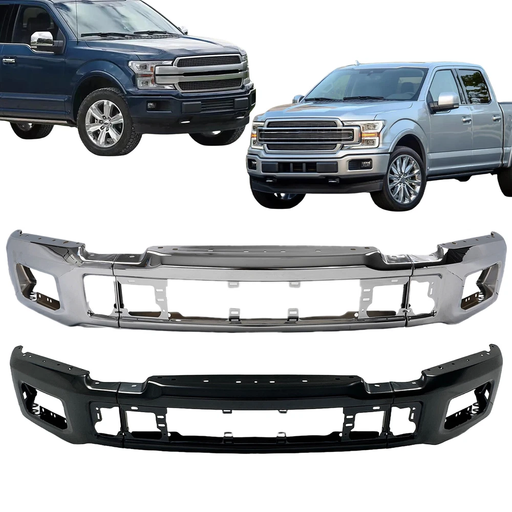 For 18-20 Ford F-150 Steel Front Bumper Face Bar w/ Fog Light Hole Black/Chrome