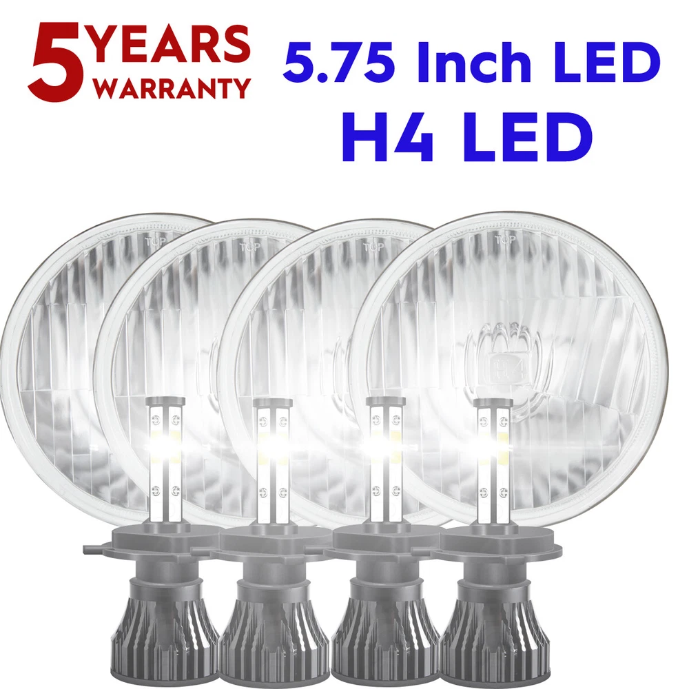 5-3/4"5.75 Round Stock Style H4 Conversion Headlights with Super Bright White LED Light Bulbs. Keep the Classic Look with Modern Light Brightness! Plug And Play! This listing is for a new set of 5 3/4" stock style glass lens - metal back headlight bulbs. This set includes (4) low/high beam headlights with high intensity LED light bulbs (no wiring or bucket modification needed). These have the original shaped prongs on the back so they will plug right into your original wiring harness plugs. These will fit any car or truck that has 4 round glass headlights. Will fit into stock buckets. Each bulb is 5 3/4 inches in diameter. These are glass and we will take extra care in packaging. Product Features: Dimension: 5.75 inch Housing Color:Black LED Type: White Material: Aluminum Housing, PMMA Lens Voltage: 10V-30V DC Color Temperature: 6000K Working Temperature: -40°C- 85°C Waterproof Protection: IP67 Interchange: H5009 / H5006 / H5506 / H5001 / 4001 Specification: 100% Brand New in the box with manufacturer packaging, never been installed before. LED LIGHT BULB Specifications and Features: Product Name: LED Headlight Bulbs Luminous flux: 10000LM Working voltage: DC9-32V IP rate: IP67 Wattage:55W Connector: H4 / 9003 (Low Beam and High Beam) Life Span: Above 50,000 Hours Color temperature: pure white 6000K Materia:Aviation aluminum profile Package Included: 4pcs 5.75" 5-3/4" headlight Housing 4pcs H4/9003 High & Low Beam LED Bulbs Note: 1. Please check the size of your bulbs on your vehicle before purchasing. 2. Please make sure the headlight housing has enough space for installation before purchasing.