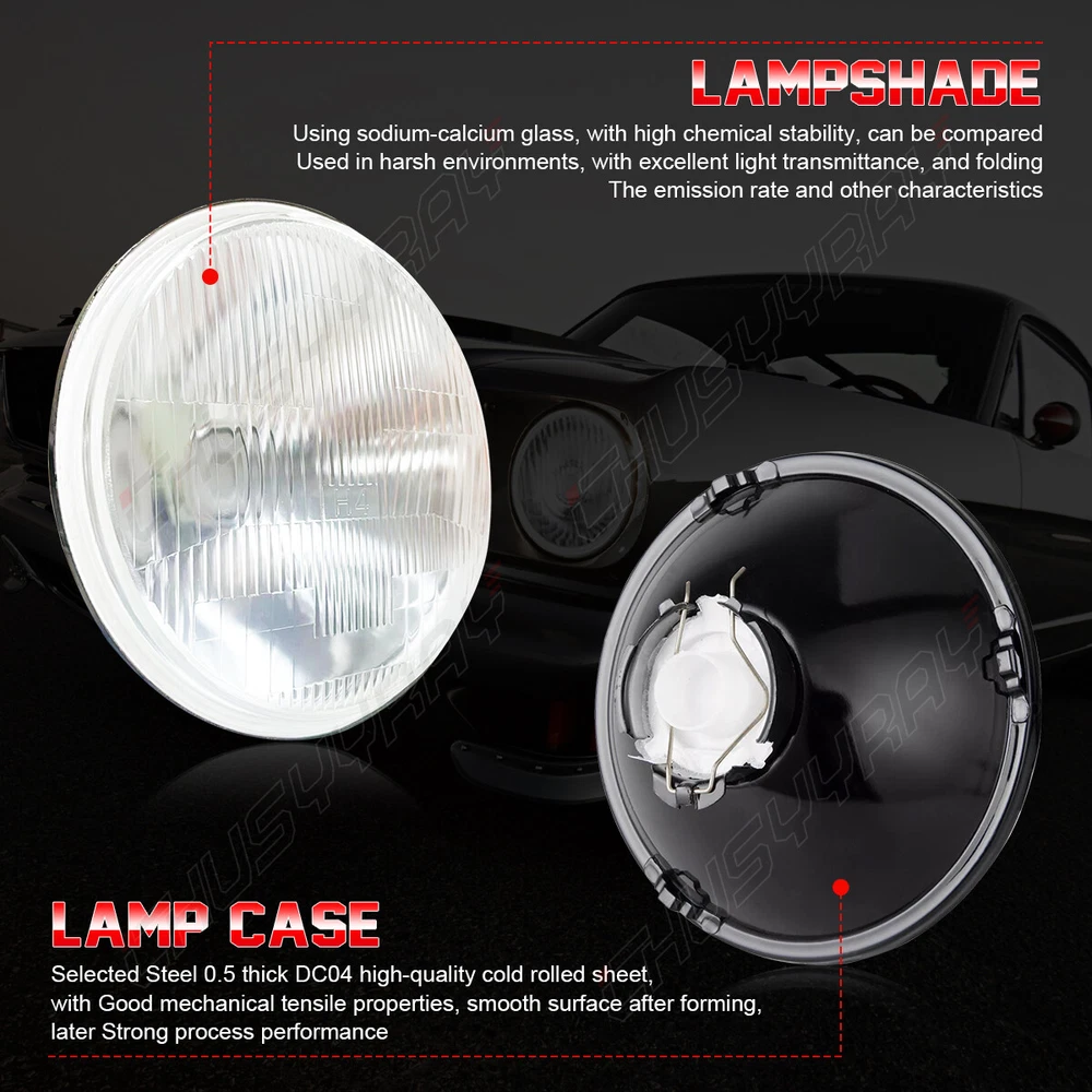 THESE ARE STOCK STYLE GLASS FACED / METAL BACKED HEADLIGHTS! INCLUDES (2) HIGH INTENSITY LED H4 6000K WHITE LIGHT BULBS! PAIR- 7" Stock Style H4 Headlights Glass Lens / Metal Backside High Intensity LED Bulbs Low And High Beam Functions (2) Low Beam / High Beam Headlights No Modifications Needed - Plug And Play Part Number Interchange: H6006 / 6006 For 12-Volt Systems Only DOT SAE Approved This listing is for a pair of new 7" stock style glass lens - metal back headlight bulbs. This set includes (2) low / high beam headlights with high intensity 6v LED light bulbs (no wiring or bucket modification needed). These have the original shaped prongs on the back so they will plug right into your original wiring harness plugs. These will fit any car or truck that has 2 round glass headlights & will fit into stock buckets. Each bulb is 7 inches in diameter. These are glass and we will take extra care in packaging. DOT SAE Approved INTERCHANGE: H6006 / 6006 All-In-One H4 6v LED Headlight Bulbs: 4,000 Lumen Bulbs - PAIR 4,000 LUMENS PER BULB! The LED conversion kit to rival HID power is finally here! The LED 12V conversion kits come in all different headlight and fog light bulb styles. Not only are the new LED conversion kits as bright as an HID system, but the new design from chusyyray, does not require a relay or harness or special drivers. The LED conversion kits from have the driver built in to the bulb, which means there are no external parts to mount or plug in, just replace your old halogen bulbs with the new ones and plug them in like the originals. The new u6s LED conversion kits from are the brightest on the market! Each dual beam 12v LED bulb produces 2,600 Lumens of light and draws 26 watts of energy on the low beam setting; but produces 4,000 Lumens of light and draws 40 watts of energy on the high beam setting. LED LIGHT BULB Specifications and Features: 2,600 Lumens Low Beam / 4,000 Lumens High Beam Light Output Per Bulb 360 Degree Light Beam Angle 26 Watts Low Beam / 40 Watts High Beam Energy Usage Per Bulb LED Light Color: 6,000K Weatherproof Rating: IP67 Waterproof Ball-Bearing Fan for Cooling Newest Technology All-In-One Design: No Ballast or Driver Required LED Protection Circuit to Protect from Reverse Polarity, Low Voltage or High Voltage Spikes Smart & Efficient Cooling System Uses Built-In Cooling Fan Greater Visibility - 3x Brighter than Factory Halogen Bulbs Voltage: 12-Volt High Quality Aluminum Heat Sink Ensures Proper Temperature Regulation Lower Power Consumption than Halogen Bulbs Vibration Proof Design 50,000 Hour Lifespan Easy Plug & Play Installation - No Modification Required No Splicing of Harnesses Required for LED Bulbs Uses 75% LESS Power than Halogen or HID Bulbs 3x Brighter than Stock Halogen Bulbs Dramatically Improves Visibility at Nigh