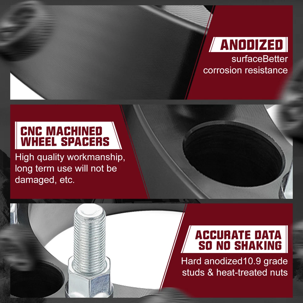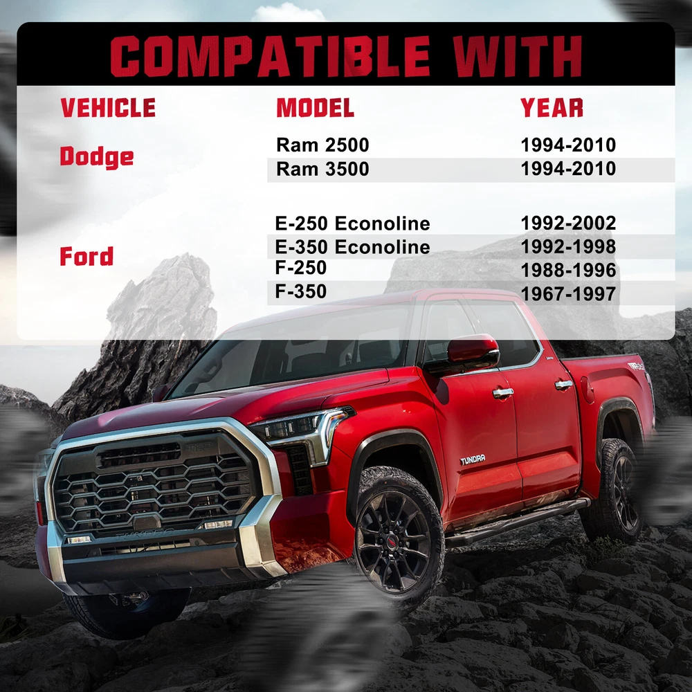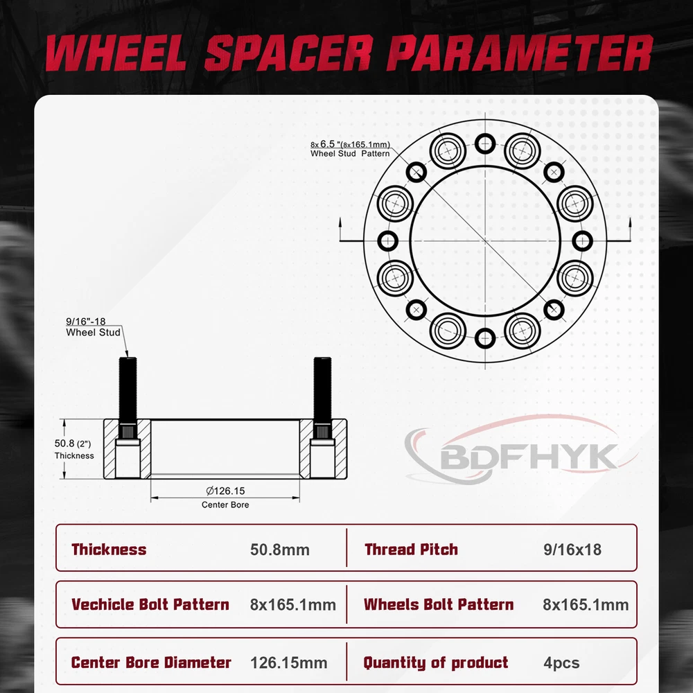Wheel Spacer Specs: Thickness: 2" (50.8mm) Bolt Pattern: 8x6.5" (8x165.1mm) Hub/Center Bore: 126.15mm Stud/Nut Thread Pitch: M9/16x18 Studs: 12.9 Grade, stronger than 10.9 Grade Material: 6061-T6 Aerospace Grade Aluminum Fitment: For Dodge: For Dodge Ram 2500 1994-2010 For Dodge Ram 3500 1994-2010 For Ford: For Ford E-250 2003-2013 For Ford E-250 Econoline 1992-2002 For Ford E-350 Econoline 1992-2000 For Ford F-250 1988-1998 For Ford F-350 1988-1997 Ram: Ram 2500 2011 Ram 3500 2011 Package Includes: 4x Wheel Adapters Wheel Spacer Specs: Thickness: 2" (50.8mm) Bolt Pattern: 8x6.5" (8x165.1mm) Hub/Center Bore: 126.15mm Stud/Nut Thread Pitch: M9/16x18 Studs: 12.9 Grade, stronger than 10.9 Grade Material: 6061-T6 Aerospace Grade Aluminum Fitment: For Dodge: For Dodge Ram 2500 1994-2010 For Dodge Ram 3500 1994-2010 For Ford: For Ford E-250 2003-2013 For Ford E-250 Econoline 1992-2002 For Ford E-350 Econoline 1992-2000 For Ford F-250 1988-1998 For Ford F-350 1988-1997 Ram: Ram 2500 2011 Ram 3500 2011 Package Includes: 4x Wheel Adapters