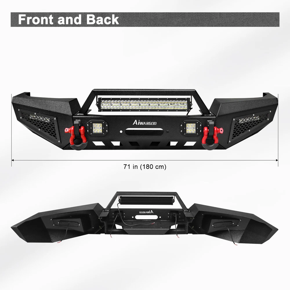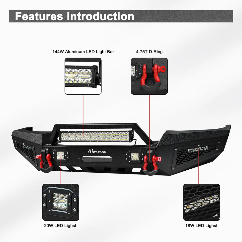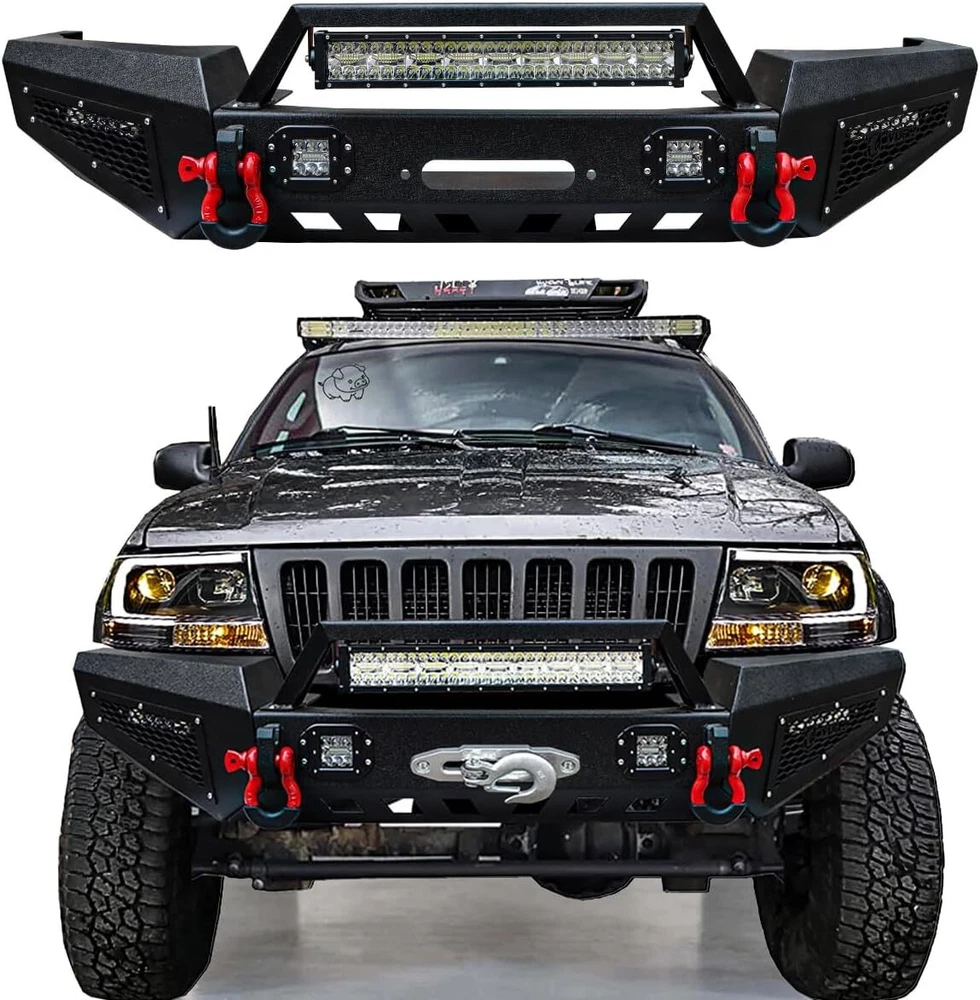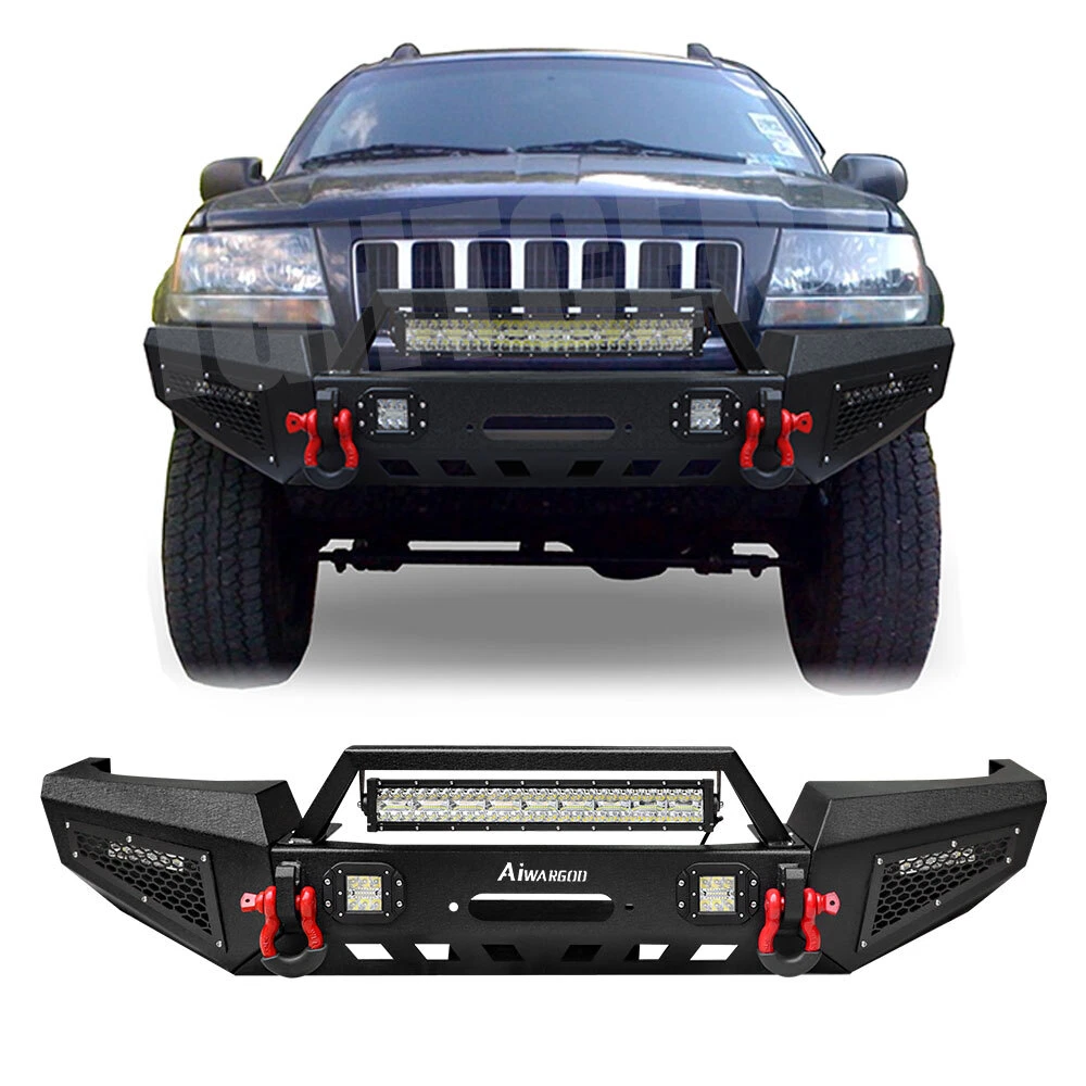 gtin13:Does not applyMaterial:Stainless SteelFitment:for 1999-2004 Jeep Grand Cherokee WJStyle:Perfect for Off-Roading ProtectionManufacturer Part Number:Does Not ApplyType:Bumper ProtectorPlacement on Vehicle:FrontUPC:Does not applyFitment Type:Direct ReplacementFinish:Powder CoatedBrand:AaiwaManufacturer Warranty:3 YearsConstruction:Heavy Duty High Tensile SteelBumper Cut-out:Towing Hitch Cut-outPackage Included:Front Bumper & Led lights & D-ringsColor:BlackFeatures:Mounting Hardware Included, Led Lights & D-rings IncludedOE Spec or Performance/Custom:Performance/Custom