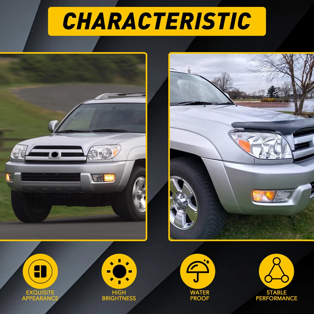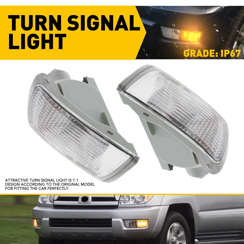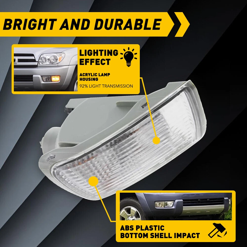 Fit for: Toyota 2003-2005 4Runner (submodel: Limited, Sport, SR5) Specifications: OE Number: 8151135411, TO2533112, 8152135401, TO2532112 Product Material: ABS Lens Color: Clear Waterproof Grade: IP67 Lifespan: 50,000h+ Features: *Exquisite Appearance Attractive turn signal light is 1:1 design according to the original model for fitting the car perfectly. *High Brightness This turn signal light is designed for visually striking and visibility enhancing. *Water-Proof Ultrasonically sealed provides IP67 waterproof grade, good sealing and stronger waterproof ability to ensure your driving safety. For 2003-2005 Toyota 4Runner Clear Front Corner Parking Turn Signal Light Covers Fit for: Toyota 2003-2005 4Runner (submodel: Limited, Sport, SR5) Specifications: OE Number: 8151135411, TO2533112, 8152135401, TO2532112 Product Material: ABS Lens Color: Clear Waterproof Grade: IP67 Lifespan: 50,000h+ Features: *Exquisite Appearance Attractive turn signal light is 1:1 design according to the original model for fitting the car perfectly. *High Brightness This turn signal light is designed for visually striking and visibility enhancing. *Water-Proof Ultrasonically sealed provides IP67 waterproof grade, good sealing and stronger waterproof ability to ensure your driving safety. *Stable Performance Longer service life (more than 50,000 hours) with friendly customer support for bringing you satisfied shopping experience. *Less Consumption Better energy-saving, better environmental protection. Note: In order to ensure the item fit your vehicle properly, please check and confirm the model before purchasing. Packaging Include: 2*Turn signal light (with halogen bulbs) Item Specifics Anticipated Ship Out Time Same day - 1 business day Brand AUXITO Bundle Listing Yes California Prop 65 Warning
