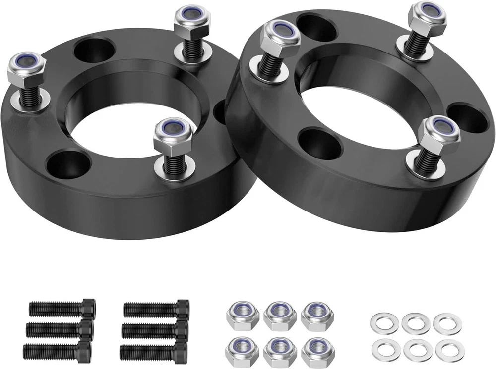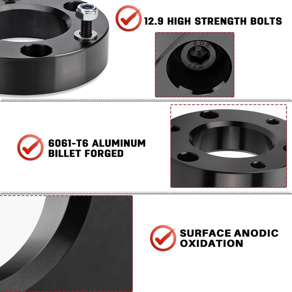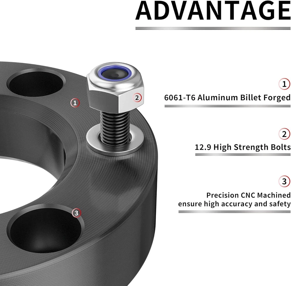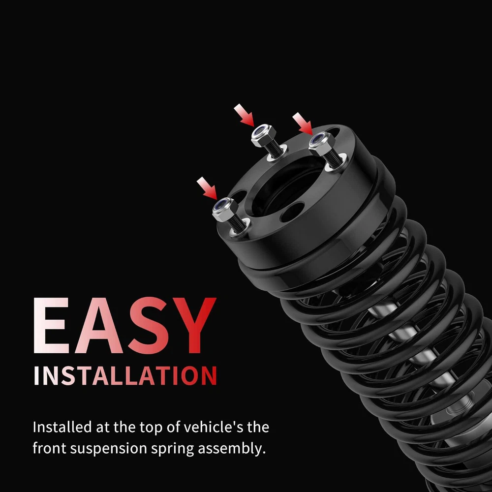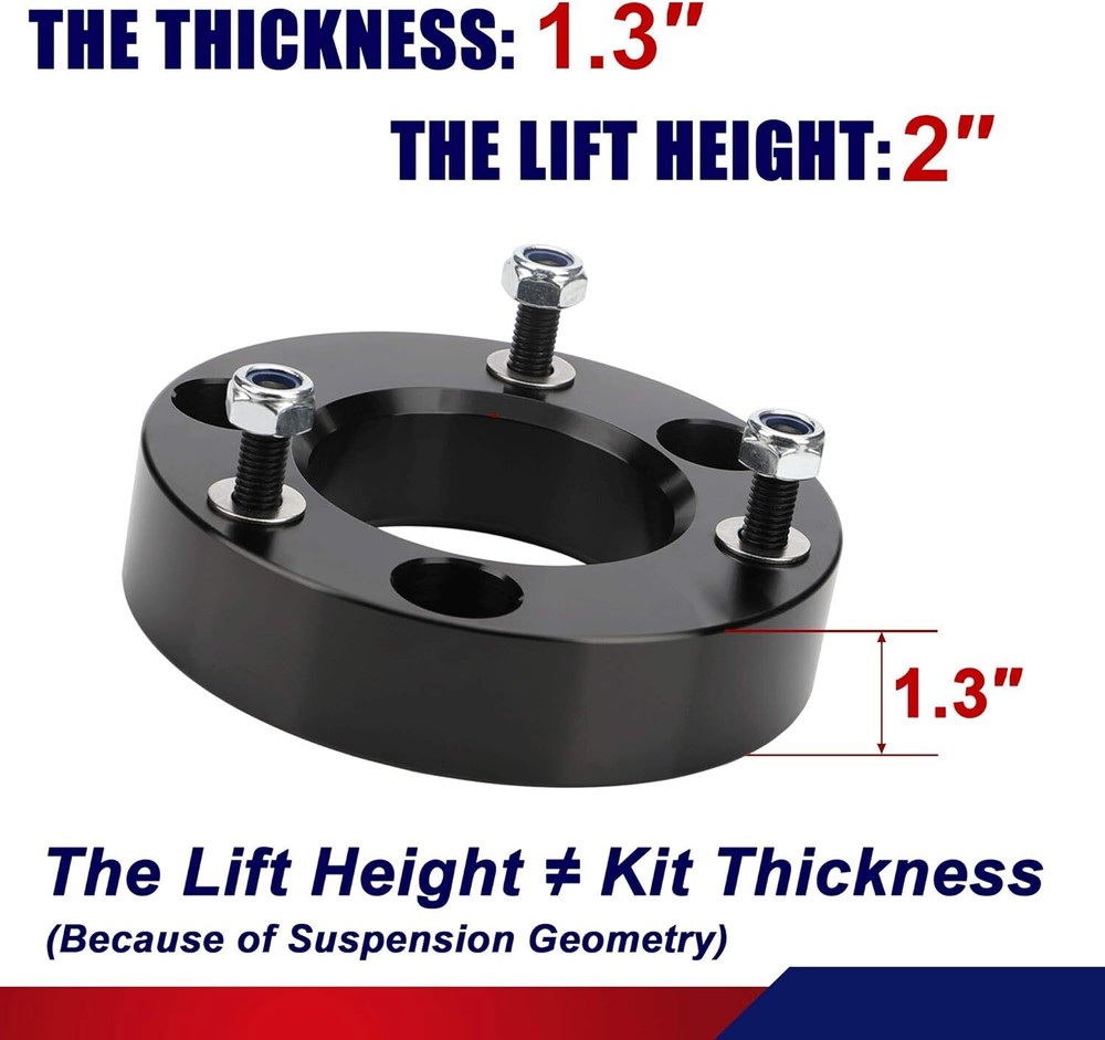 Compatibility: For 2004-2023 FORD F150 2WD/4WD; 2003 - 2018 Expedition; 2005 - 2008 Lincoln Mark LT. Attention: Will Raise your truck 2" in the front. Due to suspension geometry, the ratio between lift height and kit thickness is not 1:1. An alignment is always recommended after installing. Safety: Even in extreme riding conditions, the leveling kits also provide safe driving due to forged from aircraft-grade aluminum billet, 12.9 grade solid bolts.Black andoized surface offers better corrosion resistance. Easy to install, only take 1-2 hours. Aggressive Look: Give your car an aggressive look and offers extra ground clearance to use larger tires/rims. Compatible with various crazy off-road model. Easy installation and no special tools needed. Compatible with: For 2004-2023 F150 2wd/4wd; 2003 - 2018 Ford Expedition; 2005 - 2008 Lincoln Mark Lt Please Note: Lift Spacer Thickness and Lift Is Not a 1 to 1 Ratio Due to the Suspension Geometry. Material:high Quality 6061 Billet Aluminum Colour: Black Lifting Height 2 Inch Package Include: 2 x Front Lift Kit