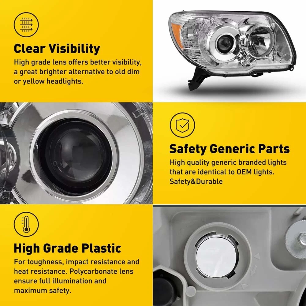 Fit for: 2006-2009 Toyota 4Runner Specifications: OE number: 8117035420, 8117035421, 8113035440, 8113035441, 8117035451, 8113035471 TO2502164, TO2503164, TO2502165, TO2503165 Material: ABS+PC (ABS Plastic Housing/Polycarbonate lens) Appearance color: 1.Housing Color:Chrome 2.Lens Color:Clear 3.Reflector Color:Amber Note: Projector √(Include) DRL × (Not include) Bulb × (Not include) Features: *Easy to install: Direct replacement, drilling and cutting are not required. *Superior quality: For 2006-2009 Toyota 4Runner Clear Lens Chrome Headlights Pair Amber Reflector P Fit for: 2006-2009 Toyota 4Runner Specifications: OE number: 8117035420, 8117035421, 8113035440, 8113035441, 8117035451, 8113035471 TO2502164, TO2503164, TO2502165, TO2503165 Material: ABS+PC (ABS Plastic Housing/Polycarbonate lens) Appearance color: 1.Housing Color:Chrome 2.Lens Color:Clear 3.Reflector Color:Amber Note: Projector √(Include) DRL × (Not include) Bulb × (Not include) Features: *Easy to install: Direct replacement, drilling and cutting are not required. *Superior quality: Made of ABS and PC materials with toughness and heat resistance functions to ensure its long service life and durability. *Angle adjustment: Equipped with a headlamp Angle adjustment knob, you can adjust the best Angle of view through the knob. *Suggestion: 1.Please confirm the OE number before purchasing!!! 2.Professional installation is required!!! Packaging include: Headlights*2(Left+Right) Item Specifics Brand AUXITO Placement on Vehicle Left Right Front Housing Color Chrome Lens Color Clear Interchange Part Number 8113035471 8117035451 8113035441 8117035421 California Prop 65 Warning This product contains chemicals known to the State Sku DDZC-4RUNNER-06-09-CA Package Include Driver Side & Passenger Side [Headlight] Bulb Reuse Stock Low Beam H11/ High Beam 9005 Bulbs SAE DOT Compliant Yes Lens Heavy Duty Polycarbonate Dust and Moisture Protection Yes Return Free Return Shipping on damaged or defective items Headlight Style Factory Assembly Type Composite Lighting Technology Halogen Fitment Type Direct Replacement Number of Bulbs 0 Type Headlight Assembly Features Reflector Housing OE/OEM Part Number 8117035421, 8113035440, 8113035441, 8117035451, 8113035471 Manufacturer Warranty 1 Year Superseded Part Number TO2502164, TO2503164, TO2502165, TO2503165 Payment 1. We can only accept payment from PayPal. 2. Please keep the consistency of Paypal address and ebay address. Shipping 1. All items will be shipped in 12 hours after receiving your payment . 2. We ship this item to US only via USPS first class mail. It usually takes 3-5 working days to deliver. Returns 1. We offer 30 days return policy. 2. Please contact us within 30 days from the date you receive your package if you have any questions with the products . 3. Refund will be sent after we got your returned package. 4. All returned items should be in the original packaging with tracking number. Contact Us We work from Monday - Saturday 9:00AM - 6:00PM, but we will reply once we get your message. There will be delay on response if you send message or E-Mail on Sunday. DESCRIPTION PAYMENT SHIPPING RETURN POLICY CONTACT US Shop Category Store Home Other Hot Item Door Latch Cables LH+RH Front For 2007-2013 Chevy Silverado 1500 2500 HD 3500 HD USD 17.99 1set Control Knob Speed Fan Heater A/C For Jeep Wrangler TJ 99-06 5011218AA USD 9.99 For 2002-2008 Dodge Chrysler Stereo Car Radio Wiring Harness Adapter USD 11.59 Rear Left or Right Outside Door Handle for 2010-2016 Toyota 4Runner Lexus GX460 USD 14.99 Universal Car Windshield Wiper Squirter Washer Nozzle Spray Jet Kit Fluid Hose T USD 9.99 New List Item Front LH/RH Side Door Exterior Handle For Ford 2001-07 Escape Mazda 01-06 Tribut USD 12.82 2PCS Camshaft Position Sensor for Dodge Caliber Journey Avenger Jeep Chrysler PU USD 18.99 For 2005-2008 Dodge 2007-2009 Magnum Dodge Nitro Windshield Wiper Arm Rear USD 11.39 4PCs 2010-2015 Chevy Camaro White LED Side Marker Light Clear Housing Lamp SET USD 31.15 FOR 2016-2020 HONDA CIVIC RH POWERED PASSENGER RIGHT SIDE DOOR MIRROR HO1321283 USD 73.14 Excellent Delivery For 2006-2009 Toyota 4Runner Clear Lens Chrome Headlights Pair Amber Reflector P Fit for: 2006-2009 Toyota 4Runner Specifications: OE number: 8117035420, 8117035421, 8113035440, 8113035441, 8117035451, 8113035471 TO2502164, TO2503164, TO2502165, TO2503165 Material: ABS+PC (ABS Plastic Housing/Polycarbonate lens) Appearance color: 1.Housing Color:Chrome 2.Lens Color:Clear 3.Reflector Color:Amber Note: Projector √(Include) DRL × (Not include) Bulb × (Not include) Features: *Easy to install: Direct replacement, drilling and cutting are not required. *Superior quality: Made of ABS and PC materials with toughness and heat resistance functions to ensure its long service life and durability. *Angle adjustment: Equipped with a headlamp Angle adjustment knob, you can adjust the best Angle of view through the knob. *Suggestion: 1.Please confirm the OE number before purchasing!!! 2.Professional installation is required!!! Packaging include: Headlights*2(Left+Right) Payment Shipping Returns Contact Us 1. We can only accept payment from PayPal. 2. Please keep the consistency of Paypal address and ebay address. 1. All items will be shipped in 12 hours after receiving your payment . 2. We ship this item to US only via USPS first class mail. It usually takes 3-5 working days to deliver. 1. We offer 30 days return policy. 2. Please contact us within 30 days from the date you receive your package if you have any questions with the products . 3. Refund will be sent after we got your returned package. 4. All returned items should be in the original packaging with tracking number. We work from Monday - Saturday 9:00AM - 6:00PM, but we will reply once we get your message. There will be delay on response if you send message or E-Mail on Sunday. All rights reserved. On Dec 4, 2024 at 04:23:14 PST, seller added the following information: