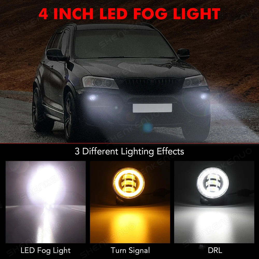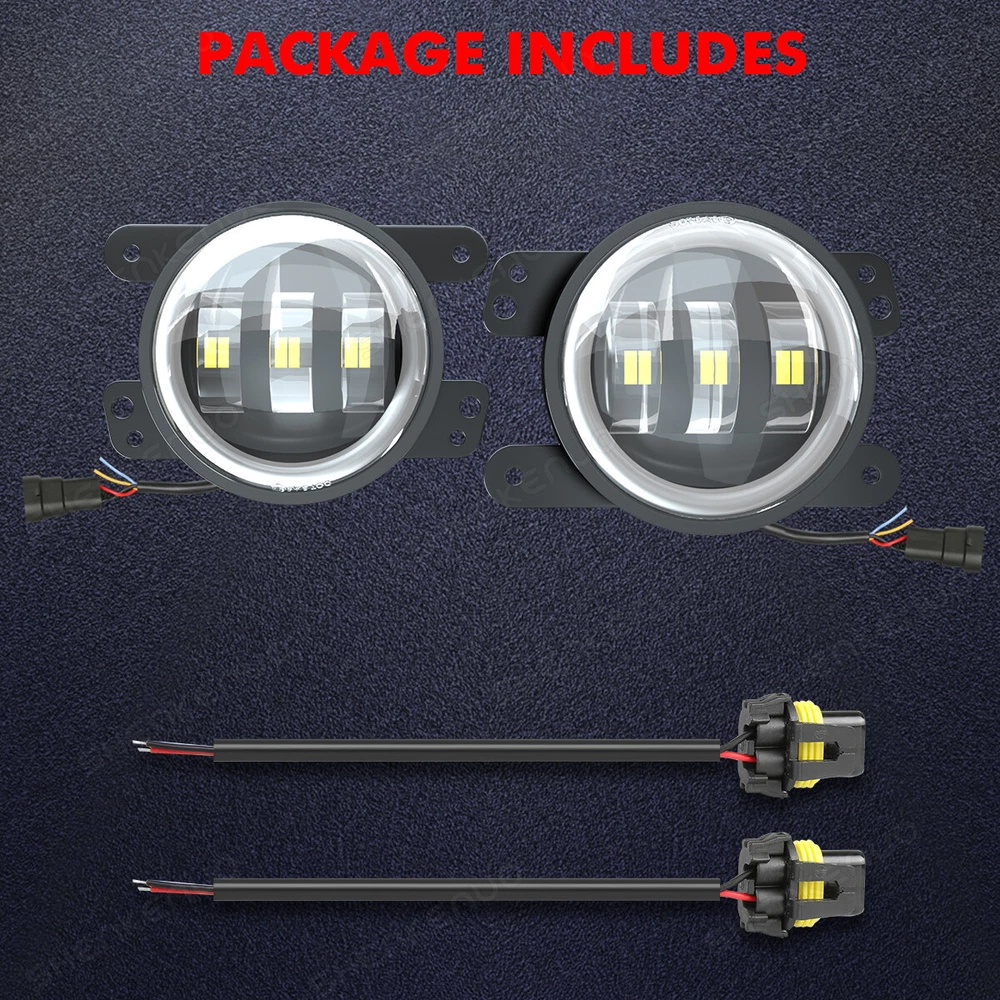 Notice: 1. Please check whether it is fit for your vehicle before purchase. 2.Please allow 0.5-1 inch difference due to manual measurement.(1inch=2.54cm) 3.Due to the light and shooting angle, pictures may have slightly chromatic aberration. 4.If yours are 5202/H16/9008/2504/PSX24W(eg:2010 and up Jeep Wrangler JK), please purchase extra adapter. Pair 4" Inch 30W Round LED Fog Lights Driving Lamps IP65 Application: The light can be used as car fog lamp,motorcycle headlamp,machineshop truck working light,off-road vehicle spot light,the light of bank board,agricultural truck, the spot light of mines enterprise,the spot light of billboard,the indicator light of high building and airport. Specification: Model: 4"inch fog light Operating Voltage:10-30V DC Power: 40W( 6pcs*5W + Halo Ring 10W )(Spod Beam) Luminous flux: 4300lm Waterproof: IP66 Bulb Type: LED Color Temperature: 3000K Amber/6000K White Halo Ring Material: Aluminum Housing, PC Lens, Stainless Mounting Bracket Surface Color: Black Life-span: 50000+hours Size: approx. 4" x 4" x 3.3"(100mm x 100mm x 83mm) Qty: 2pcs Wiring Connection: Black Wire : Negative Red Wire : Fog Light Yellow Wire: Amber Turn Light White Wire: White DRL Features: High quality and weatherproof material. Super bright,faster on/off response time for driving safety. Simple design,enhance your car's exterior look. Package Included: 2 x Front Bumper Fog Lights (Installation instruction is NOT included) Features: -- Super energy saving: 60% lower than normal energy consumption (low energy consumption means low fuel consumption) -- High brightness: brightness is 3 times of halogen lamp -- Long life: the advanced LED exceeds the ordinary bulb, and its life is more than 50000 hours -- Aluminum alloy shell, shockproof and waterproof function is better. -- Light sense: the light is softer to prevent dazzle. -- Waterproof and anti-corrosion: it can be used in heavy rain or harsh environment. -- Wide working voltage range: it can be used in different types of vehicles On Dec 27, 2024 at 23:48:09 PST, seller added the following information:
