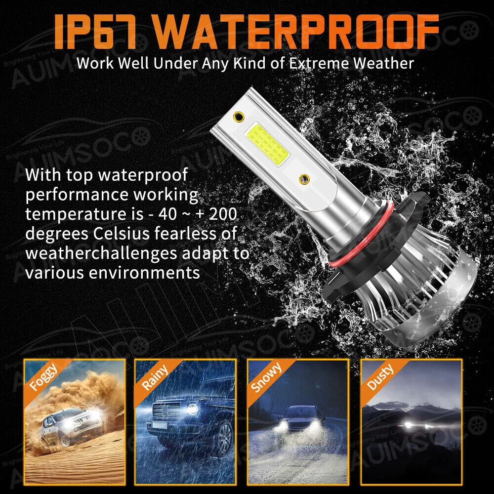 Description: AUIMSOCO LED Headlight Bulb Conversion Kit Upgrade Version 9005/HB3 High Beam + H11 Low Beam Replace Halogen Bulb Specifications: Plug Type: 9005 (High Beam) + H11 (Low Beam) Color Temperature: 6500K -Cold White Headlight Wattage: 40 W/Per Pair Headlight Lumens: 4000LM / Per Pair Working Voltage: DC 9V to 36V Material: Aviation 6063 Aluminum Pprofile Waterproof Level: IP68 Lifespan: > 50,000 Hours Fog Light Specification: Bulb Size: H11 Usage: LED Fog Light Voltage: DC 12V-24V Power: 30W/per pair Lumen: 3000LM/per pair Color Temperature: 6000K Cold White LED Chips: AUIMSOCO customized LED chips Material: Heatsink aluminum shell Fanless: yes, no noise Lifespan: 50,000 hours Waterproof Rate: IP68 Warranty: 1 years warranty Automotive LED Bulbs advantages: 1. AUIMSOCO LED lights than traditional halogen energy, more bright . High focus and max light output with a wider and farther lighting area, Safer Night Driving. 2. Xenon lamp brightness and proximity , but the LED lights light up without delay, to enhance road safety. Instant start no strong currents impact , effectively protecting the car comes with a battery , improving battery life of more than 30%. 3. Fast cooling , the appearance of the most advanced design , thermal structure ingenious and reasonable.Power driver with wide voltage constant current mode , the car can respond to a variety of voltage instability , the effective protection of normal use Led efficient and simple structure. 4. Heating temperature is low , protect the car . Xenon working temperature up to 800 ° -1000 ° , the main reason for the car ignition 5. LED car headlights simple structure, fewer parts than xenon lamps, significantly lower than the xenon lamp failure rates ! Package Includes: 1x Pair 9005/HB3 High Beam 1x Pair H11 Low Beam 1x Pair H11 Fog Lights Randomly send new and old packaging boxes Warm Tips: This model comes in multiple models, If you are not sure about the bulb size, please send us your vehicles' make/model/year via ebay message to confirm with us before purchasing. Any questions please feel free to contact us, we will help you solve it.