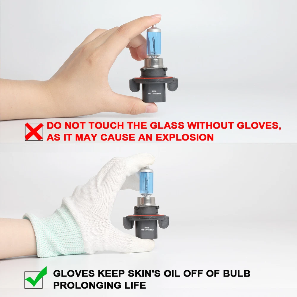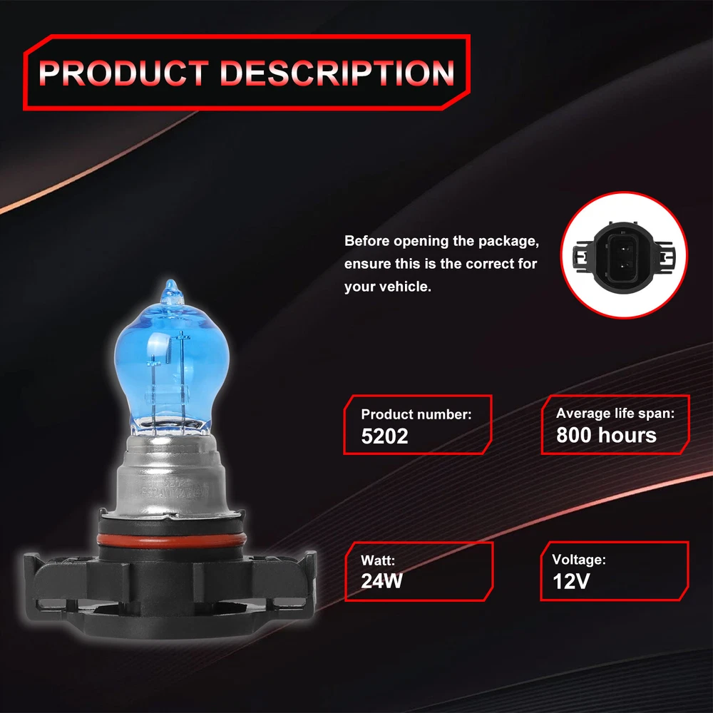 Specifications: • Bulb Socket: H13 9008 + 5202 2504 PS24W • Color Temperature: 4200K • Voltage(V): DC 12V • Working temperature: -40℃~+80℃ • Beam Angle: 360° • Waterproof Level: IP65 • Material: Aviation Aluminium • Super Long Service Life: ≥800 Hours • Warranty: 5 Year • Canbus Error Free: No. For most vehicles, just directly plug and play. Yet for some vehicles with CAN-BUS system, it may require install decoder or load resistor to avoid hyper flash or fast blinking. • Please Note: Please check your car manual or original bulb to confirm the bulb size, length is correct or not before purchasing to save your time. Package Included: • 2Pcs 9008/H13 Halogen Bulbs High Low Beam • 2Pcs 5202/PS24W Halogen Bulbs Fog Light (Random shipment of new and old packaging) Note: • Energy saving, environmental protection, Stable performance, through strict test, Use safer driving in the car • For most cars, just Plug-n-Play,no ballast required. Yet for some European vehicles or new vehicles, load resistors maybe required to avoid the error code or blinking. • When installing this bulb, please make sure to turn the car off, and key out. Bulbs are very easy to install. You just have to plug it in the socket. ( bulb has + AND -terminal. If it doesn't light up after inserting into the socket, all you need to do is insert it oppositely.) • The compatible vehicle list shows only partial cars due to the ebay limits, if your car plug is same with this bulb, the item will fit your car. • If you're not sure about it, please send us an ebay message and tell us your car year, make, model and the position you need to replace, we will help you check with it. • If you have a decoding problem or any other problems, please contact us first, we will help you with it. I'm a new seller, thanks a lot for your trust and convince! I will serve you with all my heart.